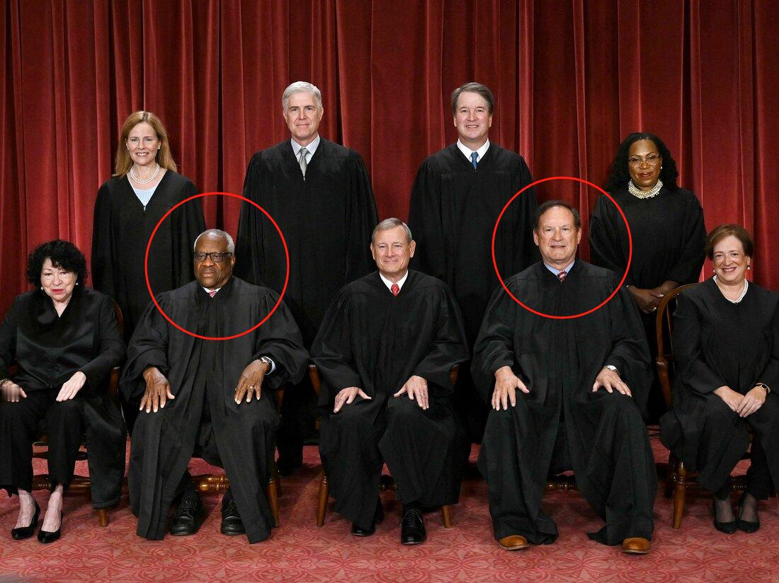托马斯法官和阿利托法官被视为法院中最保守的两位法官。两位法官都由共和党总统任命:托马斯法官是法院任职时间最长的成员,他于1991年由乔治·H·W·布什总统任命,而阿利托法官则是在2006年由乔治·W·布什总统任命,他还是2022年废除宪法性堕胎权的关键判决的主笔。