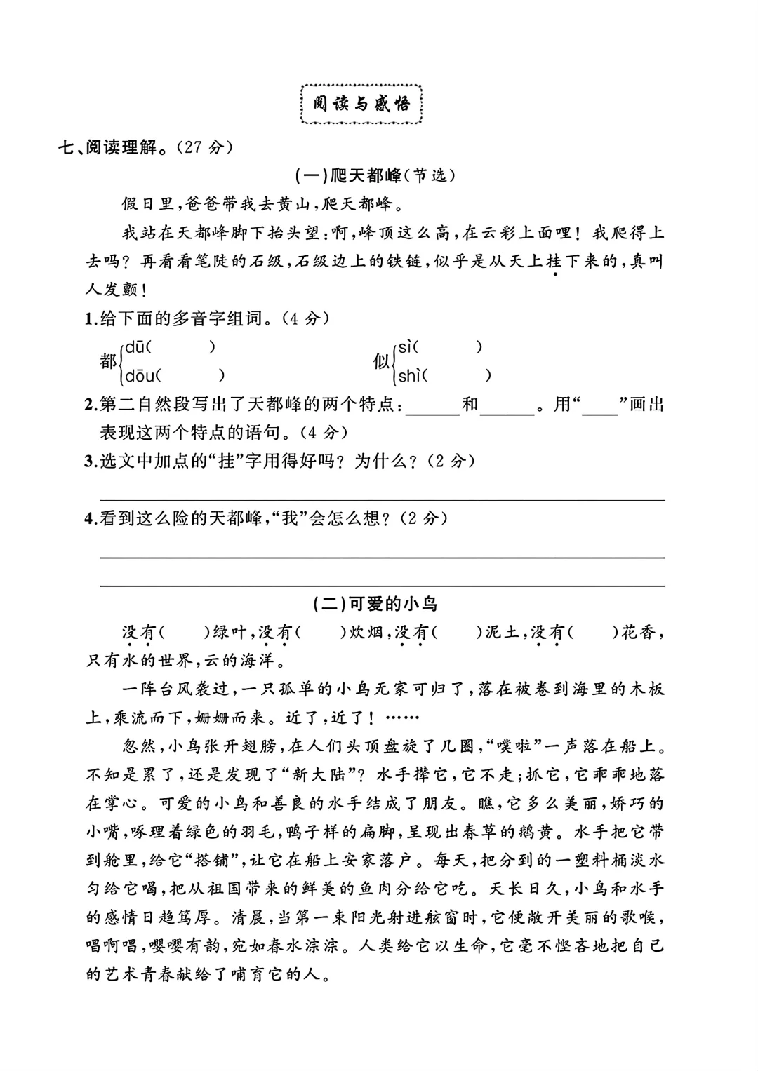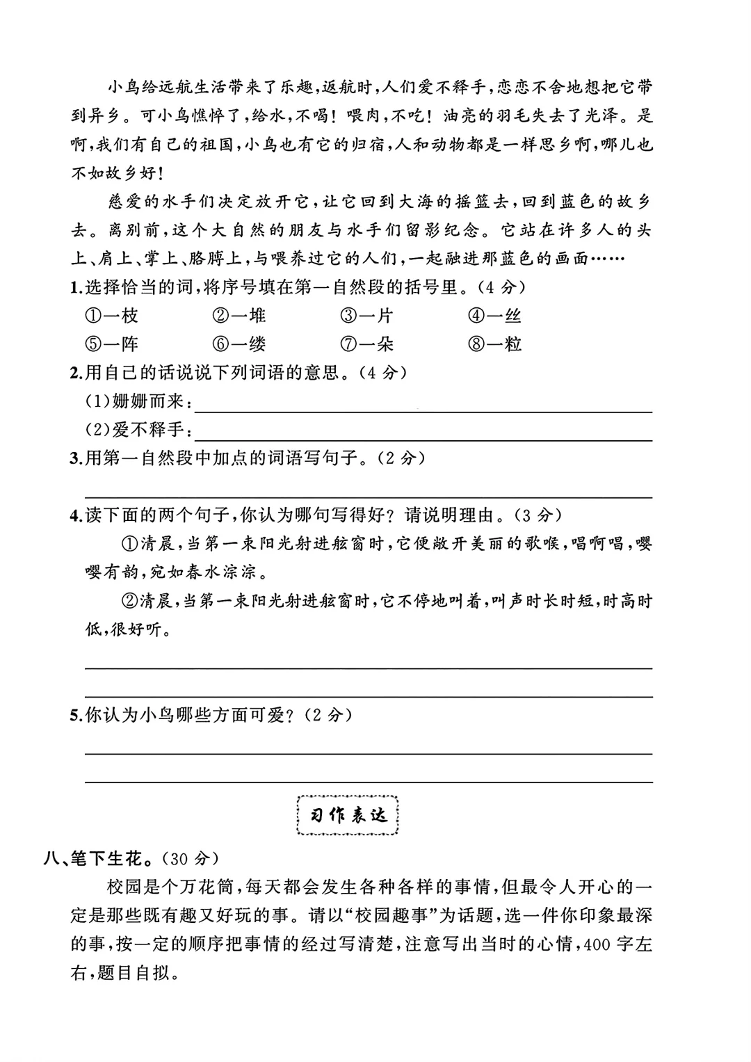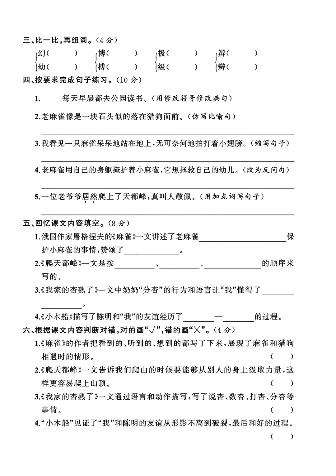 人教版 四年级上册语文 单元测试 第五单元 试卷 电子版可打印