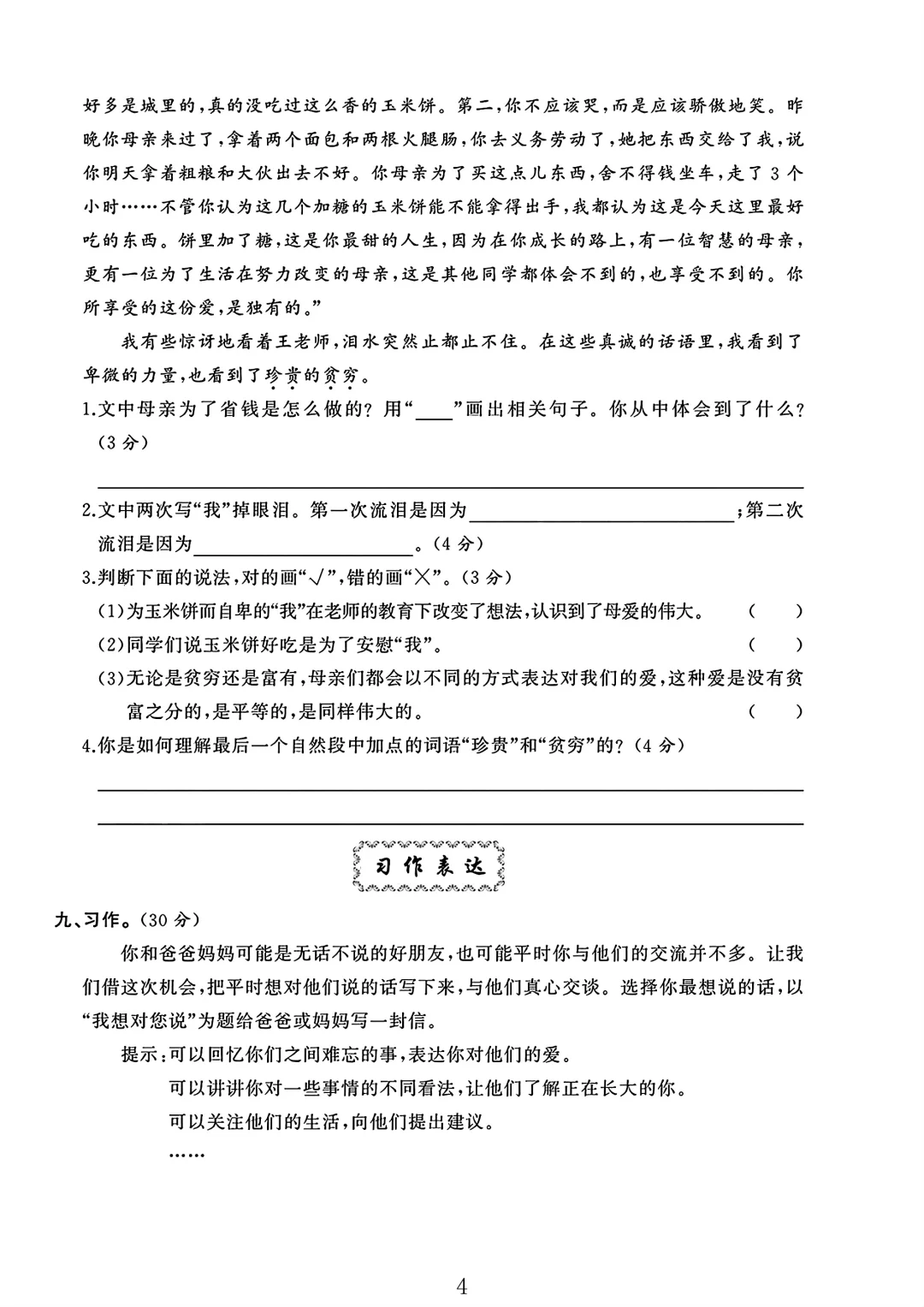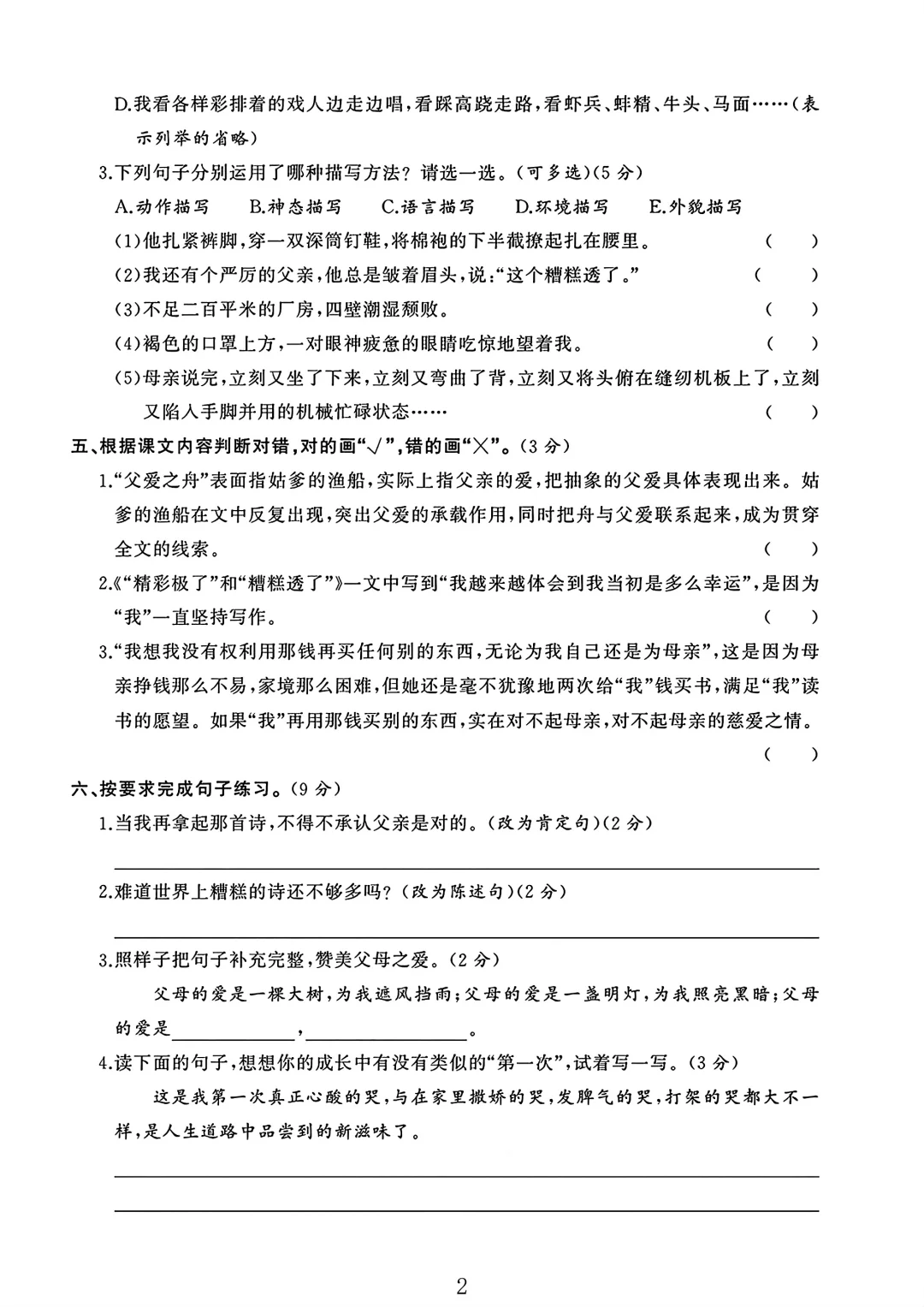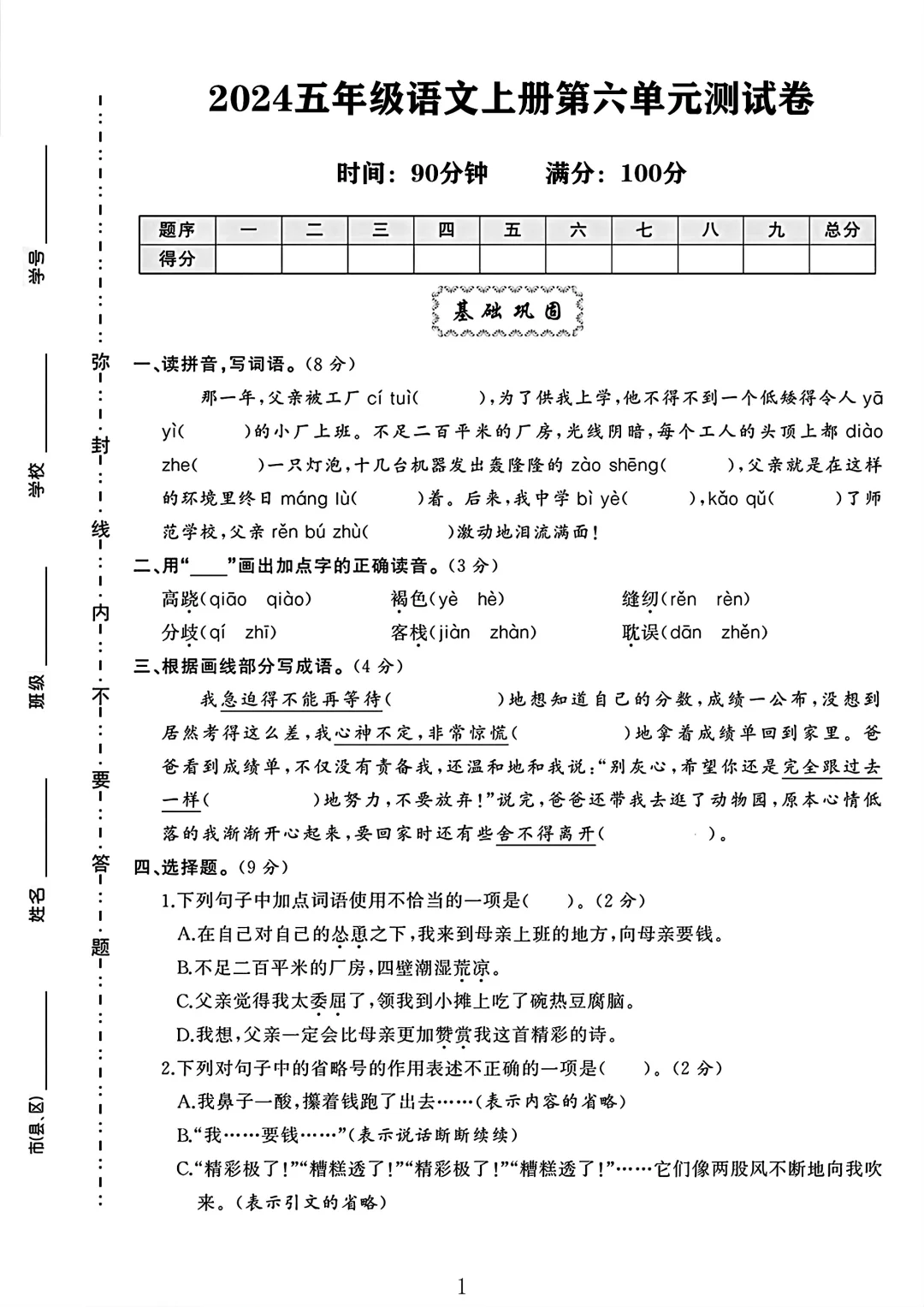 人教版 五年级上册语文 第六单元 试卷 单元测试 电子版可打印