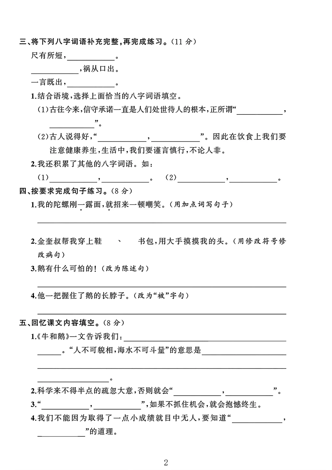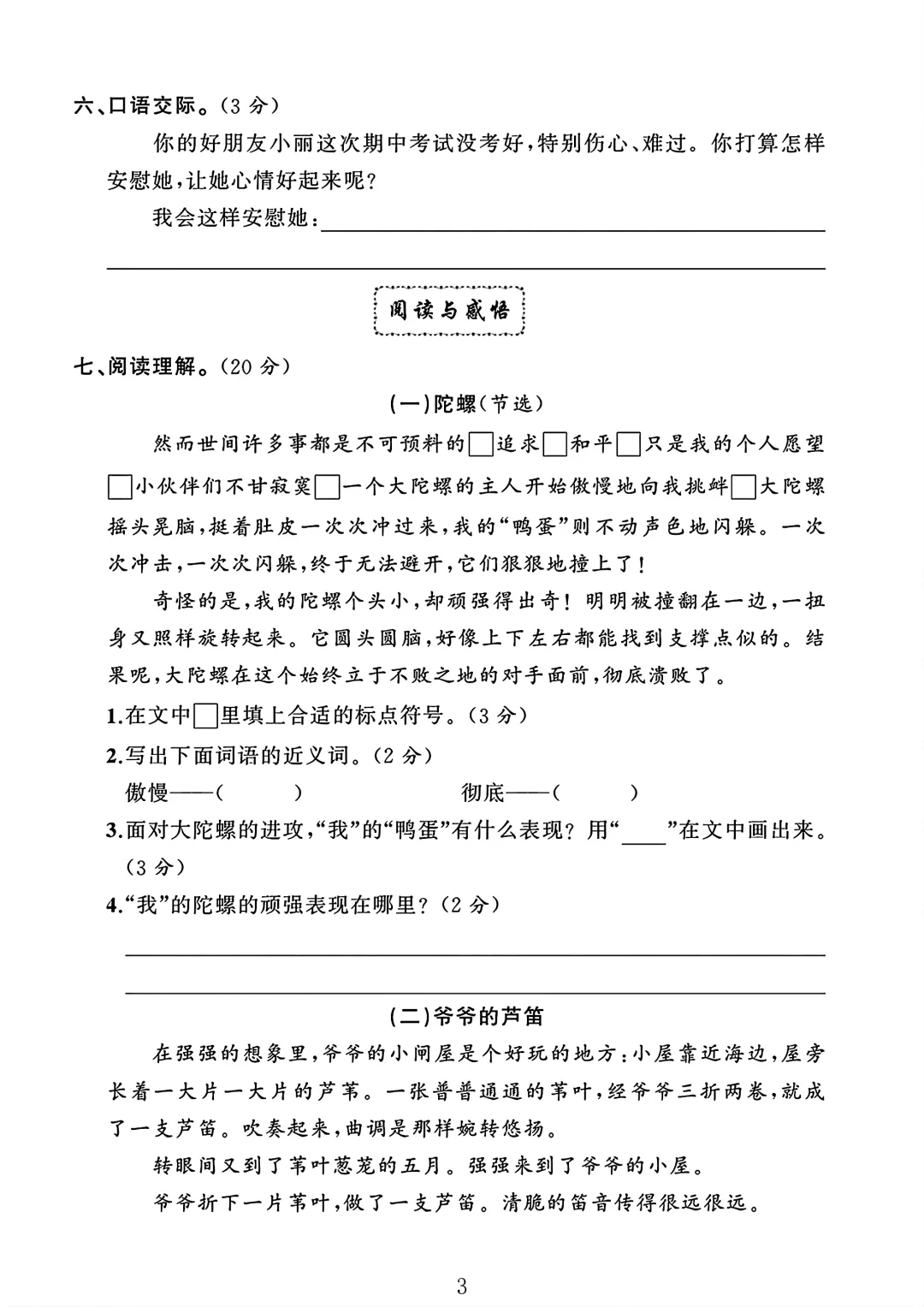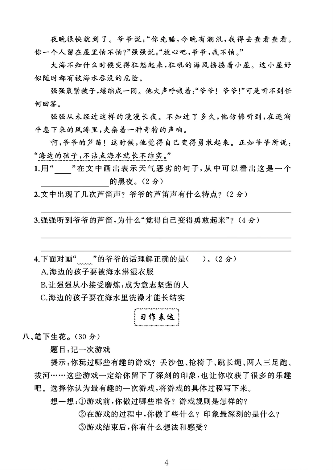 人教版 四年级上册语文 第六单元 试卷 单元测试 电子版可打印