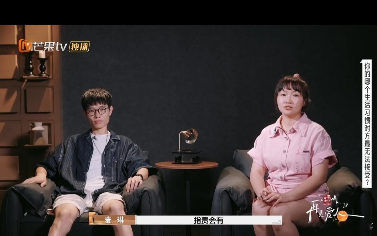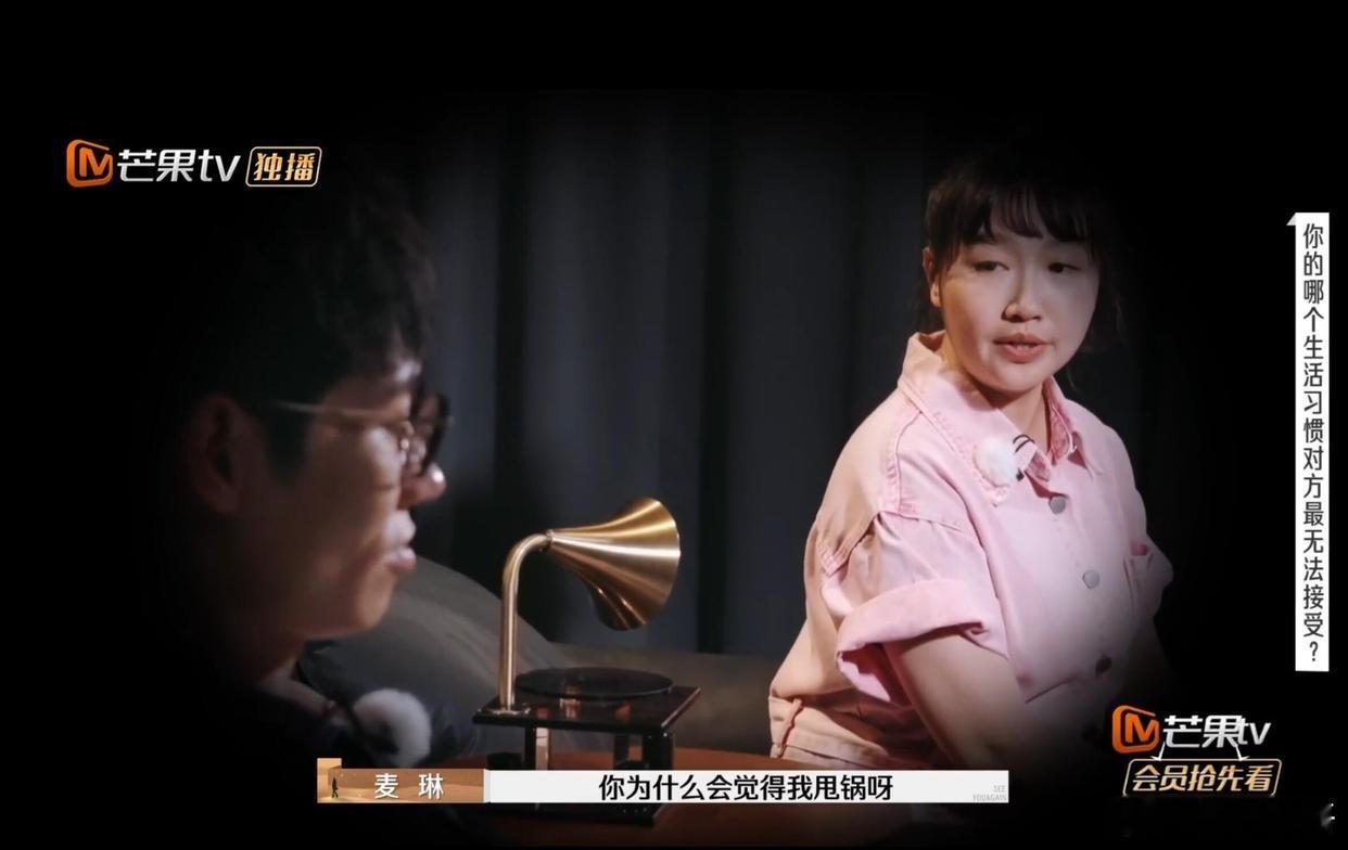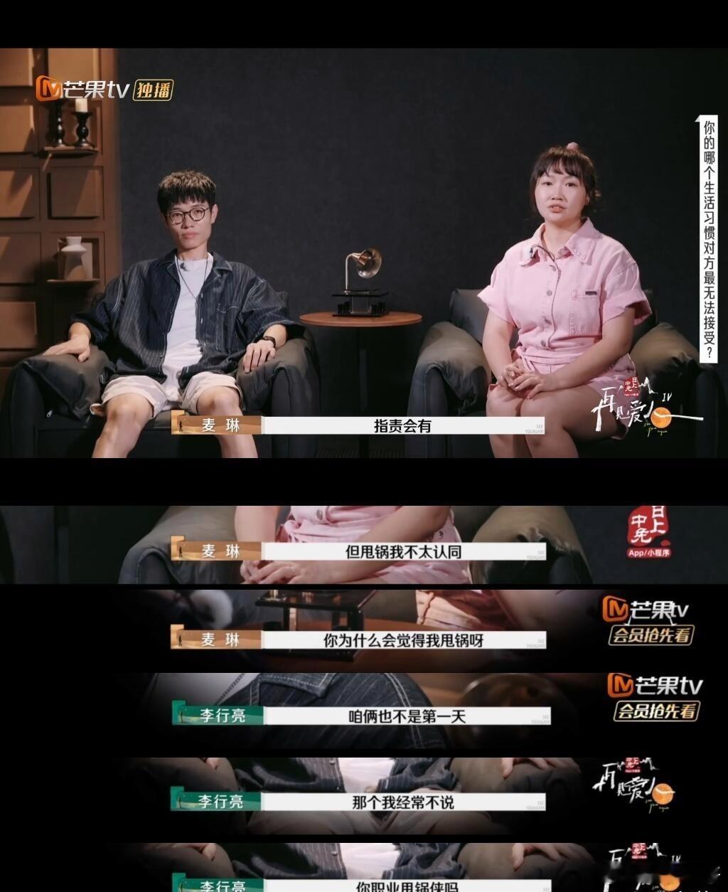 在婚姻体检部分,大概问“对方哪个生活习惯最无法接受”,李行亮写的是指责和甩锅,还说麦琳是职业甩锅侠