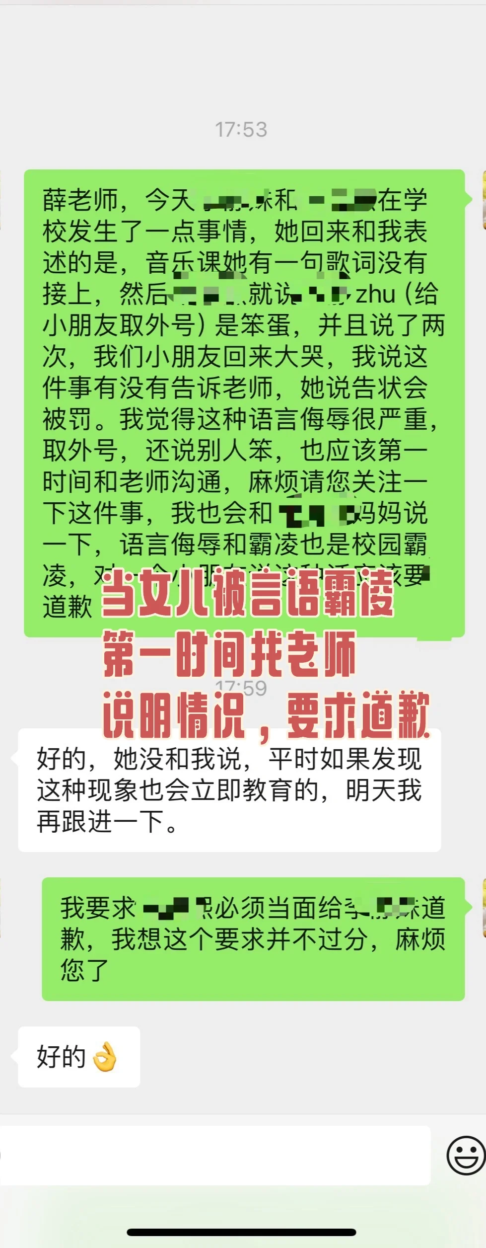 放学回来吃饭的时候突然大哭,边哭边说她被自己同桌喊外号骂笨蛋,我马上安抚,并且告诉小朋友,谢谢你告诉妈妈,我马上去找班主任和对方家长,说明情况,要求道歉,老师很快跟进处理,对方家长也在我群里睡觉前我再次拥抱summer ,感谢她及时把事情告诉我,相信妈妈一定会保护她,相信我们家庭是她的底气 亲子关系第一,日常一定要多聊天,了解小朋友在学校的情况,有任何问题马上找老师反馈,跟进处理,这样小朋友们才会有安全感,敢于对一切霸凌行为说不‼️