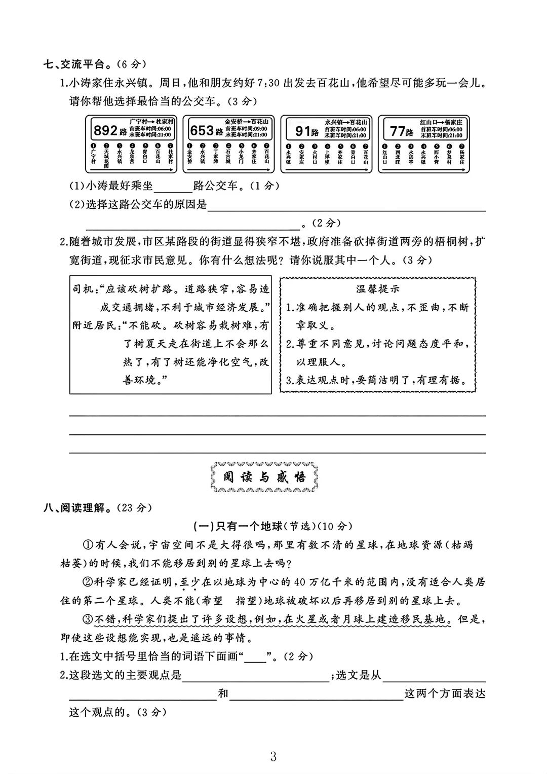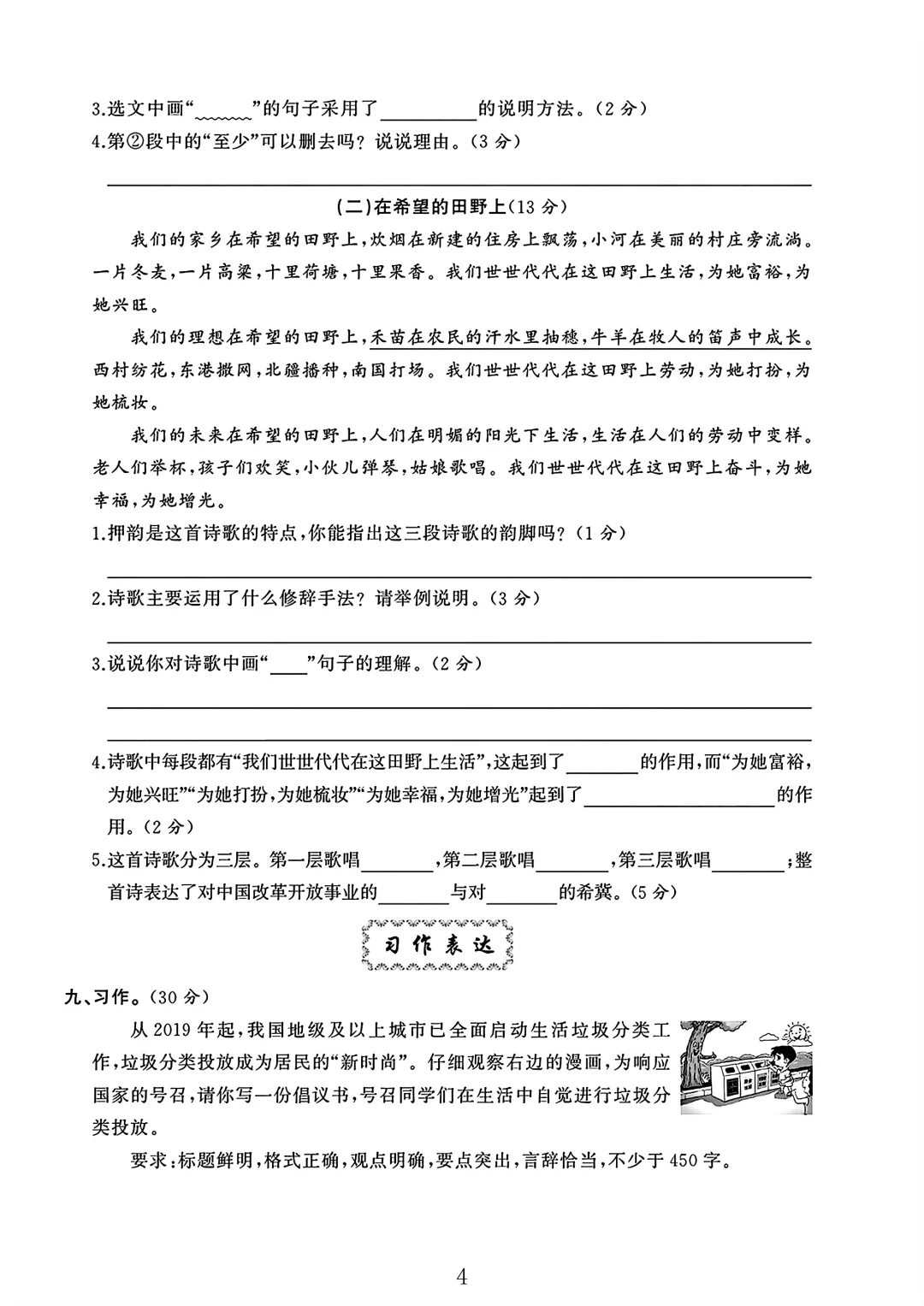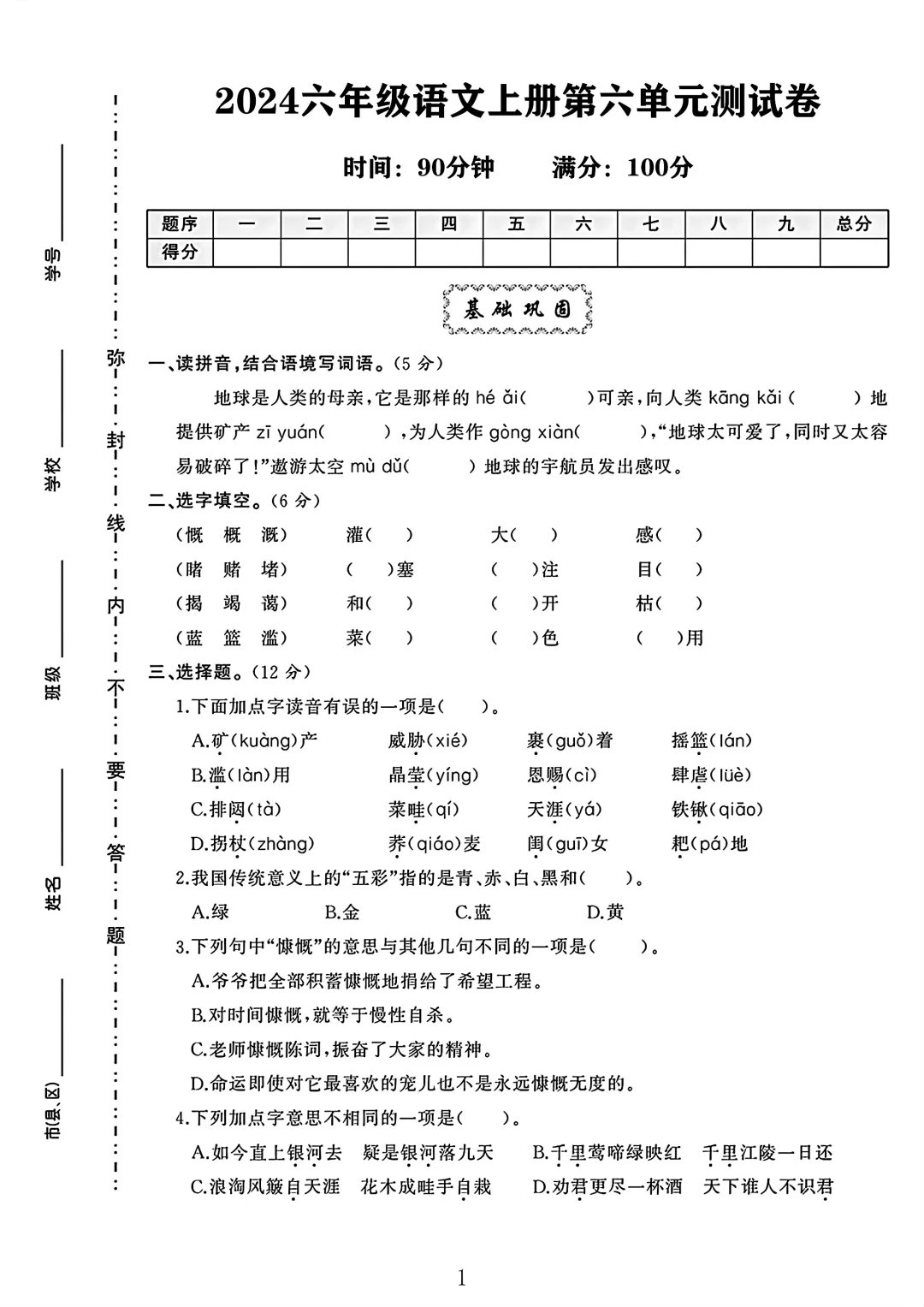 人教版 六年级上册语文 第六单元测试卷 单元测试 电子版可打印