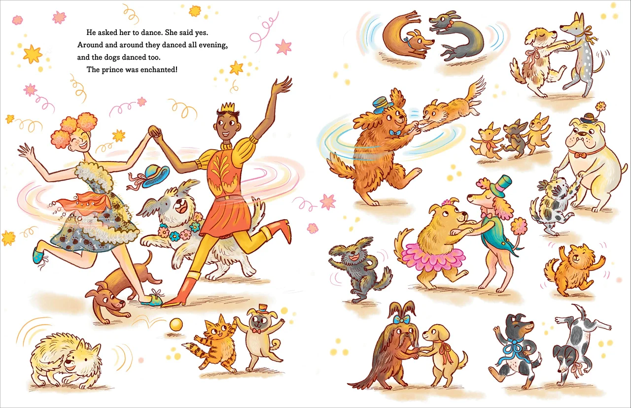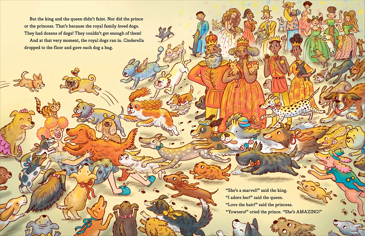 但舞会上的每个人也爱狗!舞会上的狗用拥抱和亲吻包围住灰姑娘。晚上,灰姑娘也和王子跳舞。