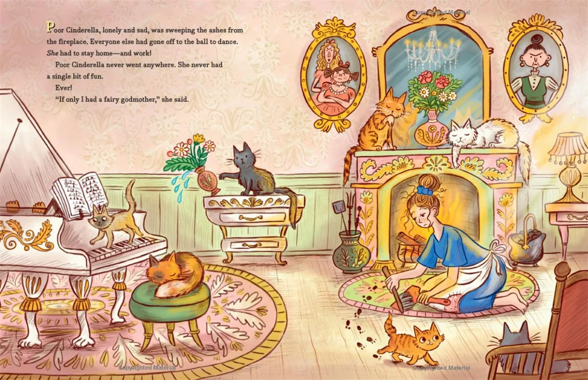灰姑娘独自一人在家里做家务,只有一只猫咪陪伴着她,其他人去参加舞会了。