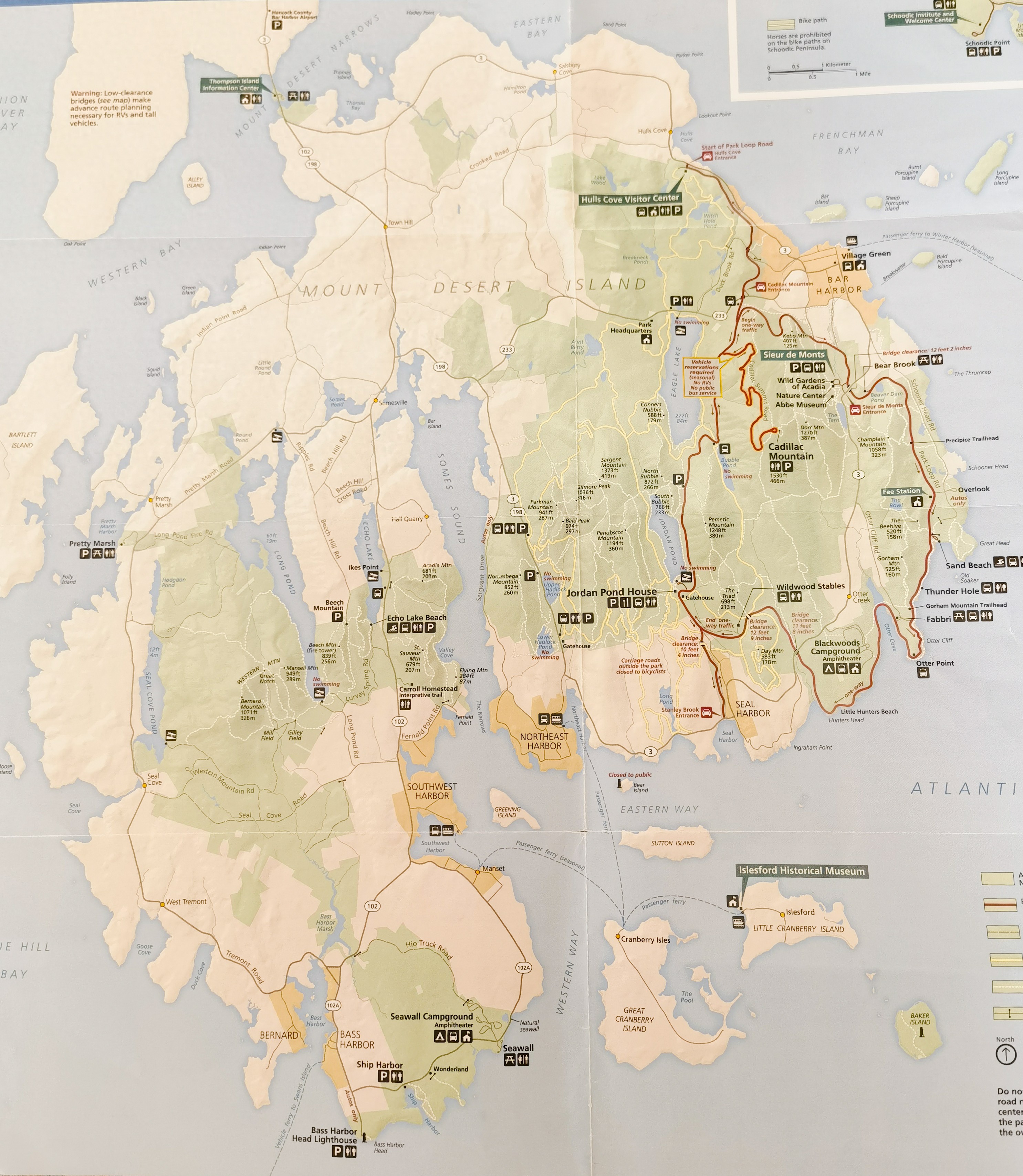 萨摩斯(Somes Sound)峡湾将芒特迪瑟特岛分为东西两部分,1919年设立的阿卡迪亚国家公园占据了岛上的主要区域,其中包括美国东部海岸最高点凯迪拉克山(Cadillac Mountain)。不过公园应该是分为几个部分的,有四个出入口需要出示门票。