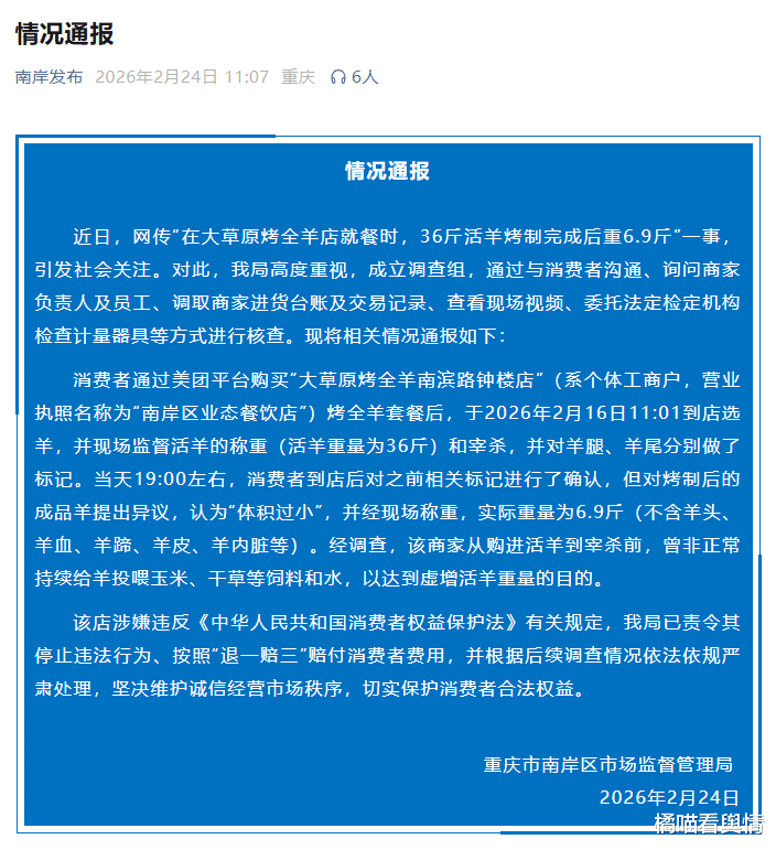 网传“在大草原烤全羊店就餐时,36斤活羊烤制完成后重6.9斤”一事,引发社会关注。经调查,该商家从购进活羊到宰杀前,曾非正常持续给羊投喂玉米、干草等饲料和水,以达到虚增活羊重量的目的。该店涉嫌违反《中华人民共和国消费者权益保护法》有关规定,我局已责令其停止违法行为、按照“退一赔三”赔付消费者费用,并根据后续调查情况依法依规严肃处理,坚决维护诚信经营市场秩序,切实保护消费者合法权益。