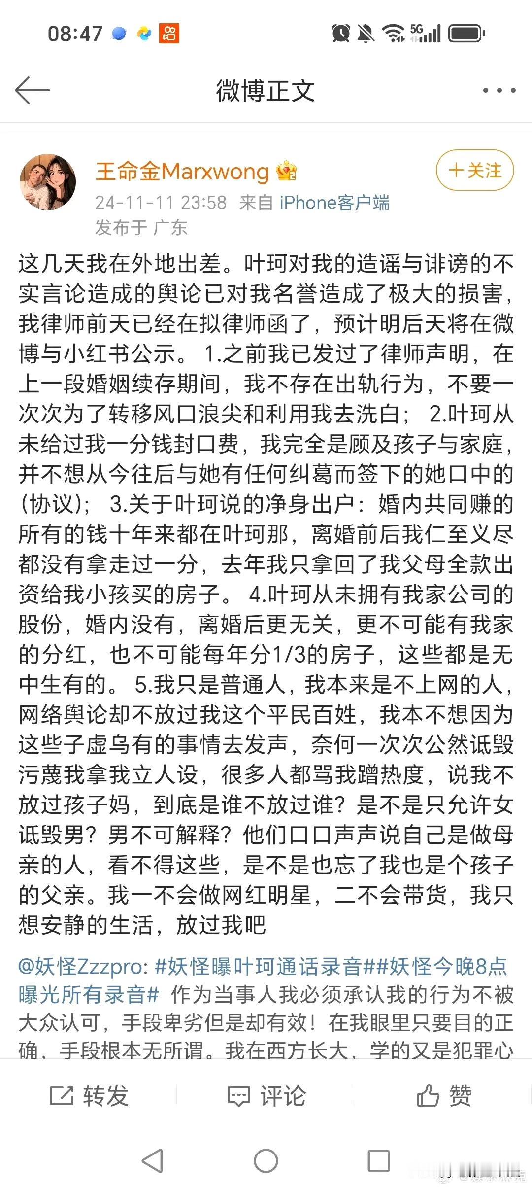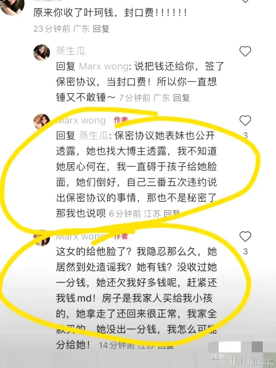叶珂前夫声明中的4大疑点,证明了叶珂前夫未必有他自己说的那么无辜。 第一,前夫没有说要起诉叶珂,只是说要晒律师函,懂法的都知道,律师函并不等于就一定起诉。 第二,前夫说叶珂没有给过他一分钱封口费,请注意,他说的是没给过,没有否认分手协议上有相关条款,再联想到他在评论区说叶珂还欠他好多钱,是不是侧面证明叶珂确实承诺过给他封口费,只是还没给?他说叶珂没钱,但还想要叶珂给他封口费,到底是什么目的呢? 第三,前夫说十年赚的钱都给叶珂了,但又说叶珂没有钱,假装富婆人设,这是不是有点矛盾呢? 第四,前夫说自己是不上网的人,又说网络舆论不放过他,不上网怎么知道网络舆论不放过他的?再说,现实中像他这个年龄的,有可能不上网吗? 世上至少99%能维持达到10年的婚姻,双方的三观必然是基本一致的,整起事件中,完全无辜的感觉只有黄晓明一人,他可能永远也想不明白,为什么自己明明那么优秀,但想好好爱一个人又那么难呢?