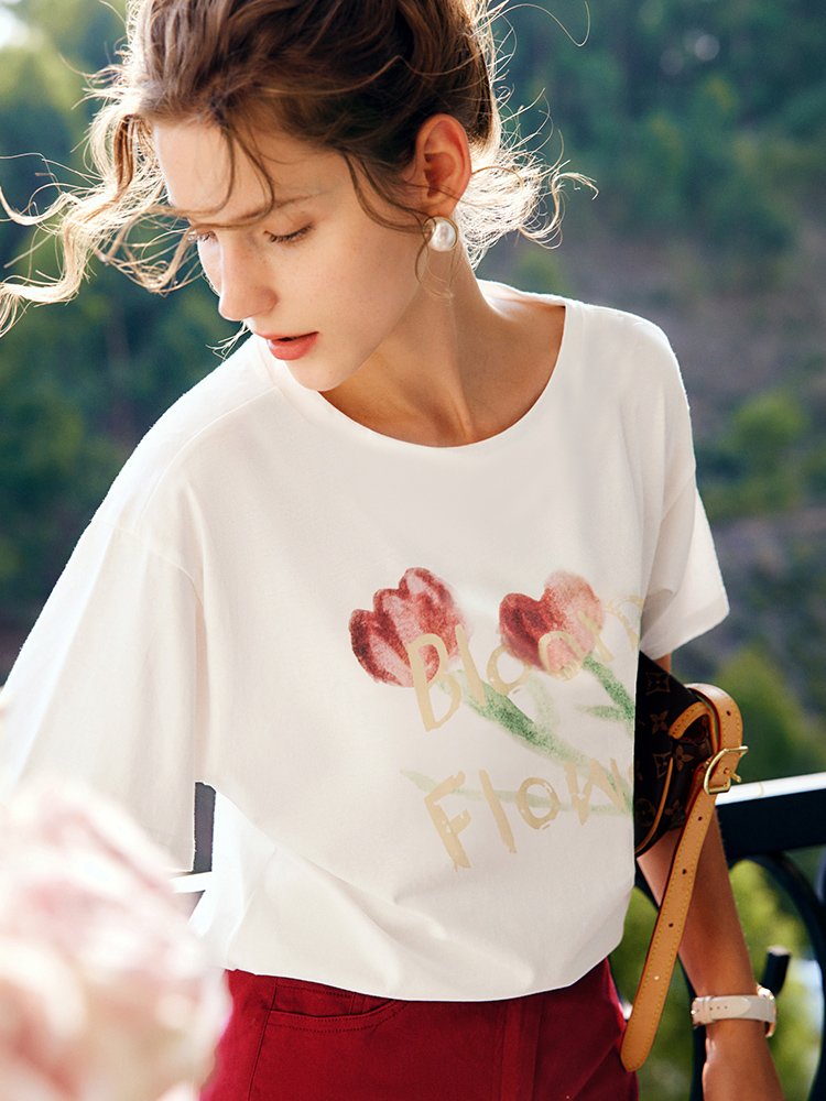 选用透氣棉面料,亲肤细腻,舒适柔软;吸湿透氣性强,不易变形起皱,日常好打理;前胸花朵+字母印花,浪漫吸睛,不易脱胶开裂