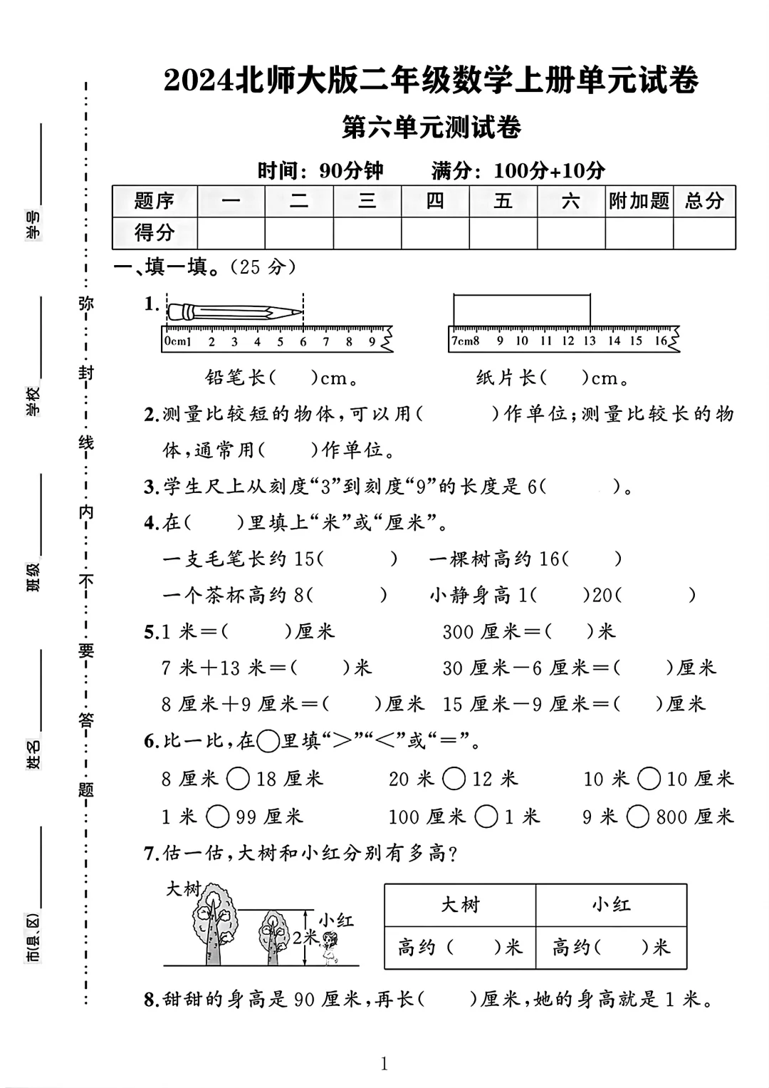 北师大版数学 二年级上册数学 第六单元测试卷 单元测试 电子版可打印 试卷