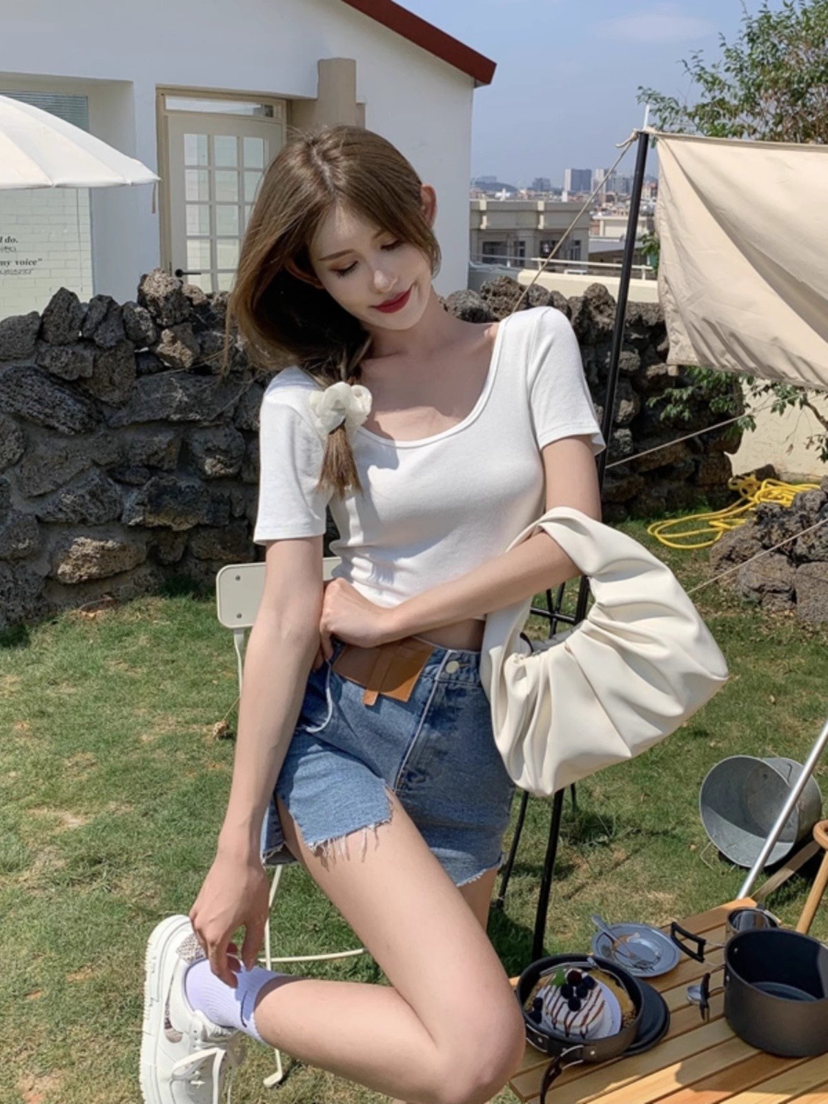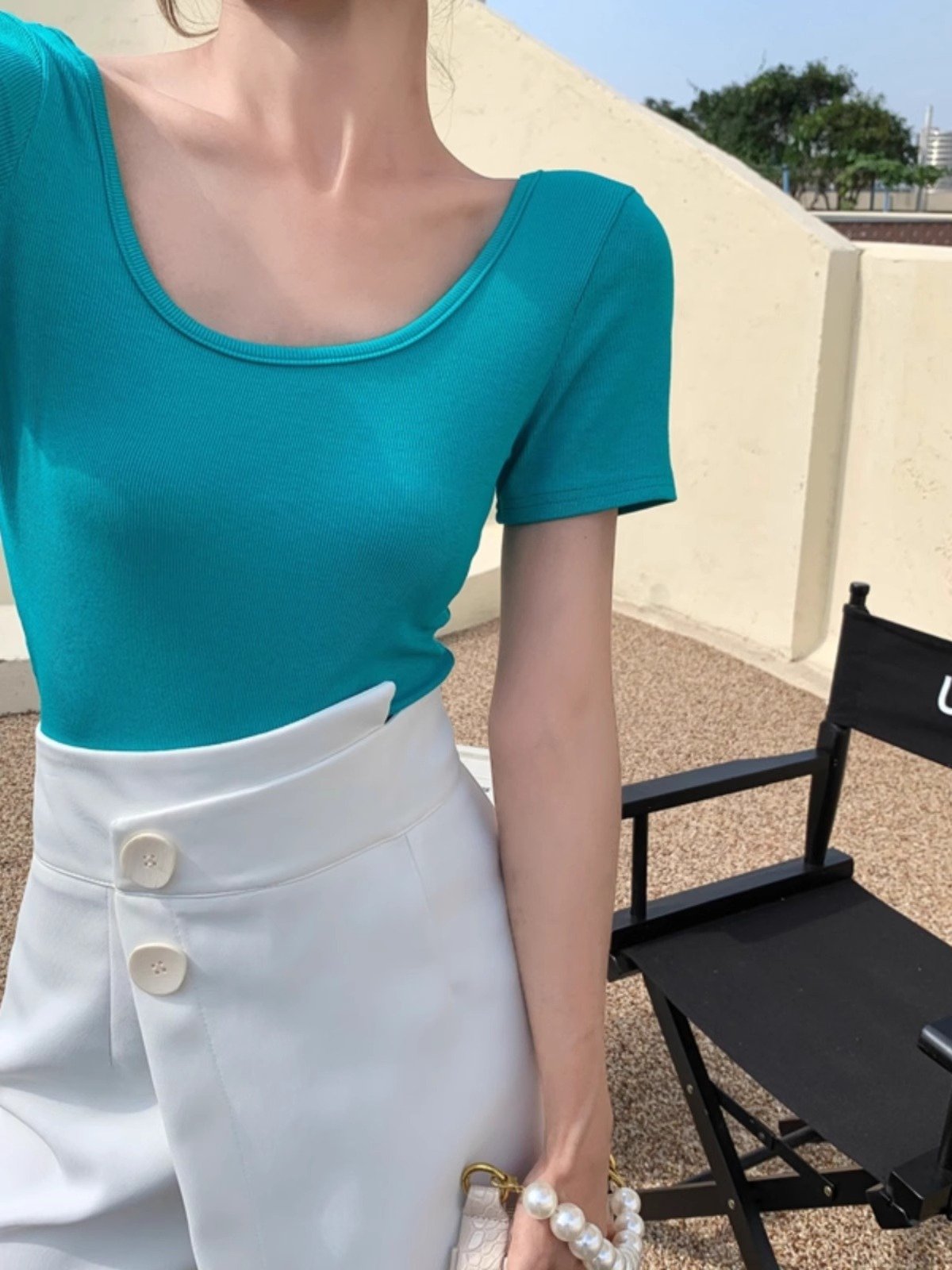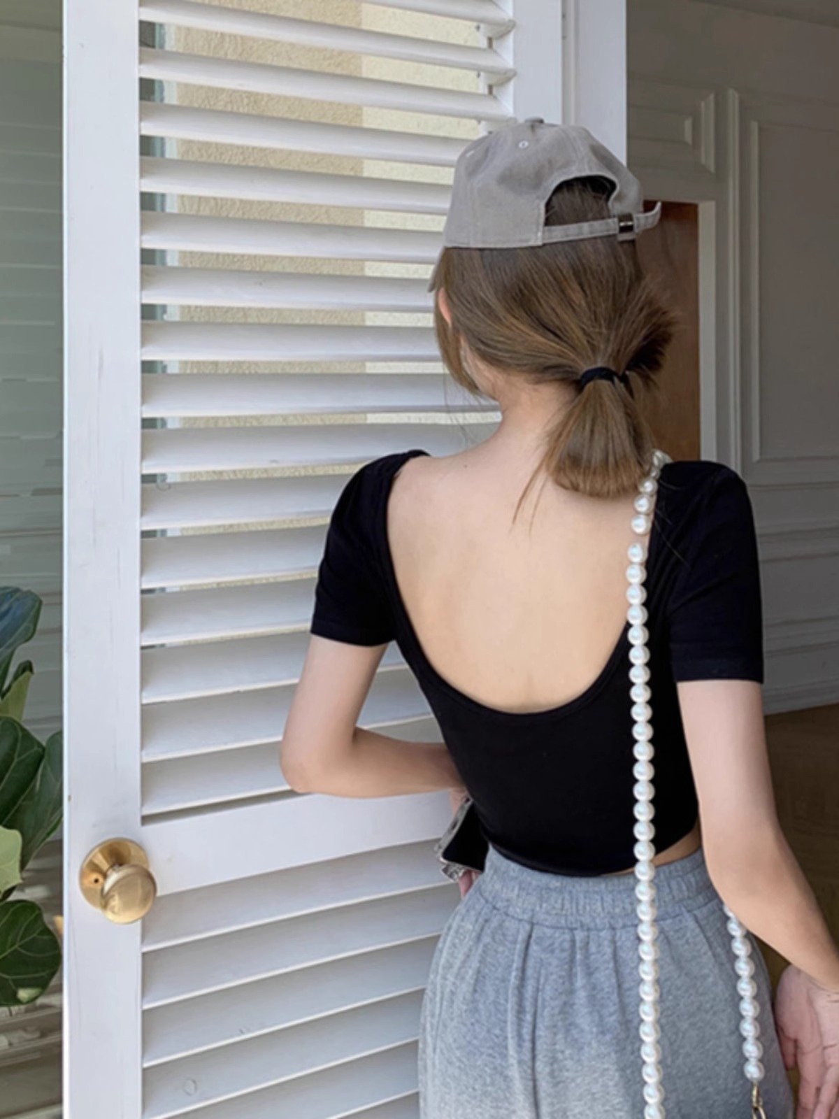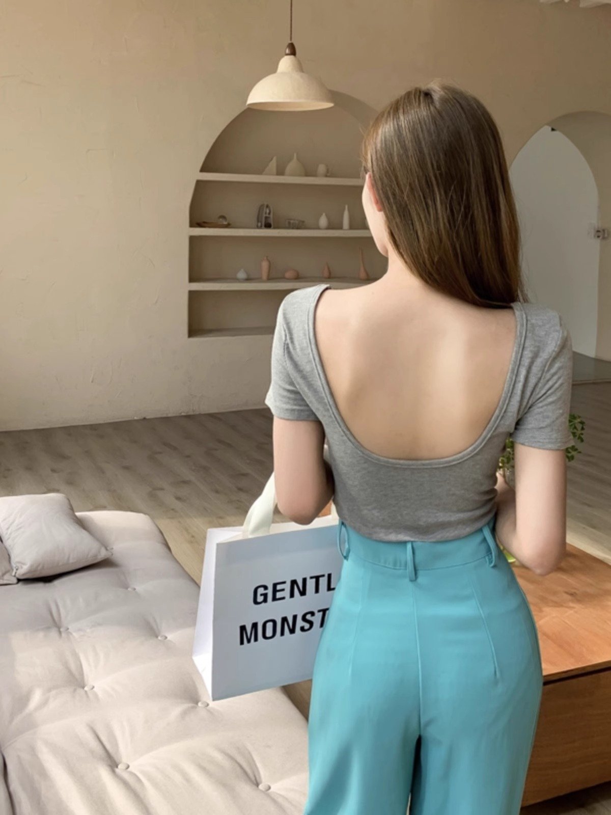 夏季辣妹正肩短款上衣女短袖紧身设计感小众