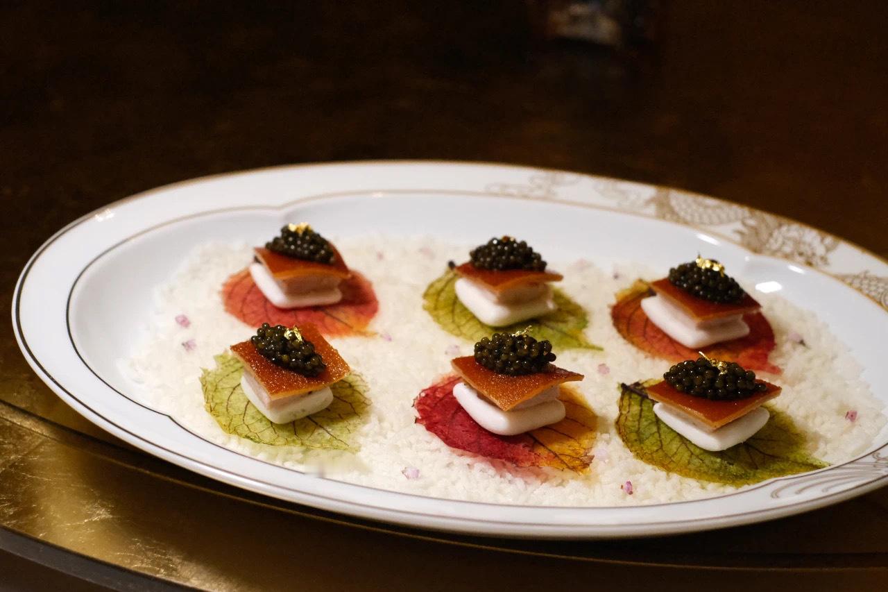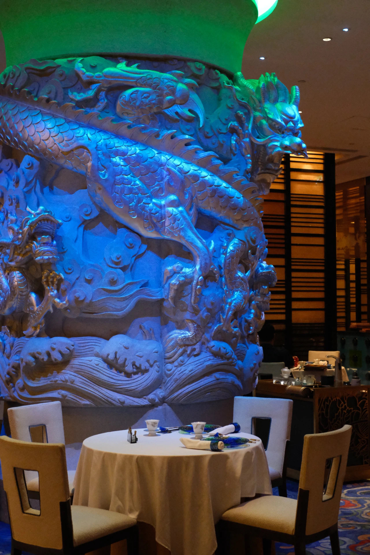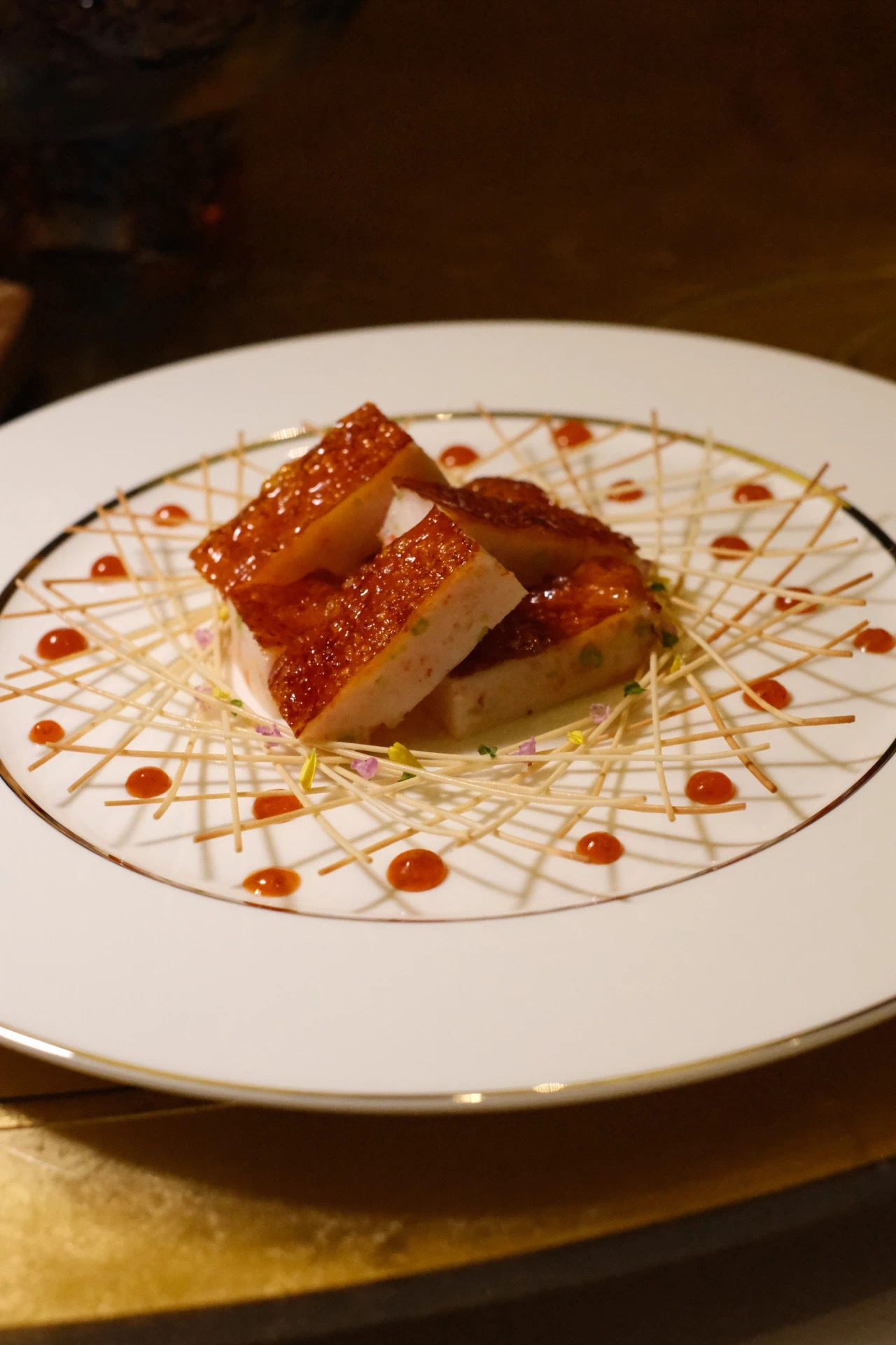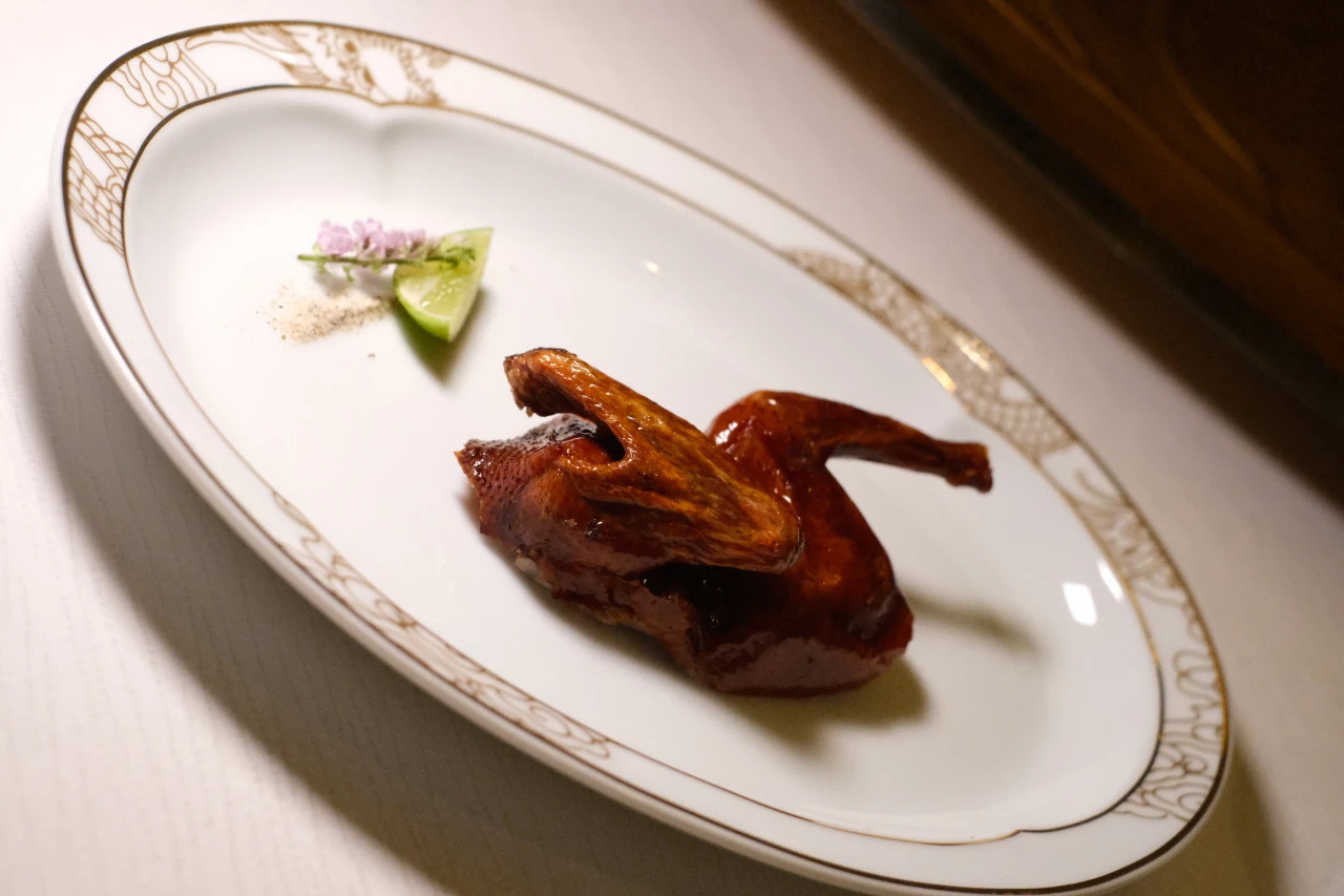 来澳门心心念念的就是这家福布斯五星餐厅。不同于澳门大多数高级餐厅给人的纸醉金迷感,这家反而是高冷威严的。整块大理石雕铸的威仪盘龙,与地毯上的祥云呼应,自成一股天地浑圆之气。连餐具都是剔透琉璃,握而尊贵。主厨徐伟豪的封神家最脆皮百花鸡,是上过《风味人间》,创下过亿收视的人气菜品。鸡皮的食感味道确实让我眼前一亮,焦香薄脆,每忆每垂涎。