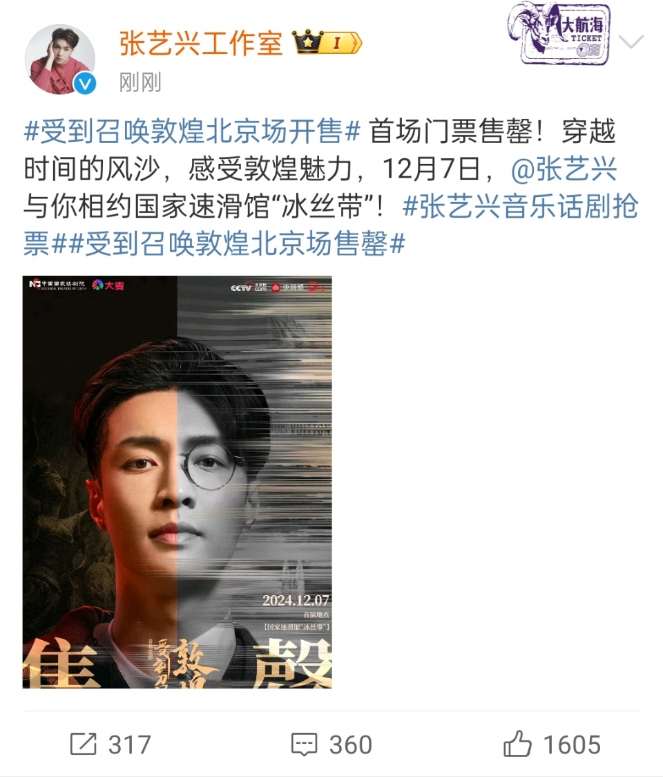 张艺兴音乐话剧首场门票售罄 张艺兴主演音乐话剧《受到召唤敦煌》首场门票售罄,一人分饰两角,是“敦煌守护神”常书鸿先生,也是未来的“敦煌小工匠”,12月7日相约国家速滑馆“冰丝带”!