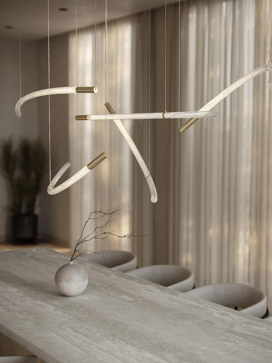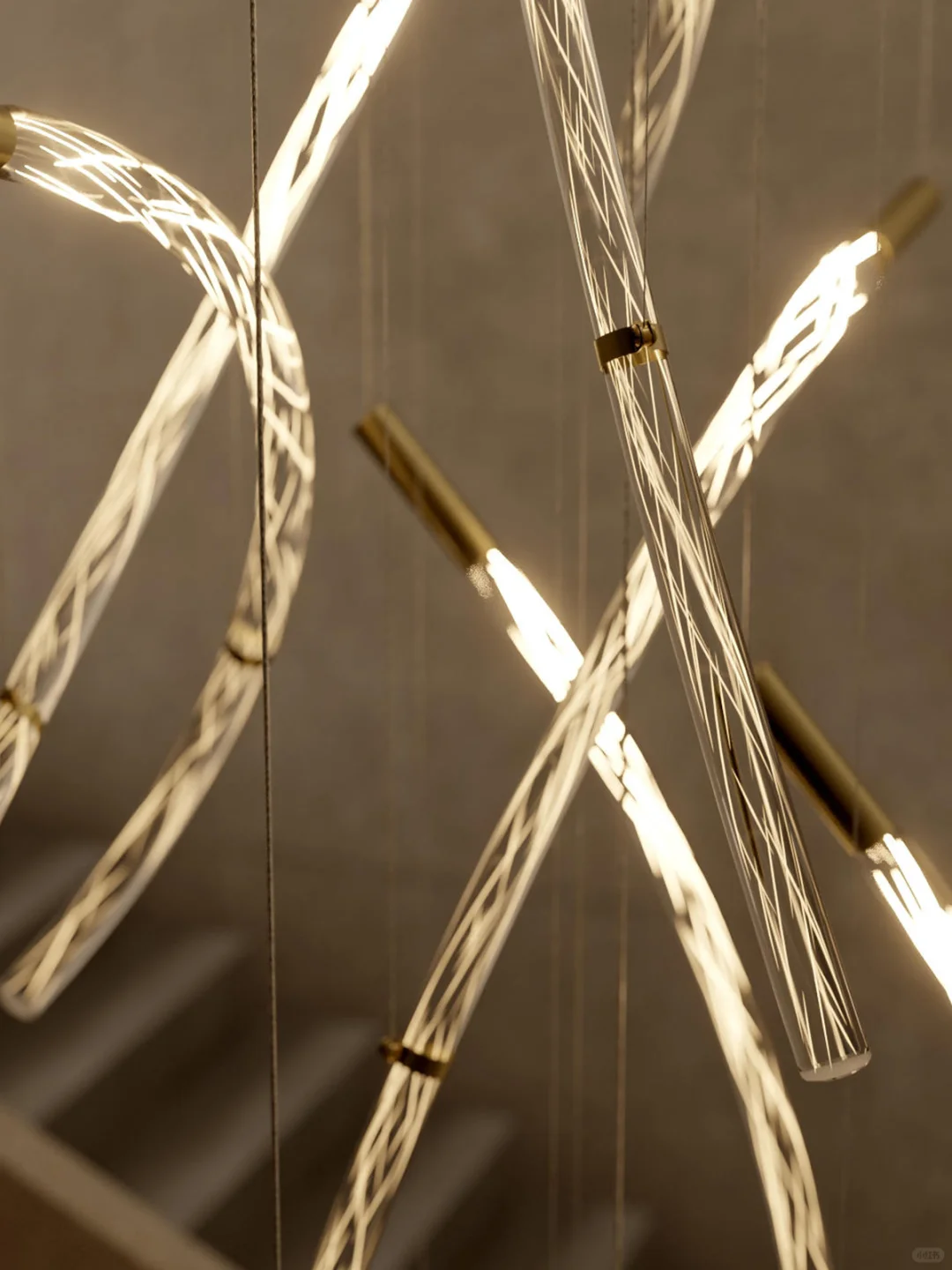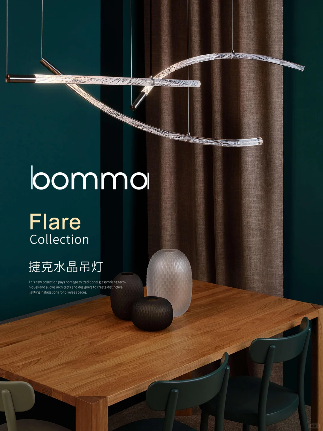 ✨水晶玻璃棒经过工艺大师反复加入玻璃碎手动拉伸,形成一字形和不同程度的弯曲形状,可以带来无限的组合方式。 🎨灯体中能看到螺旋纹理内里交织在一起,甚是精美。 💡当灯光亮起,他的闪耀与独特的形状充满神奇与惊喜。 💠Flare形态是灵活可变的,可以垂直安装,非常适合楼梯间或者办公空间或大厅。 🏡如果你想选一款特别的餐厅吊灯,Flare就非常合适,各种组合横向排列,大大增加就餐氛围,提升空间的格调。