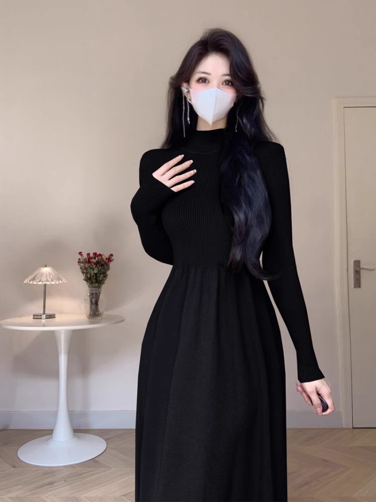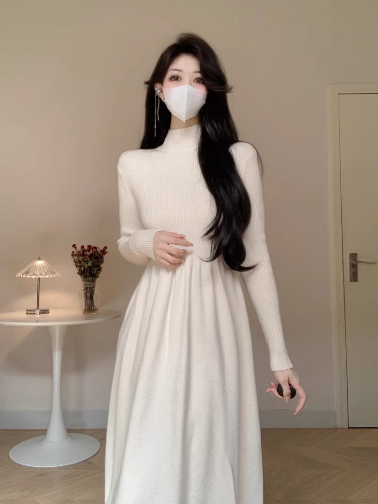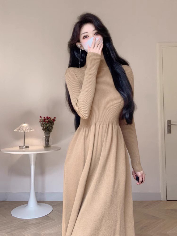 美拉德半高领针织连衣裙女秋冬季大衣内搭打