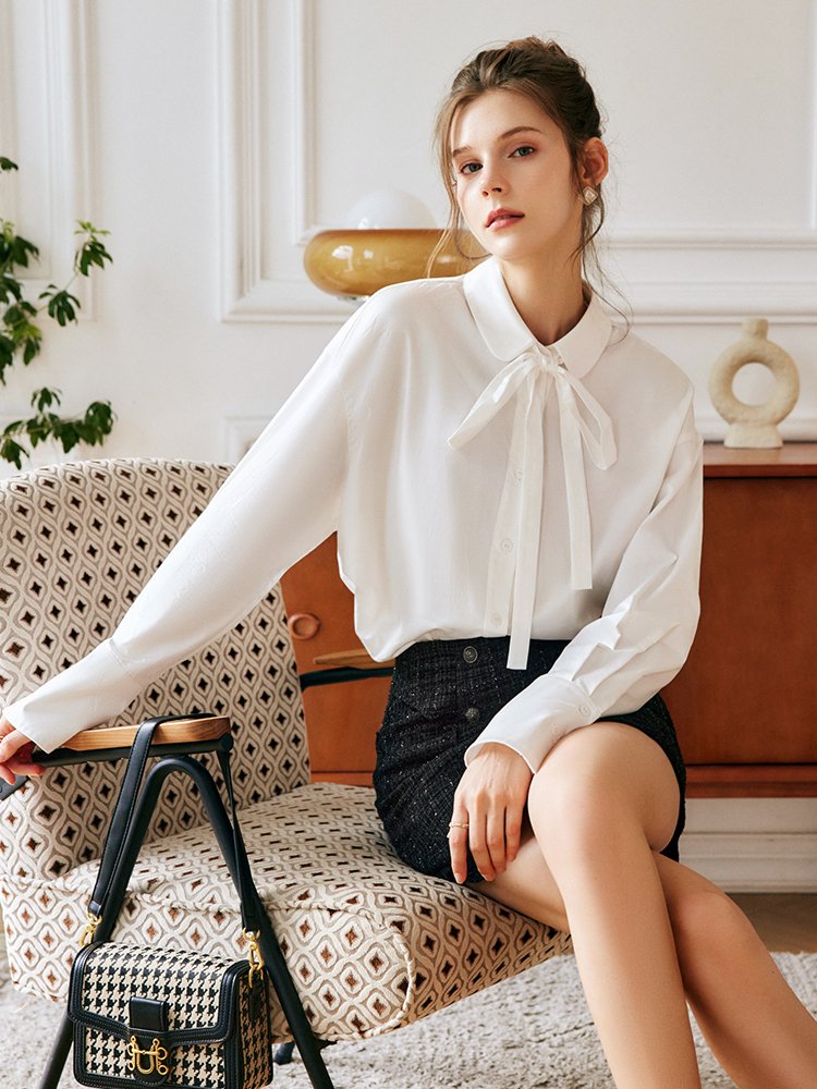 U质缎感衬衫棉面料,高支高密,亲肤透气;干爽布面兼具张力,穿着舒适挺括感好;翻领小圆角+可拆绑带设计,柔雅又有型;减缓了常规衬衫自带的正式感,增加时髦气息;下摆两侧圆弧剪裁,上身造型感强;保持简约风格的同时又多了一丝休闲感;单穿或者作为各种卫衣、毛衣的内搭都可;更显层次感,可解锁多种穿搭方式