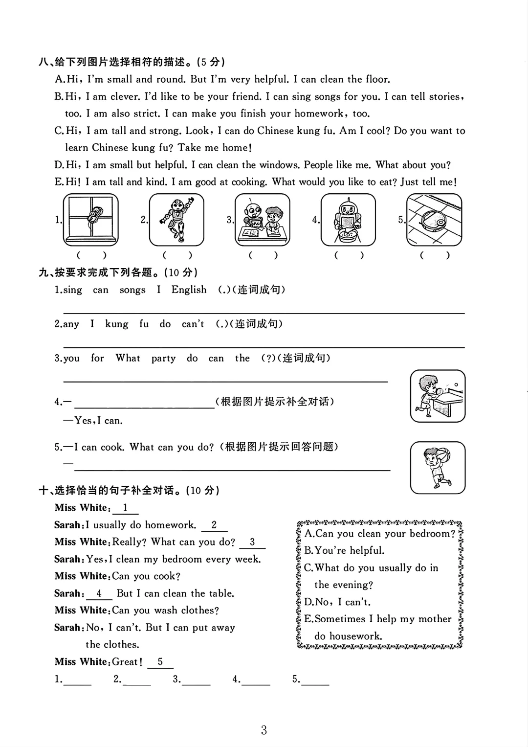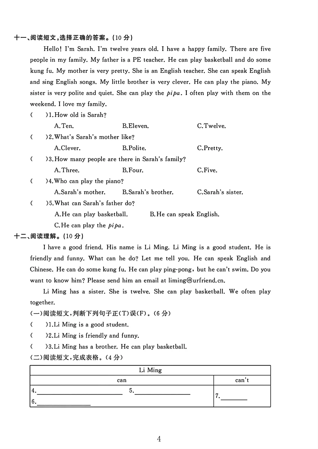 人教版 五年级上册英语 第四单元 试卷 单元测试 电子版可打印