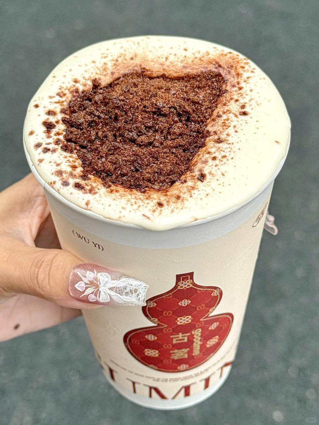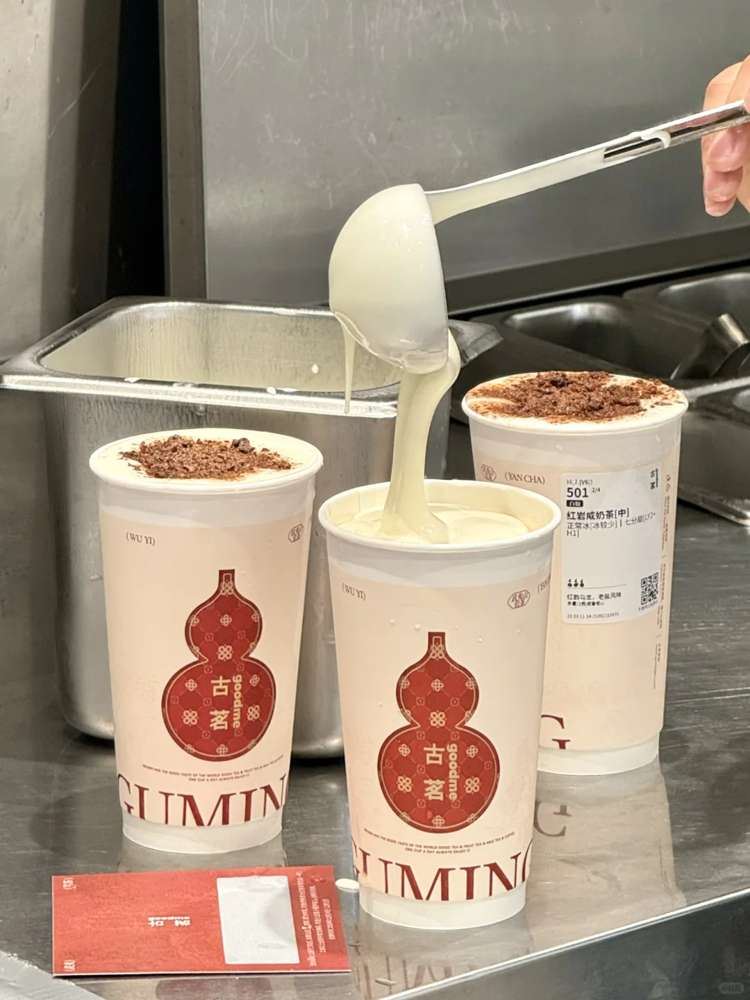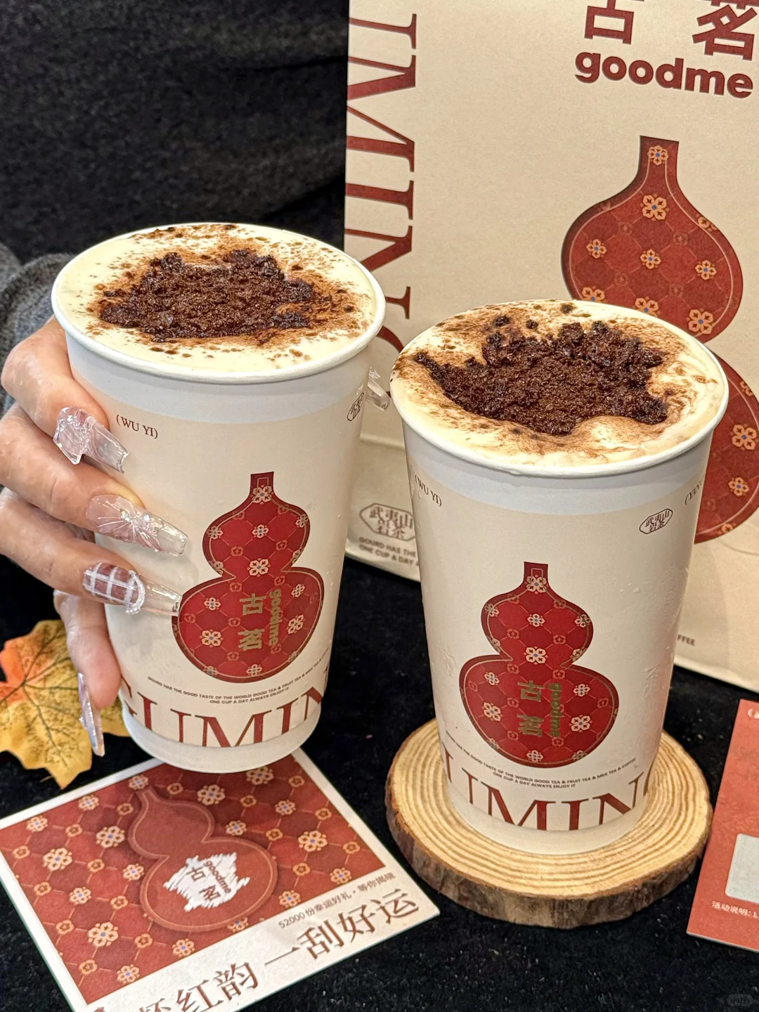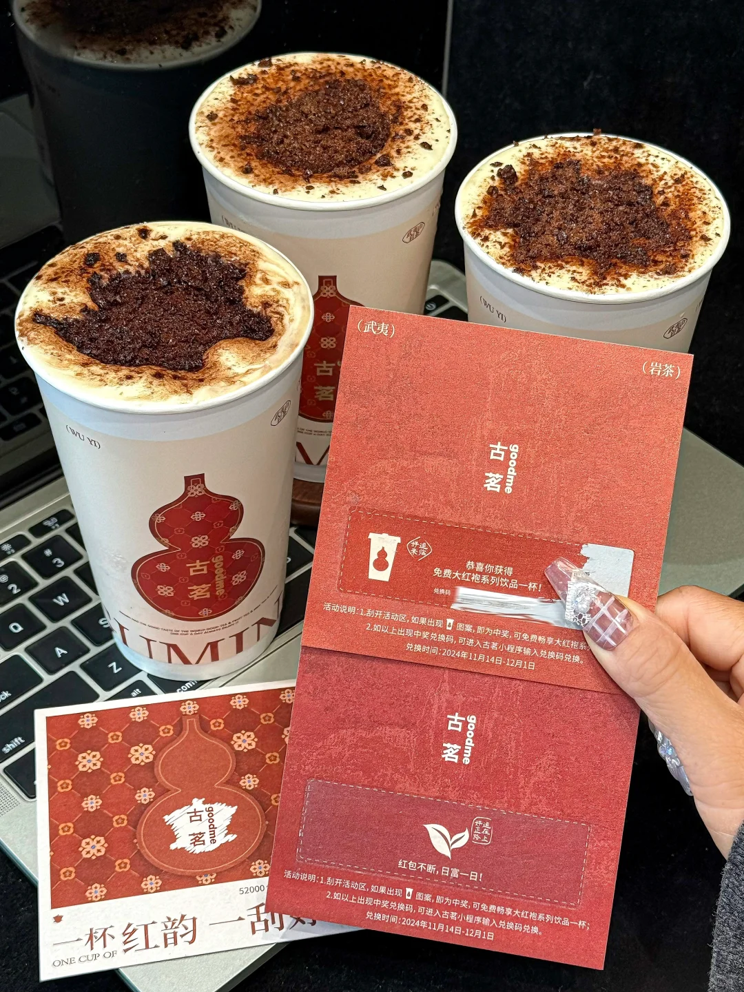 古茗这次的新品咸奶茶真的好好喝了! ✔红岩咸奶茶 大红袍盐韵茶香搭配老盐风味,加上芝士奶盖、口感咸香醇厚~顶部撒满了阿华田酷脆,脆香可口!尊嘟无敌了。。根本喝不腻😭 缺点就是中杯真的不够喝啊😡😡 · 还有另外两款大红袍系列也吼吼喝!! ✔千里暮山红 大红袍红韵乌龙混着冷藏牛乳!茶香奶香完美融合,醇厚丝滑,可以回味n久!! ✔红岩桃胶炖奶 好喜欢底部桃胶软糯顺滑的口感,加上岩韵大红袍牛乳茶的醇香,又暖又润!热饮也很好喝!! · 噢对了!每单还有刮杯红韵卡 刮杯红韵刮出免⚪概率好高!!细节也hinnn⽤⼼…… 刮中图案是⼤红袍红韵杯!即使未刮中也有桃胶、茶叶、⽜奶等各种⼩元素图案和祝福语✌️ 有一说一,红运杯和红运打包袋尊嘟太好看啦!!