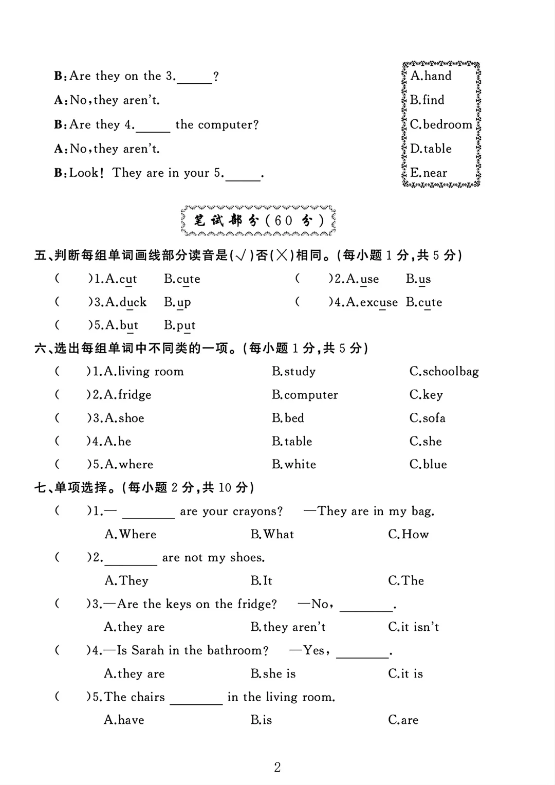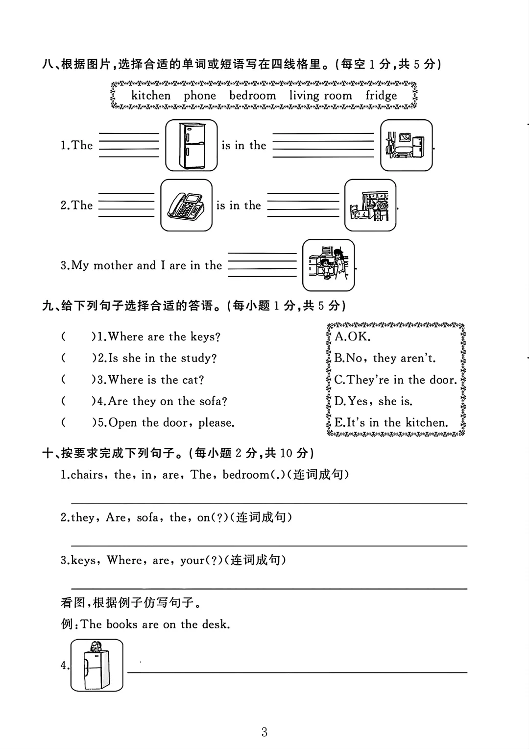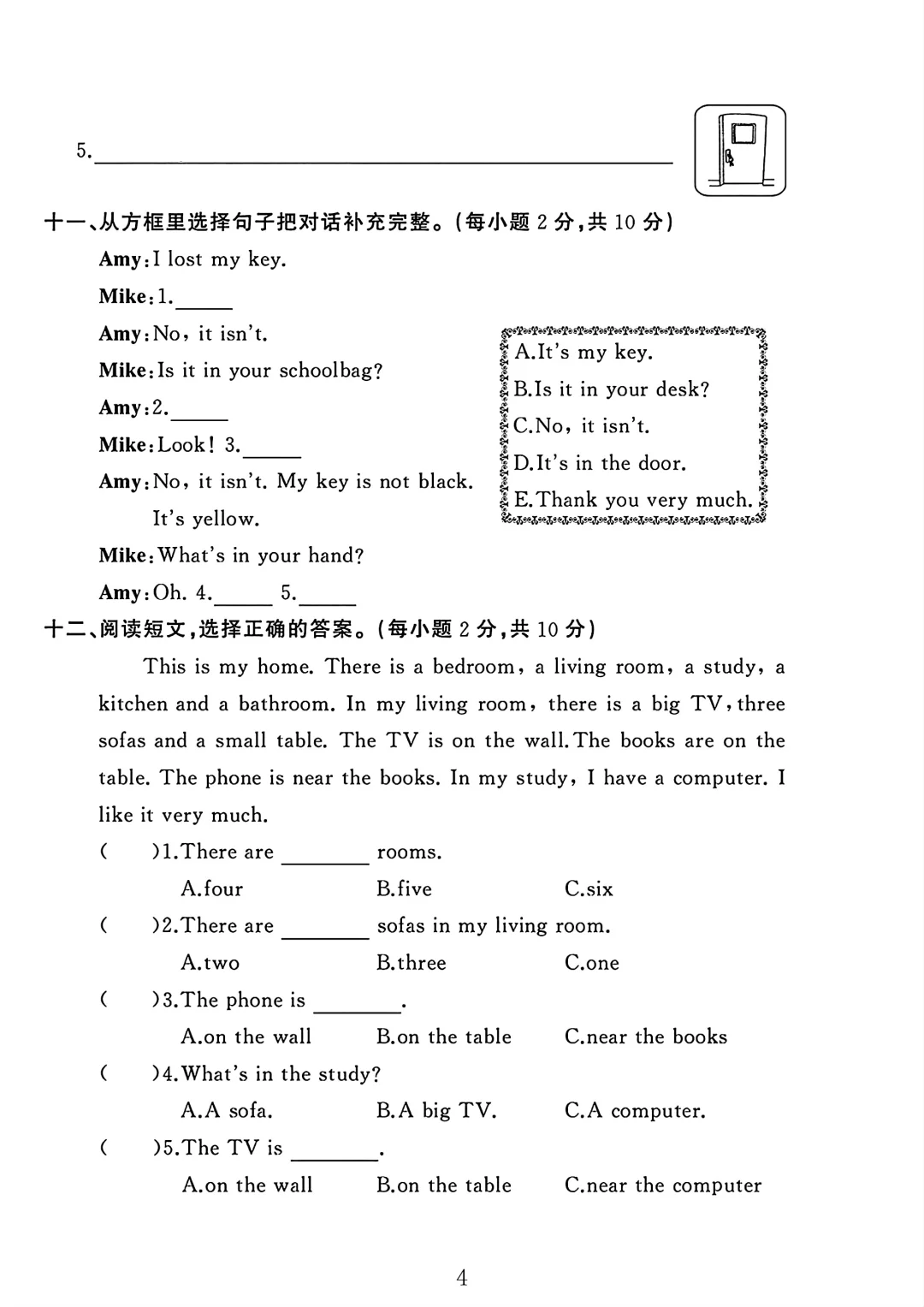 人教版 四年级上册英语 第四单元 试卷 单元测试 电子版可打印