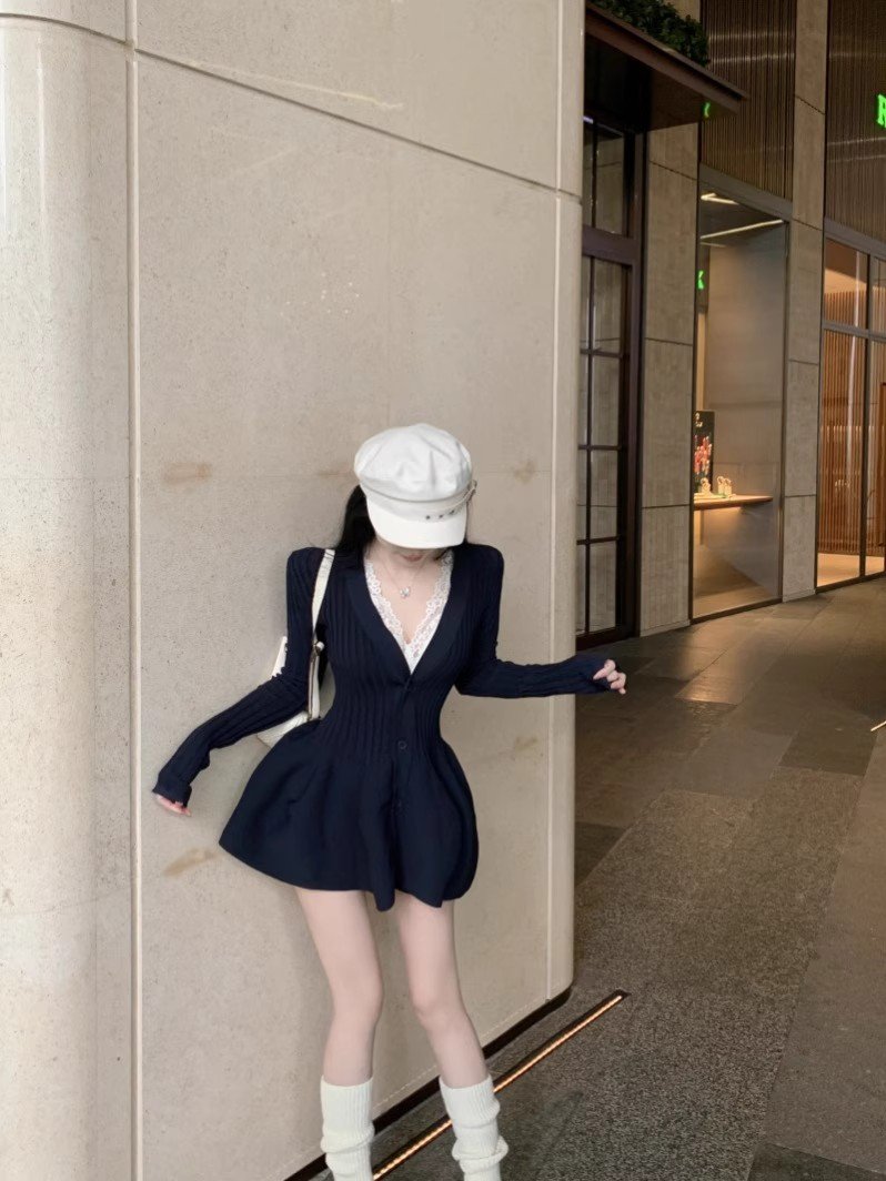 法式V领针织毛衣连衣裙女秋冬内搭小个子