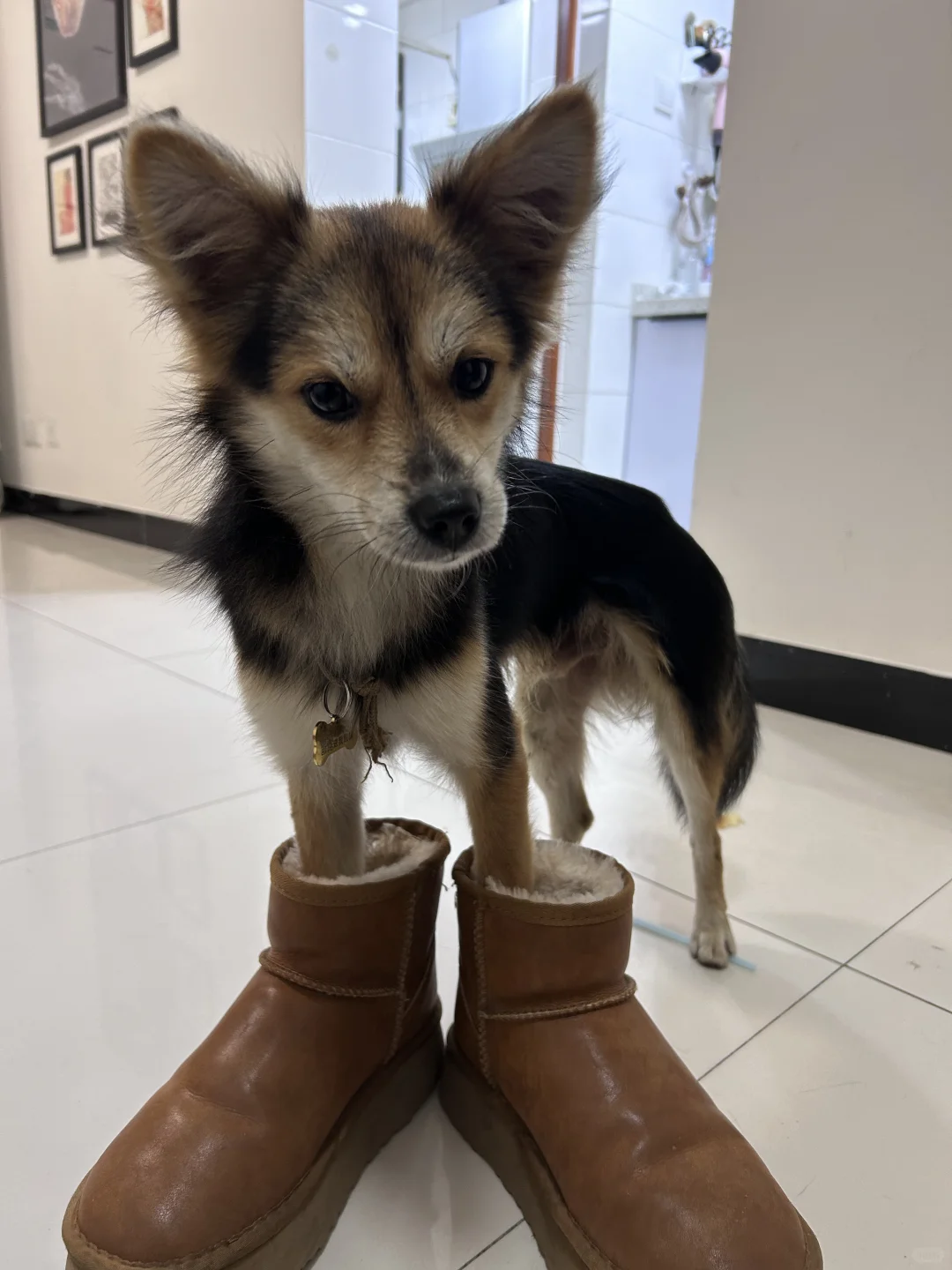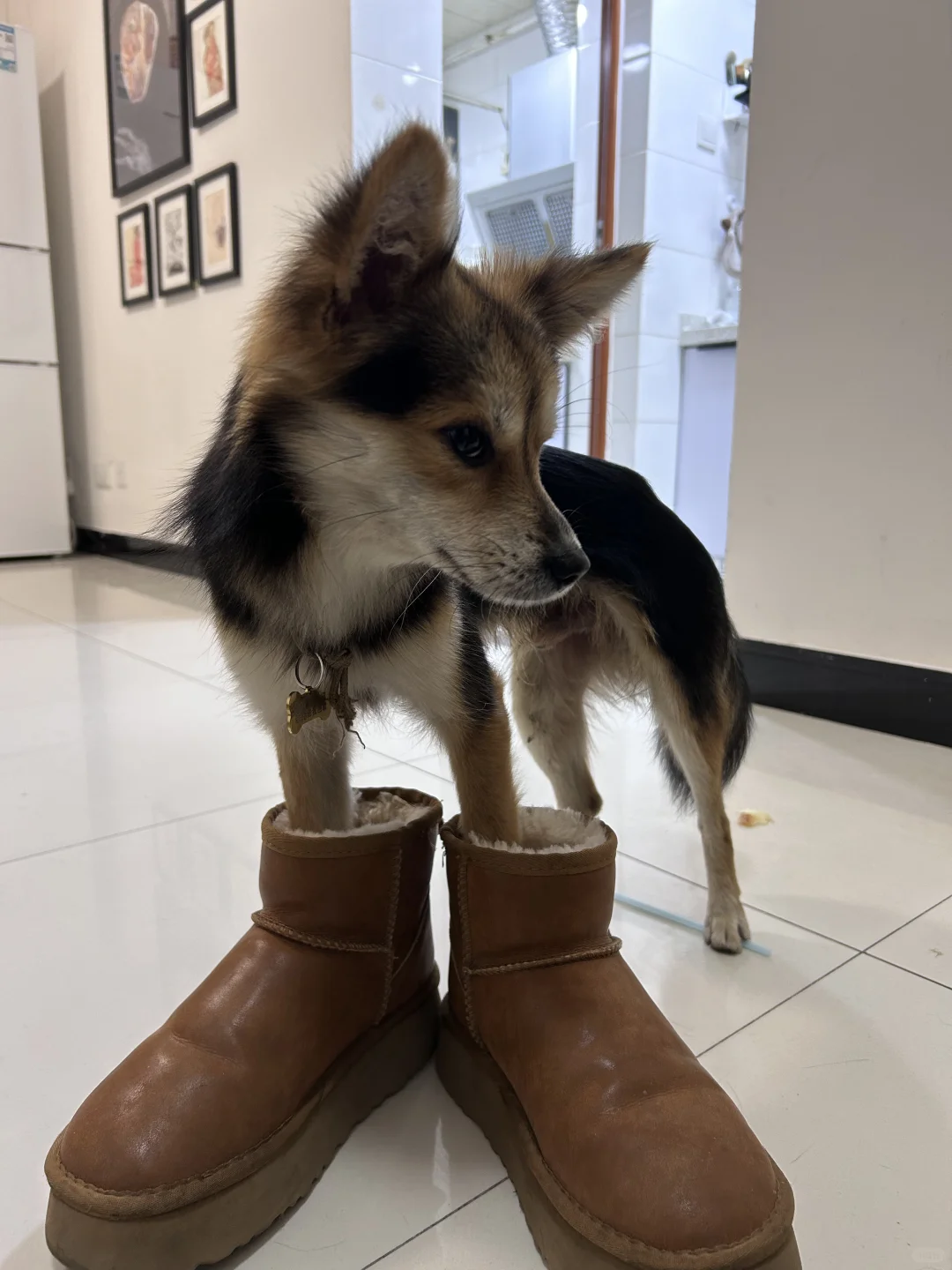 前几天给小黑试了一下雪地靴,满足一下我想看小狗穿大鞋的恶趣味,小黑很不高兴,在看我一直笑并没有给他脱下的意思后,他将前脚拔出了鞋子。