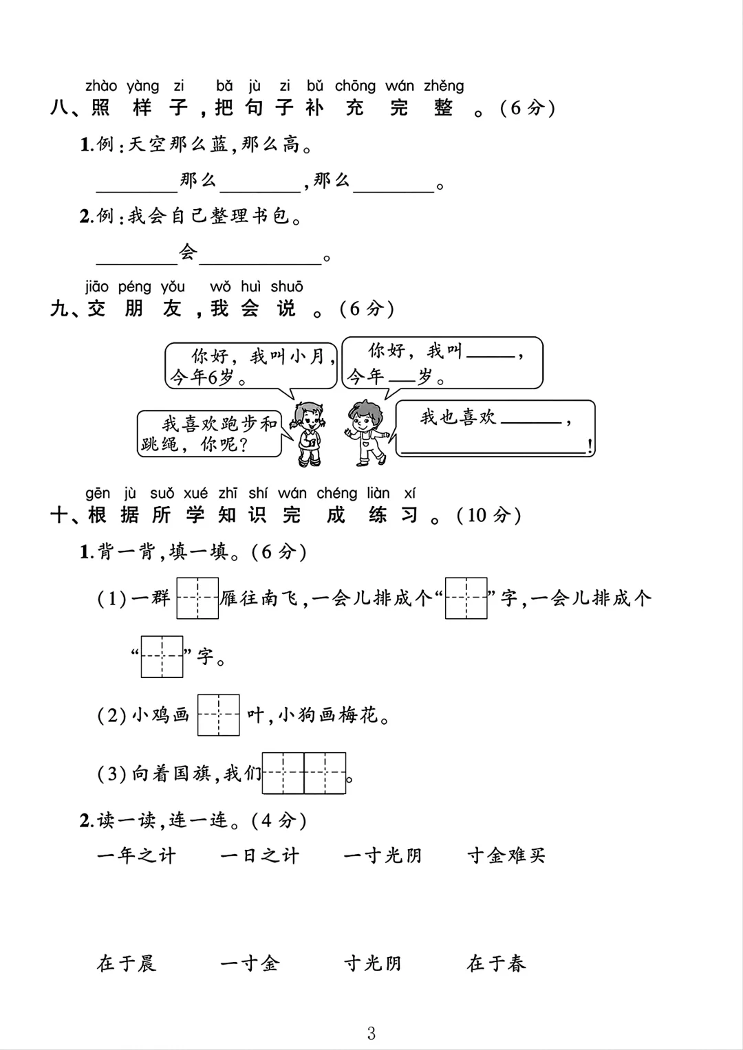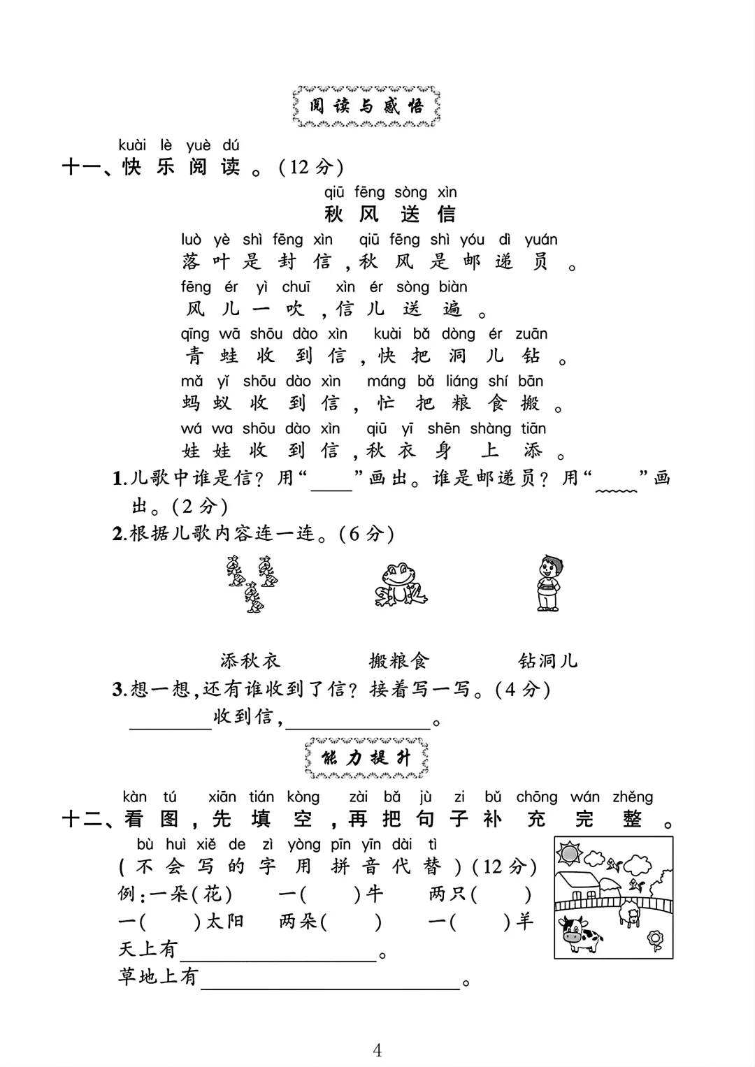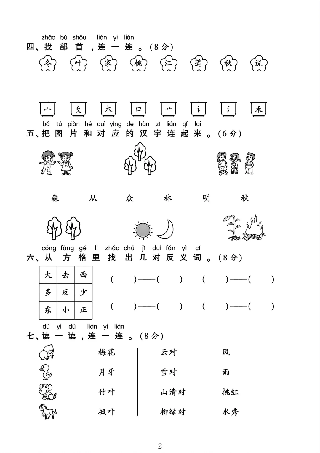 人教版 一年级上册语文 月考 第二次月考 单元测试 电子版可打印