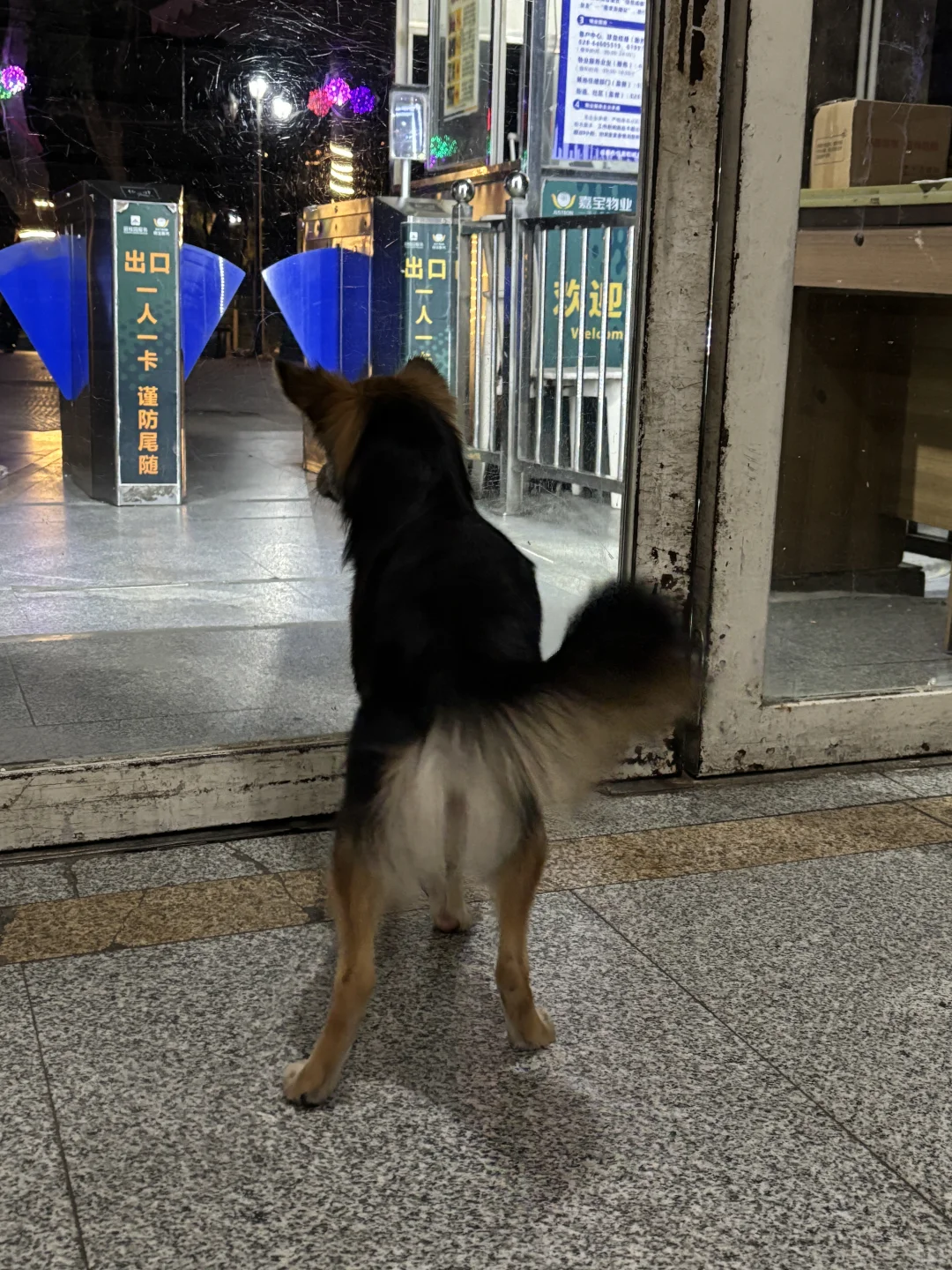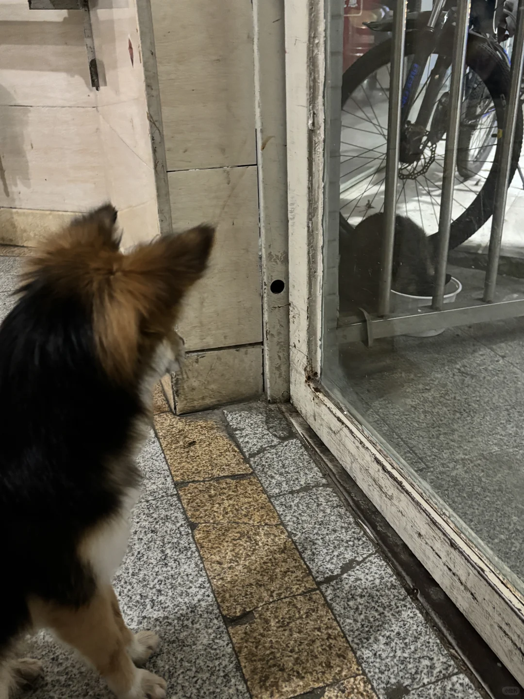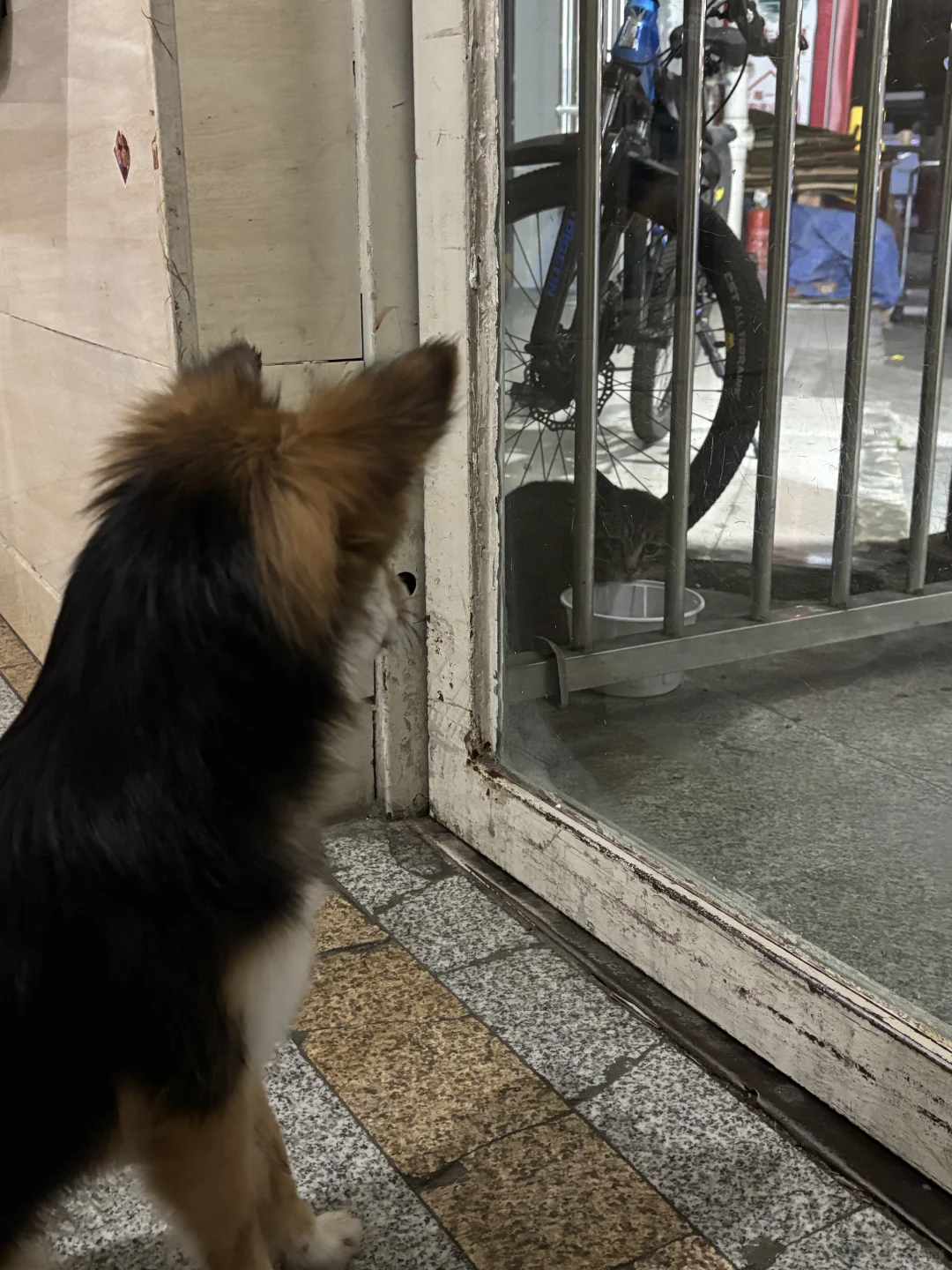 小黑跃跃欲试,贴着玻璃门左跳又蹦随时准备攻击人家。我没有开门,等狸花猫吃饱喝足走了才把门打开。小黑冲出去气的冲着猫离开的方向吠叫好几声。(图八、九)