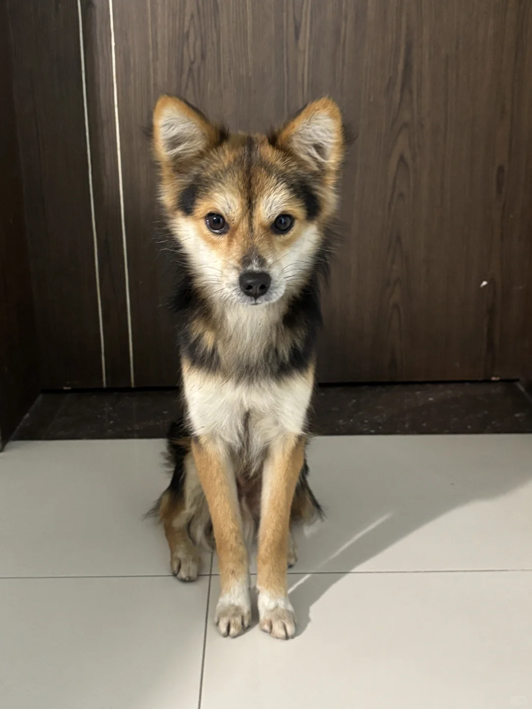 今天我给小黑上楼洗了澡,他很不高兴,眼睛都变成三角形了。