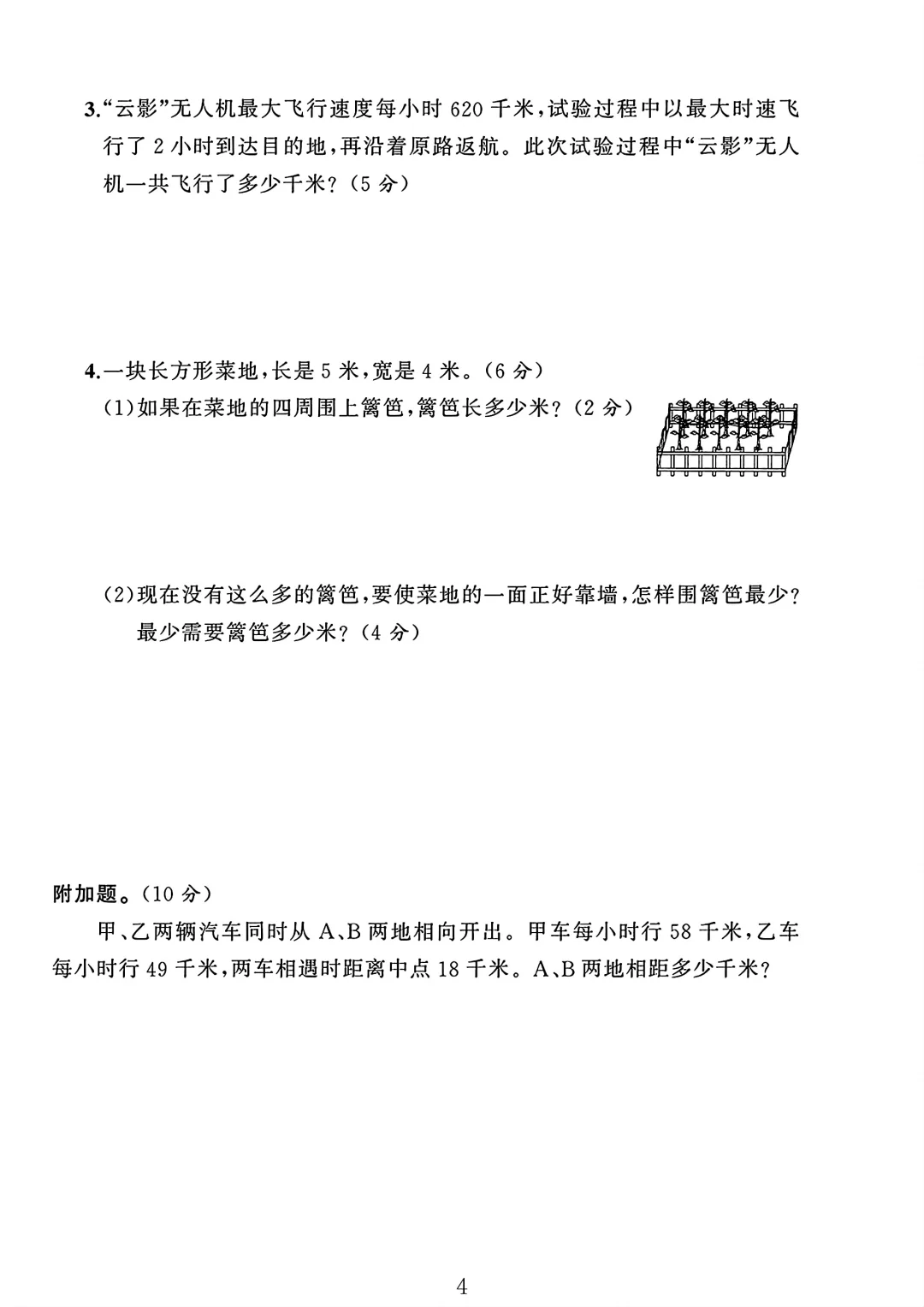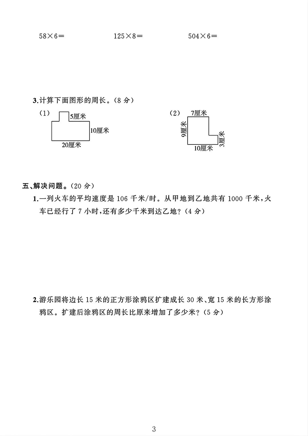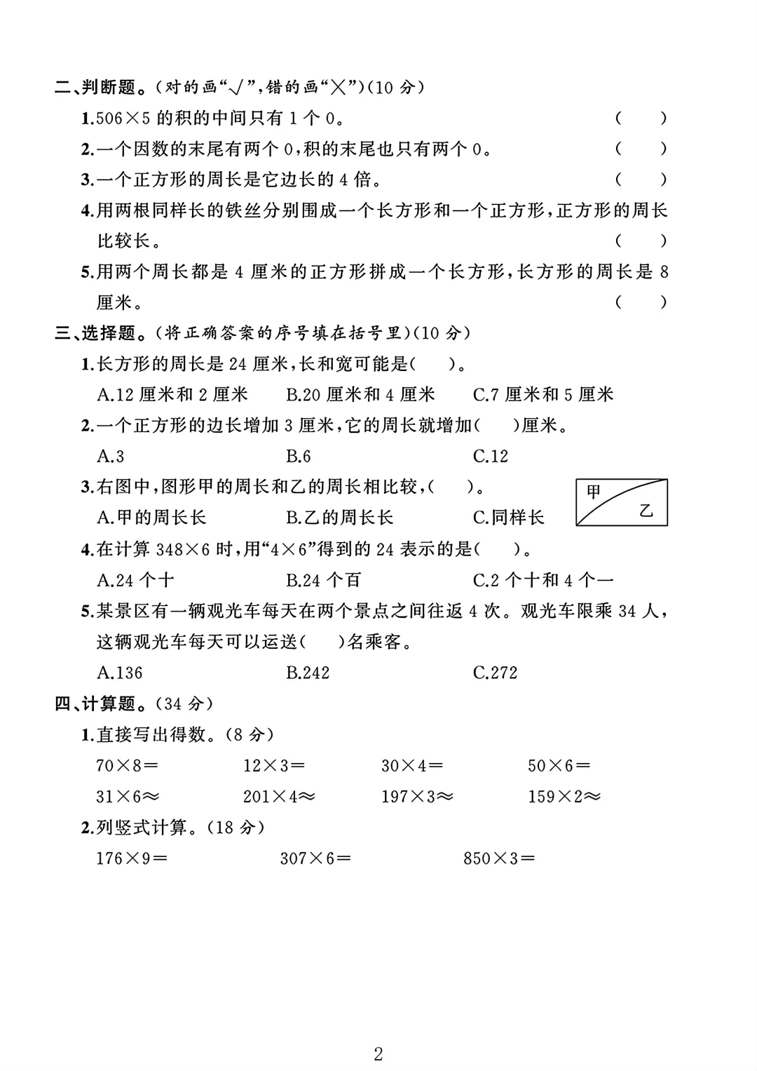 人教版 三年级上册数学 月考 试卷 第二次月考 电子版可打印