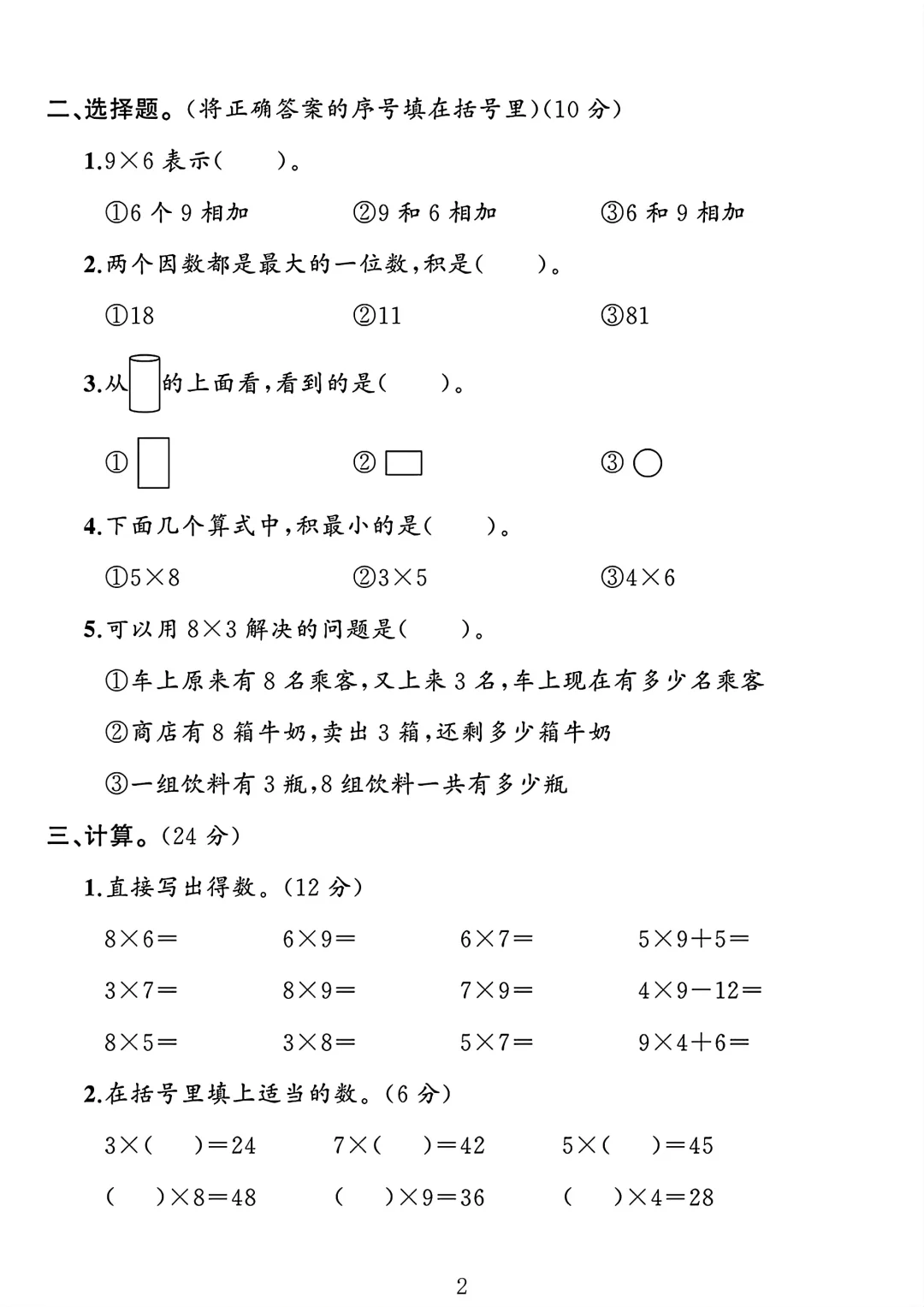 人教版 二年级上册数学 月考 第二次月考 试卷 电子版可打印