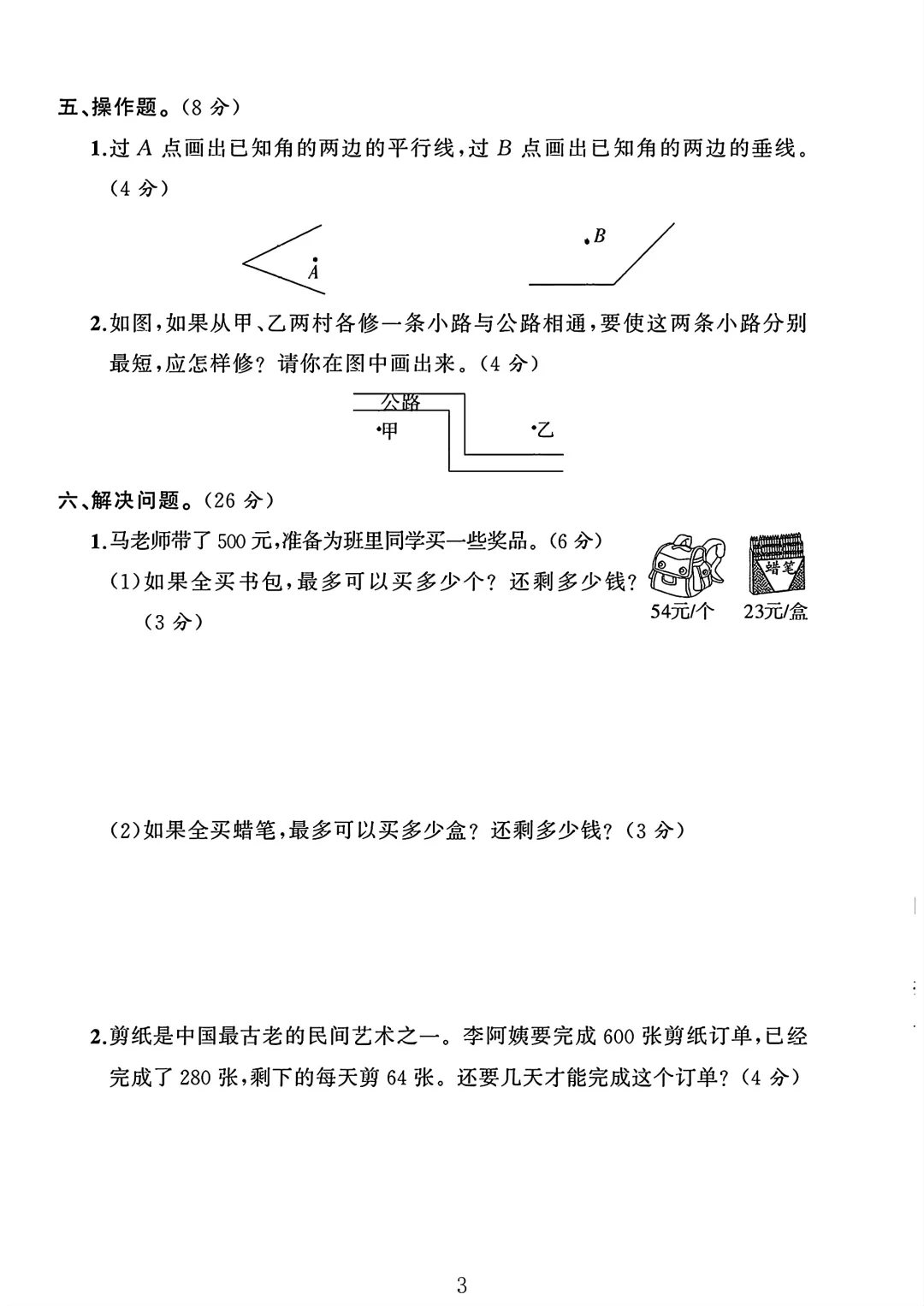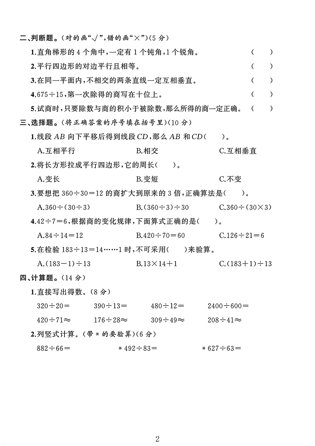 人教版 四年级上册数学 月考 第二月考 电子版可打印 试卷