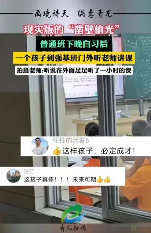 知耻而后勇!福建泉州,普通班晚自习后不回家,一男孩竟在强基班窗外偷偷听课,站了1小时却不知疲倦! 我曾以为,在这个被手机支配的时代,年轻人的眼睛里只会闪烁着屏幕的光。 直到我在泉州的一所中学看到了另一种光,那是从教学楼的窗户里透出来的,明亮而温暖,照在一个少年的脸上。 他叫小陈,是普通班的学生,此刻正站在强基班的窗外,像一尊雕像般一动不动。 或许从小陈第一次被分到普通班的那天起,他的心就像被什么东西啃噬着。 他清楚地知道,自己和强基班的距离,不仅仅是几个教室的距离,更是一道看不见的鸿沟。 每当放学后经过强基班,听到里面传来朗朗的读书声,他的心就像被针扎了一样。 他知道自己不比别人笨,只是起点慢了一些,少走了一些路。 于是在晚自习结束后,当其他同学急着往校门口跑时,小陈却放慢了脚步。 他站在强基班的窗外,起初是犹豫的,怕被人发现,怕被人笑话。 但当老师激情洋溢的讲解传入耳中时,他就像被施了魔法一样,再也挪不开脚步。 那一刻,他感觉自己不是在偷听,而是在汲取养分,就像沙漠里的植物终于找到了水源。 每个夜晚,他都会准时出现在这个位置。 即便双腿发酸,即便冷风吹来,他依然纹丝不动。 老师讲的每一个知识点,他都努力记在心里,生怕漏掉任何一个细节。 在这一个小时里,他不是普通班的学生,而是追梦的少年。 随着夜色渐浓,教室里的灯光愈发明亮,映照着窗外少年专注的面庞。 这一幕恰好被一位老师看到,内心震撼之余,将这个感人的画面分享到了网络上。 这个不甘平凡的故事很快引起了广泛关注,有人称赞他的毅力,也有人质疑这样做的价值。 但对小陈来说,能多学习一会儿,就是最大的奢侈,因为他知道,知识就是改变命运的钥匙。 一个少年站在强基班的窗外,专注地"偷听"知识,这样的画面令人动容。 或许在不久的将来,他真能在强基班的教室里,看到这个渴望改变命运的身影。 这不仅仅是一个关于努力的故事,更折射出了如今教育资源分配不均的现实问题,但这个倔强的少年用行动告诉我们:命运是可以被书写的。