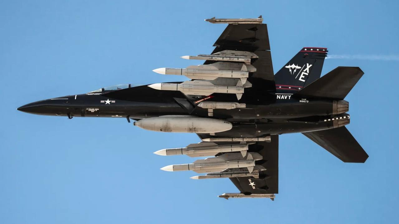 美国海军航空兵“(超级)大黄蜂”战斗机最强空战配置是怎么样的?如图所示,这就是有史以来这款战机空战能力最强的状态。 图中这架战斗机喷涂有独特的黑色复古涂装,表明飞机隶属于著名的VX-9“吸血鬼”中队。这个中队由VX-5中队发展而来,驻扎在加州的中国湖武器实验基地。战斗机挂载了九枚导弹,再加上假设的满载机炮炮弹,飞机的载重远超7.2吨。 这些武器分别是四枚AIM-174B超远程空空弹(图中最大尺寸的导弹)、三枚没有安装稳定翼的AIM-120中距弹和两枚AIM-9X近距空空弹。除此以外,飞机中线挂架的副油箱很特别,头部带有红外传感器,左侧进气道挂架还有ATFLIR吊舱,这些都可以为空战做辅助。 国外杂志的评论员认为,AIM-174B导弹的出现主要是为了针对中国。