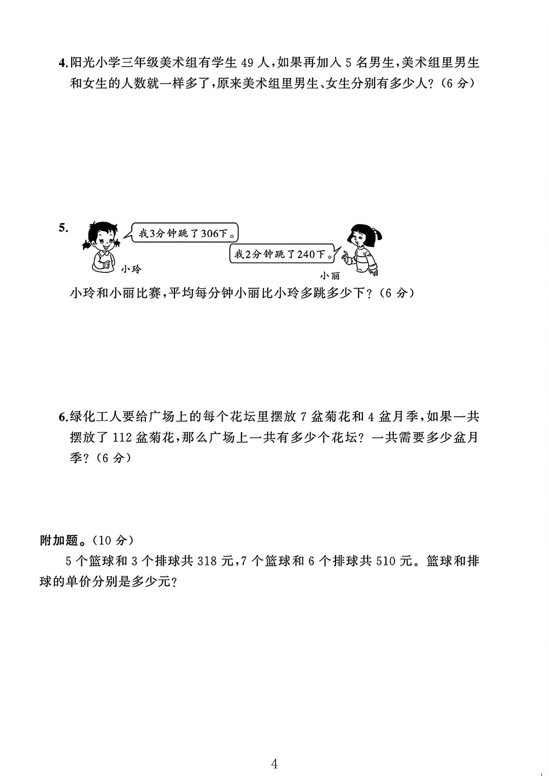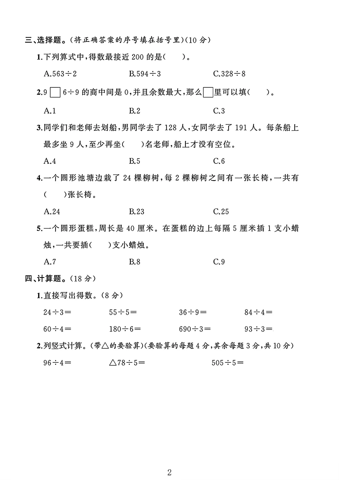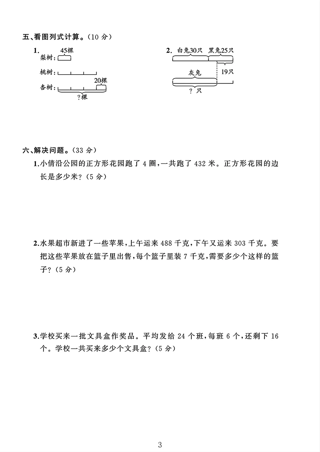 苏教版 三年级上册数学 月考 月考试卷 电子版可打印 测试卷