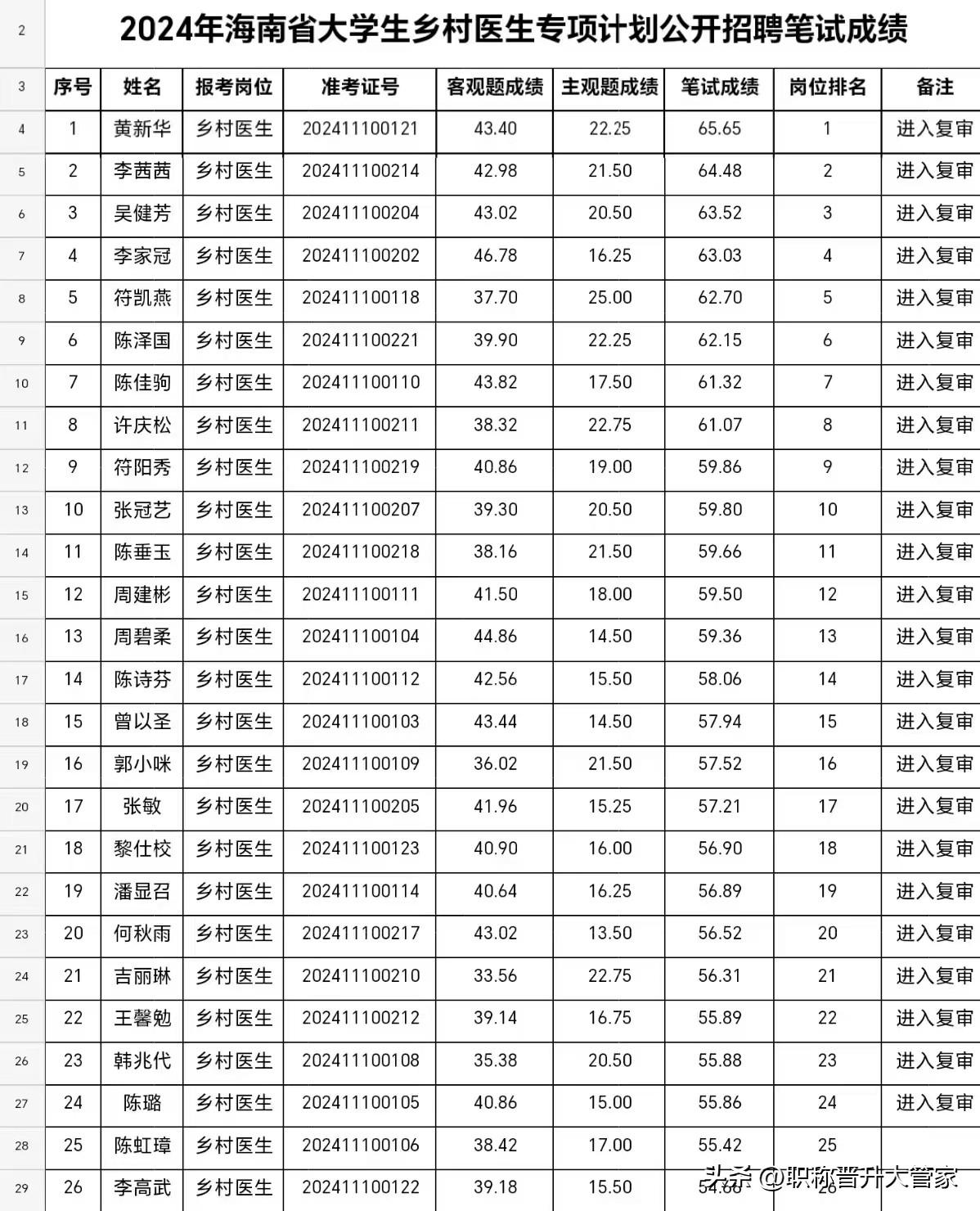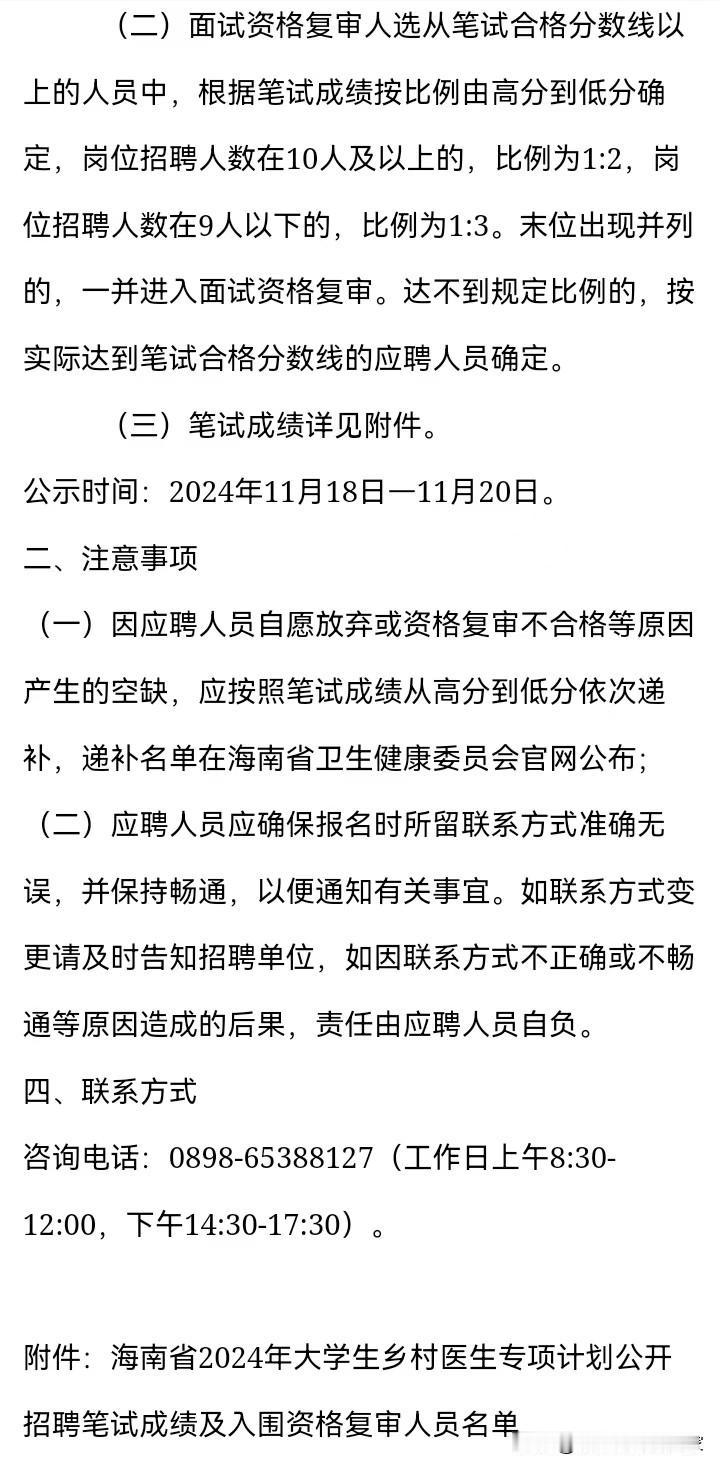 2024年海南省大学生乡村医生专项计划公开招聘笔试成绩及相关事宜公告已发布!合格