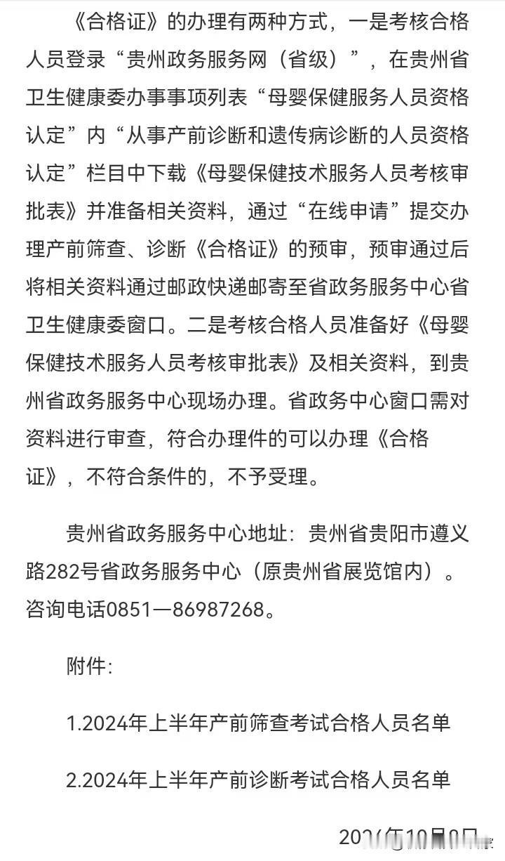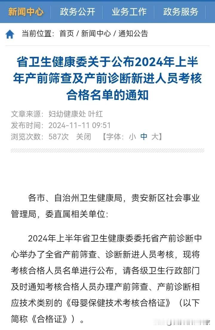 贵州省2024年上半年产前筛查及产前诊断新进人员考核合格名单已发布!快看看有您的《合格证》吗?