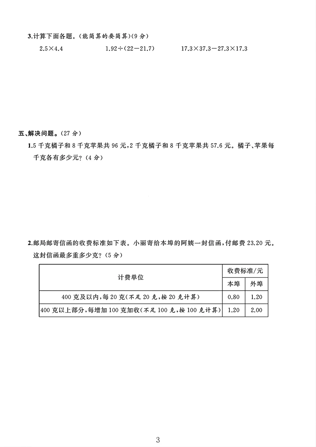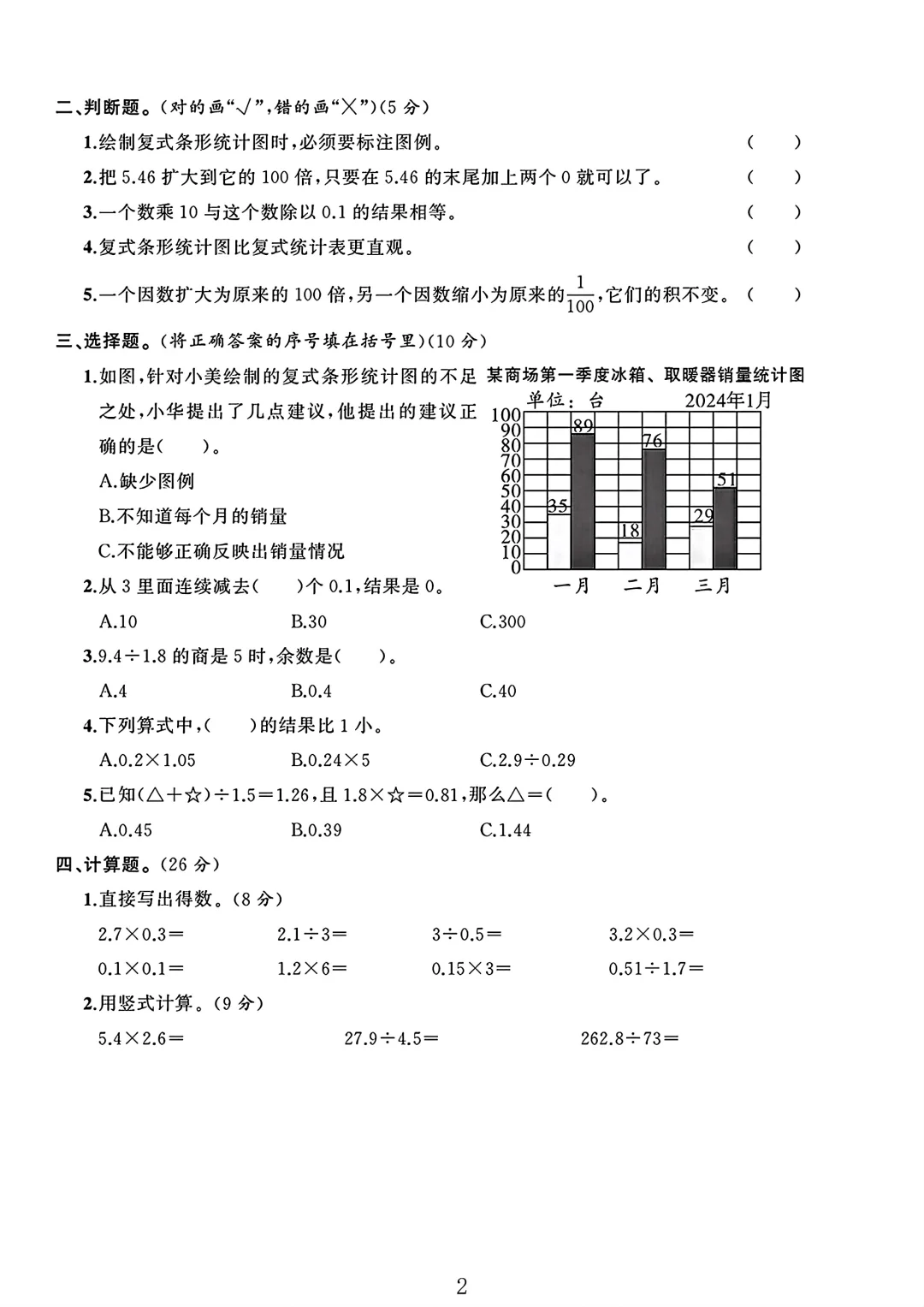 苏教版 五年级上册数学 月考 第二次月考 电子版可打印 单元测试
