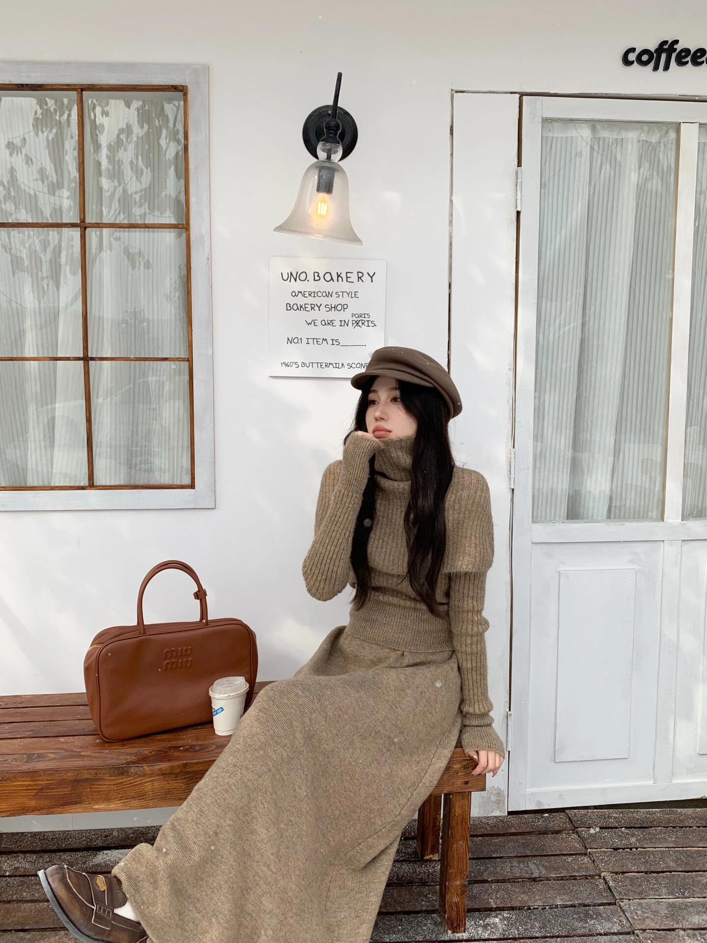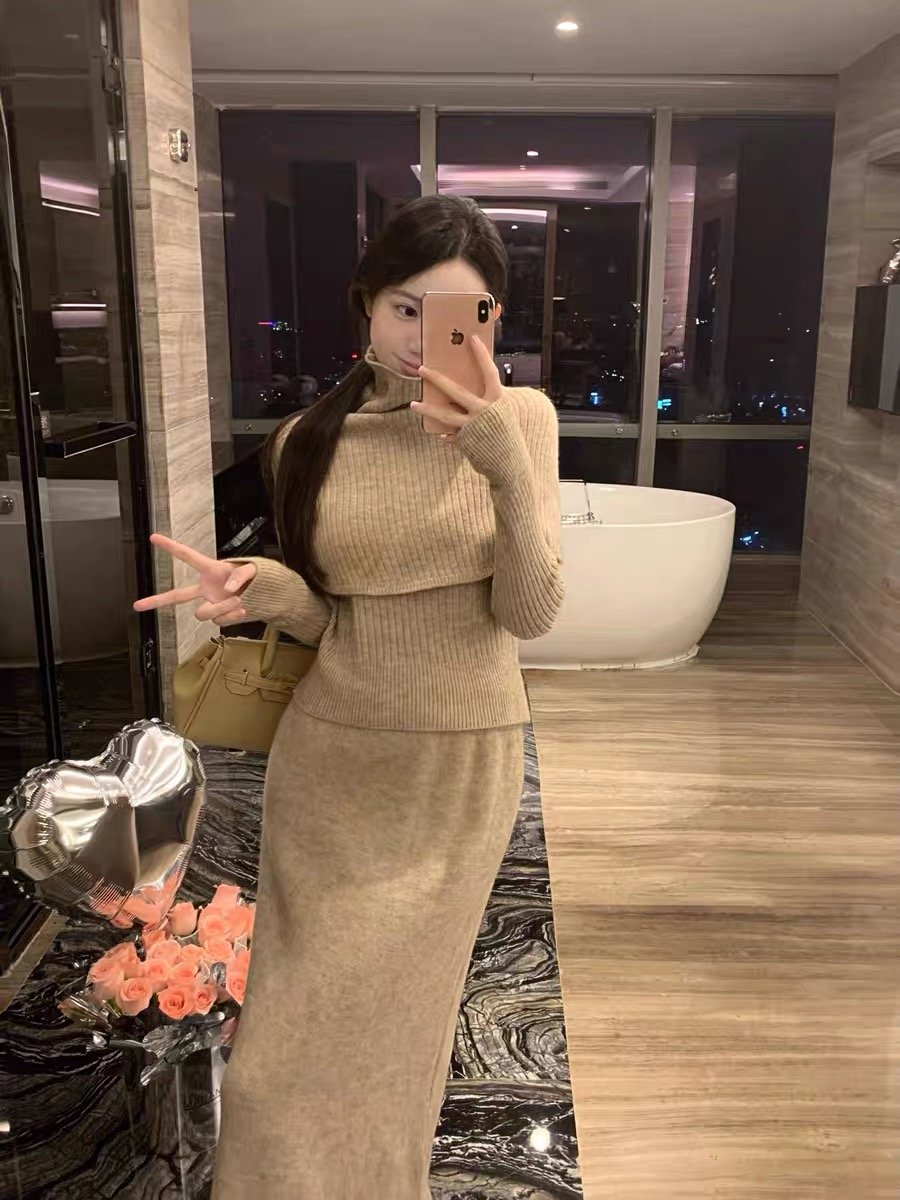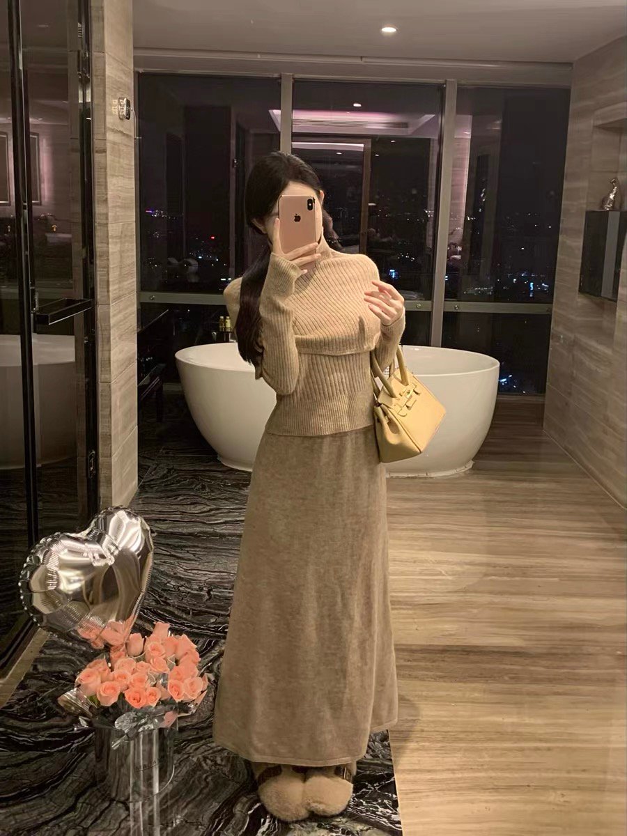 2024秋冬新款高领针织毛衣披肩连衣裙子法式配大衣长裙一整套装女