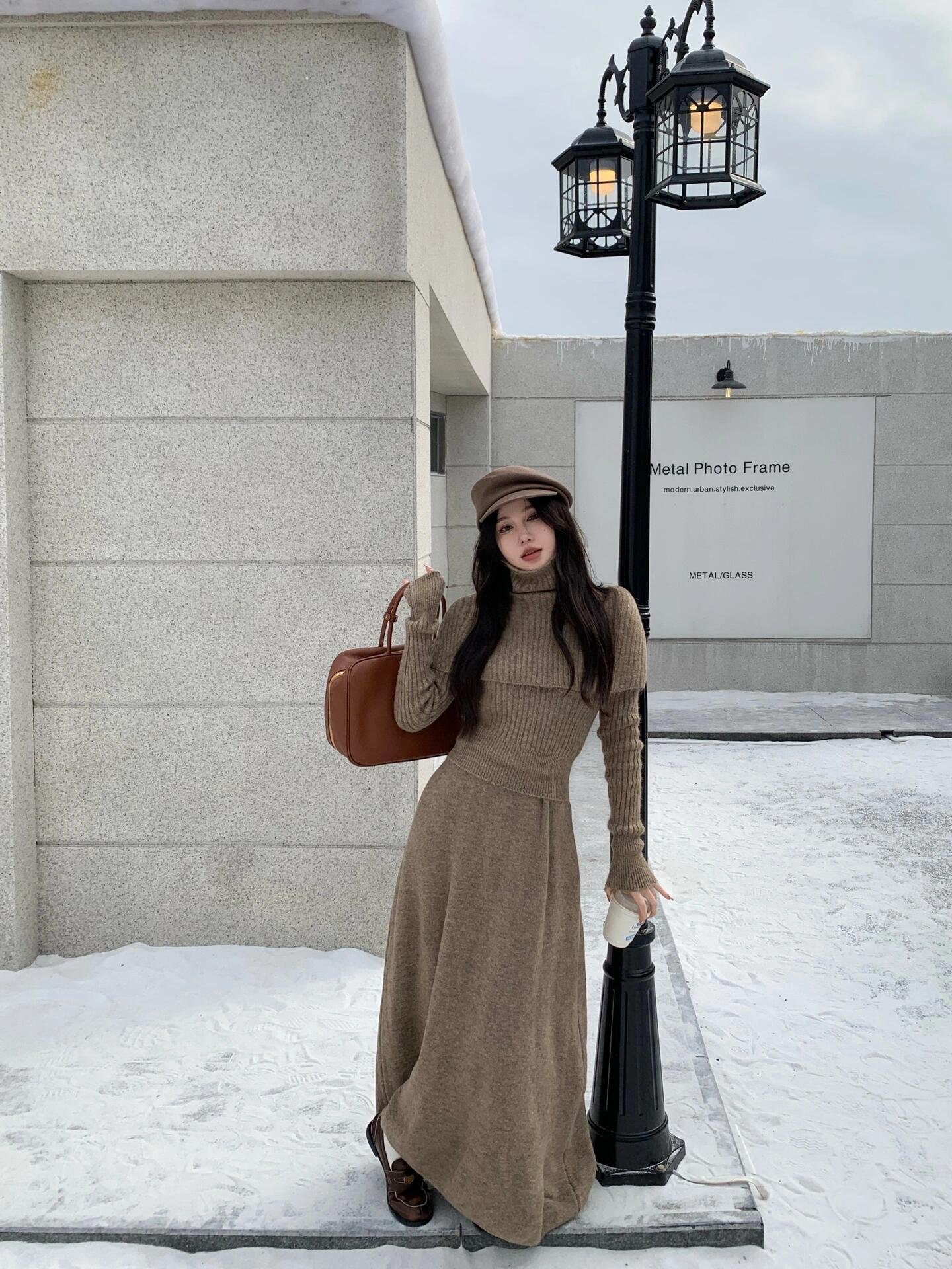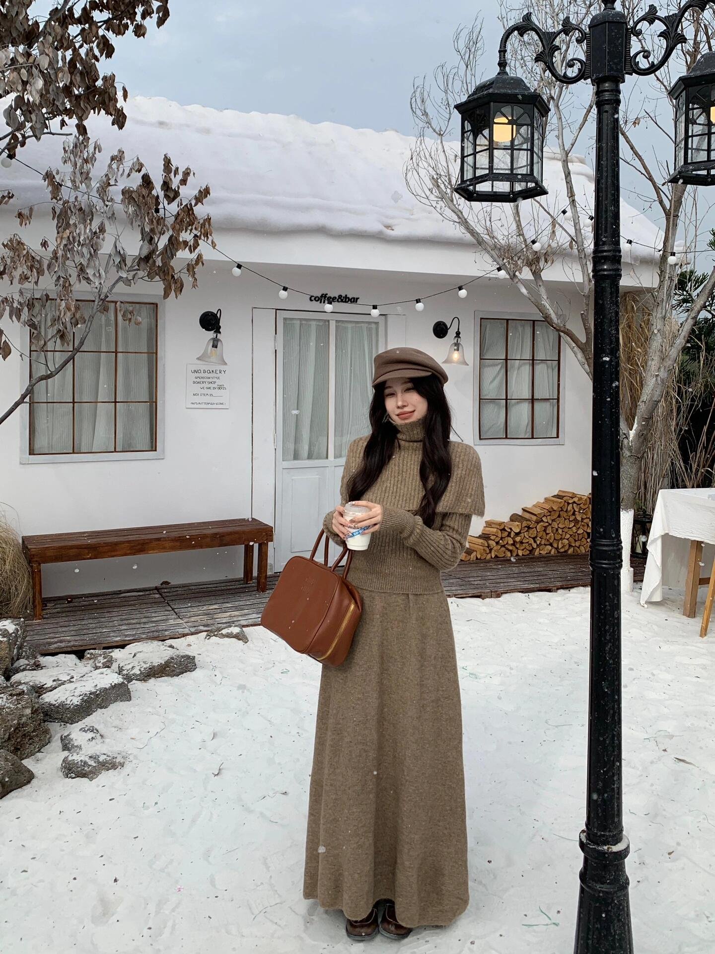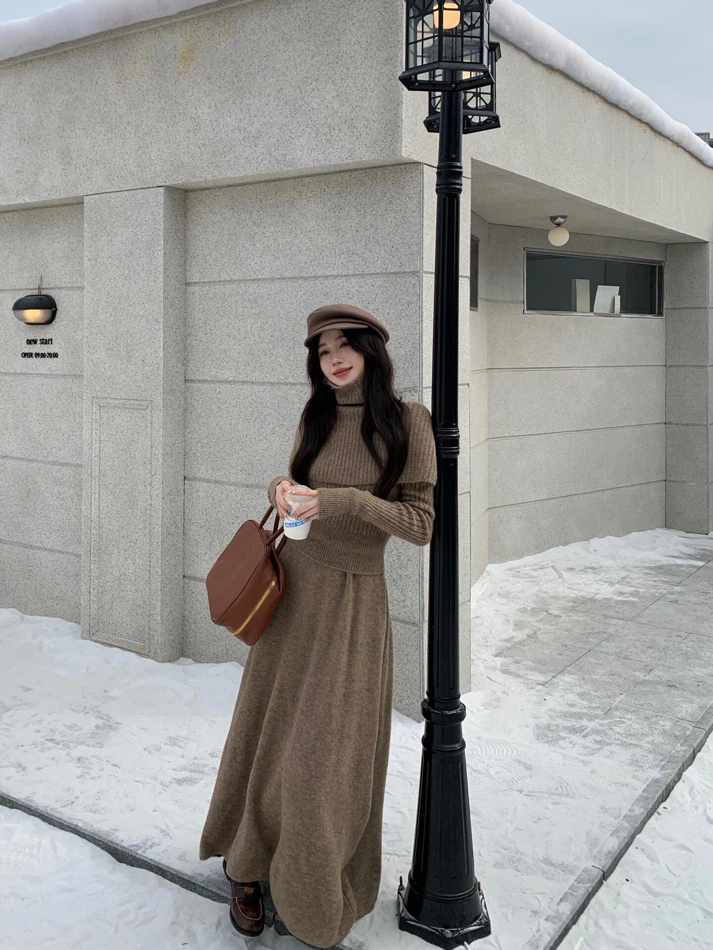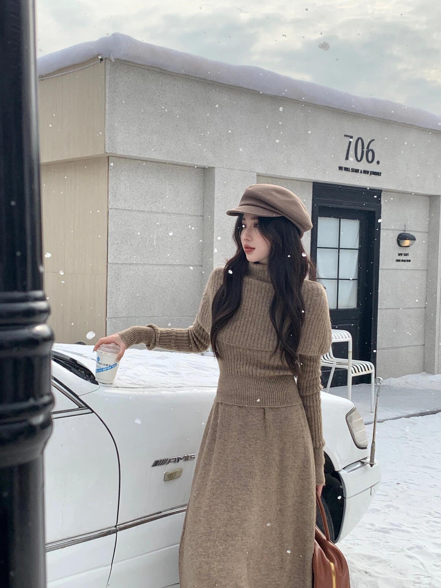 高领针织毛衣披肩连衣裙配大衣长裙一整套装