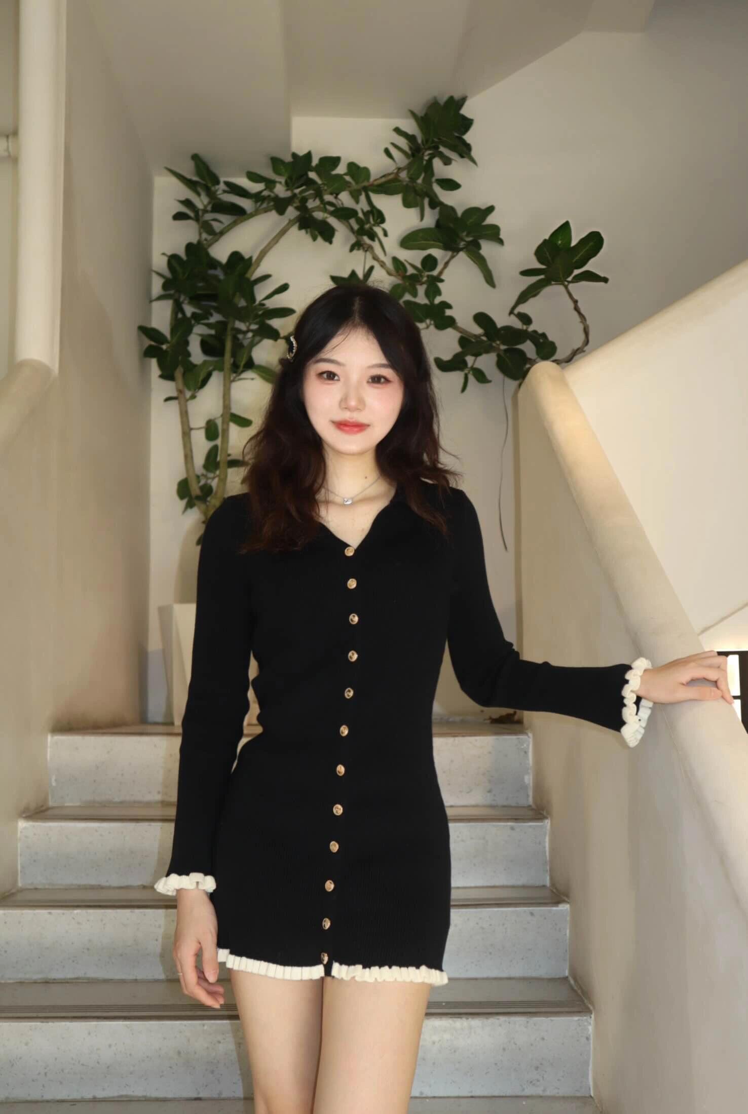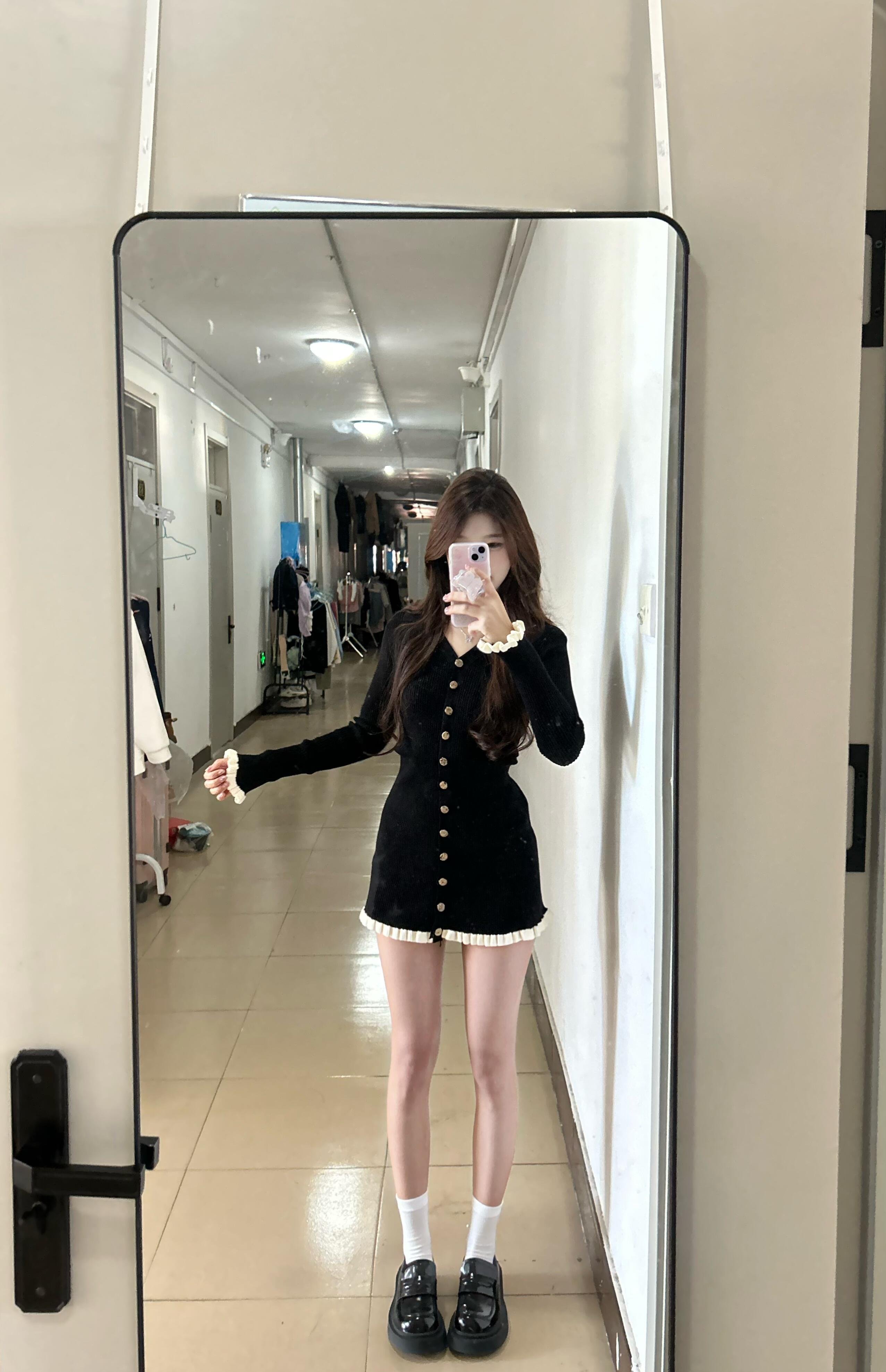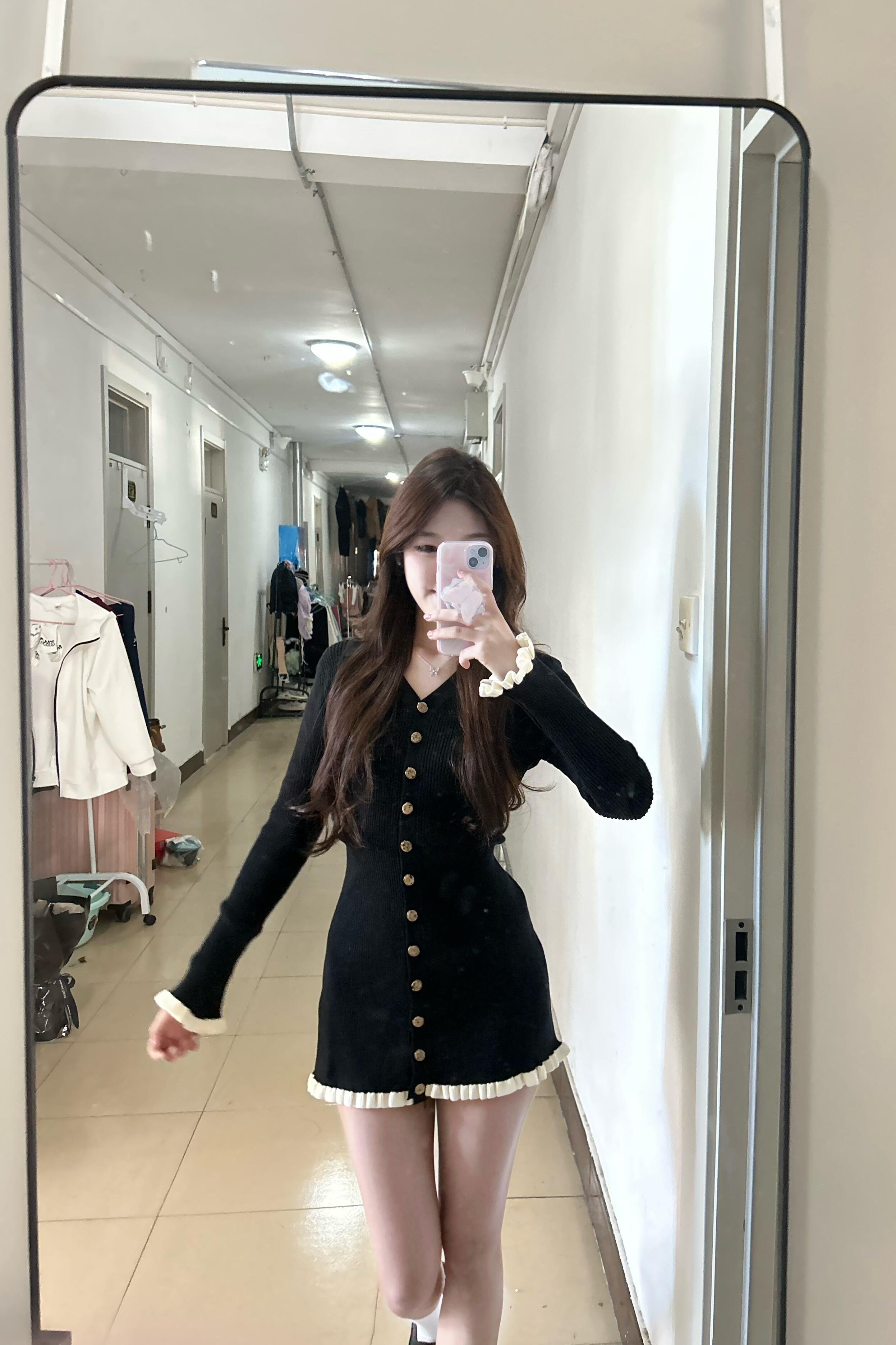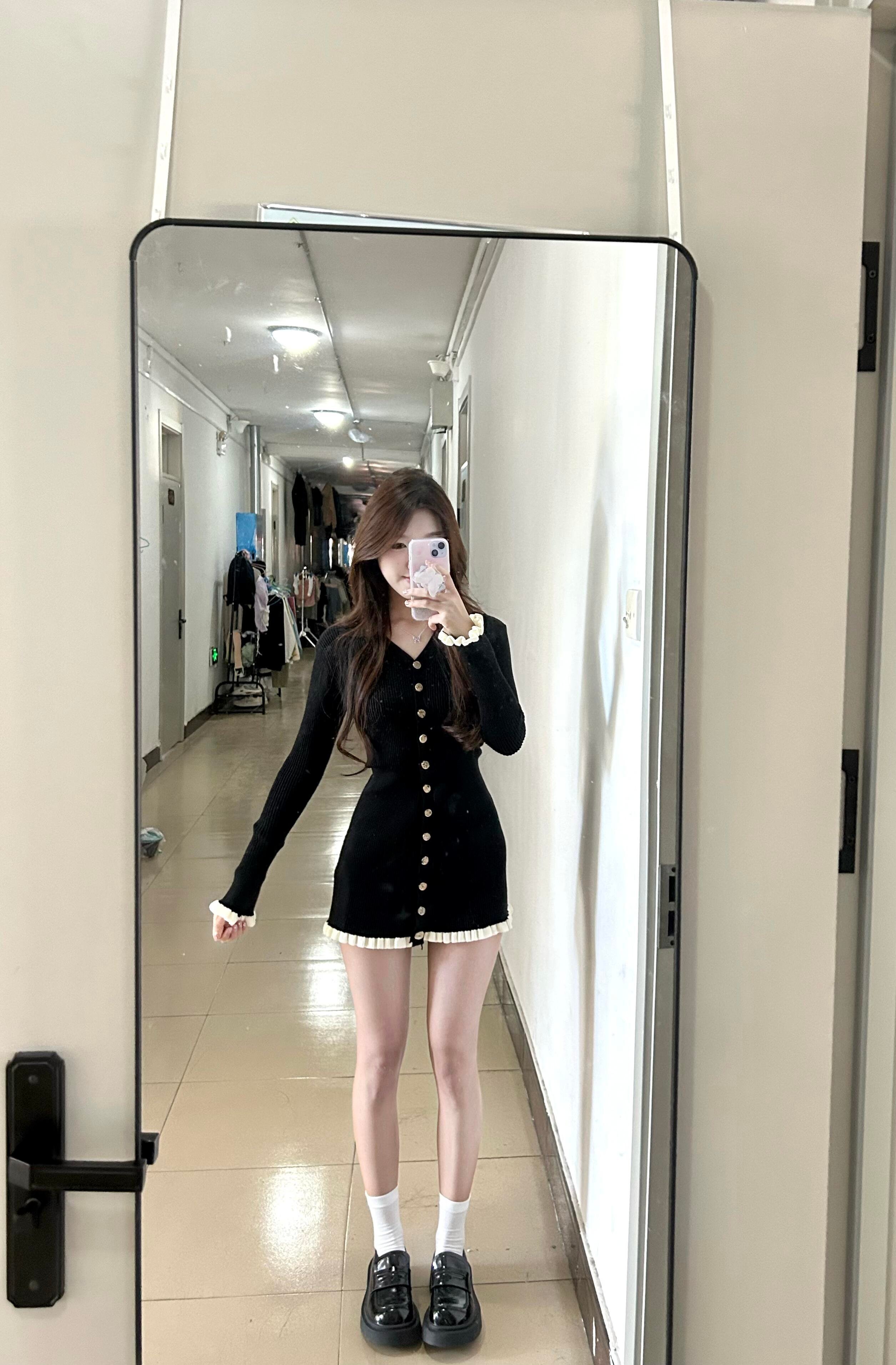 v领黑色内搭针织连衣裙法式打底配大衣短裙
