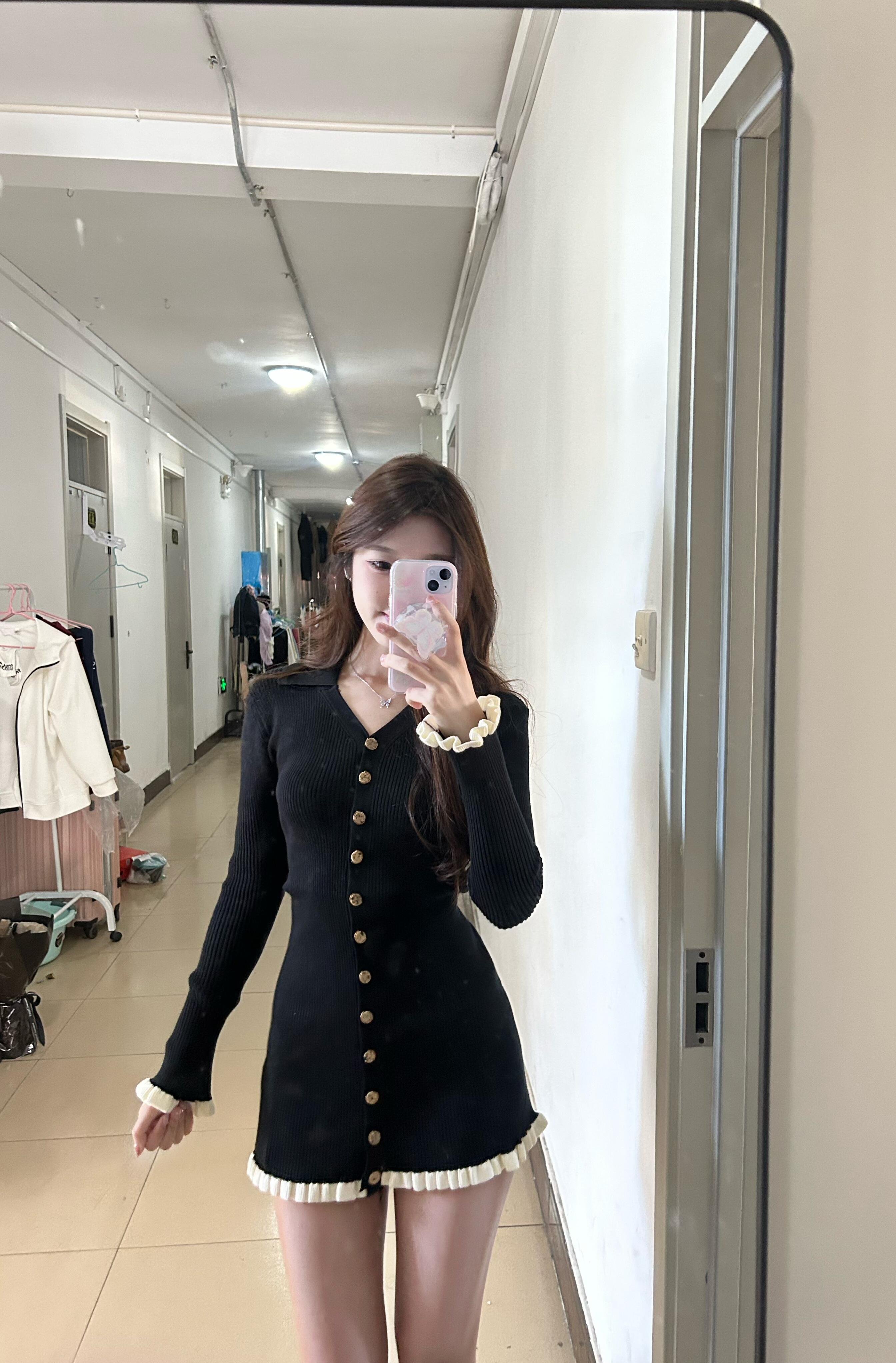 2024秋冬新款v领黑色内搭针织连衣裙子女法式打底配大衣短裙穿搭
