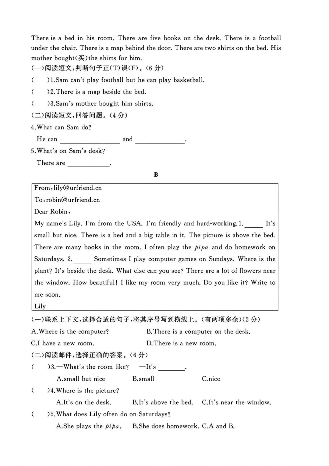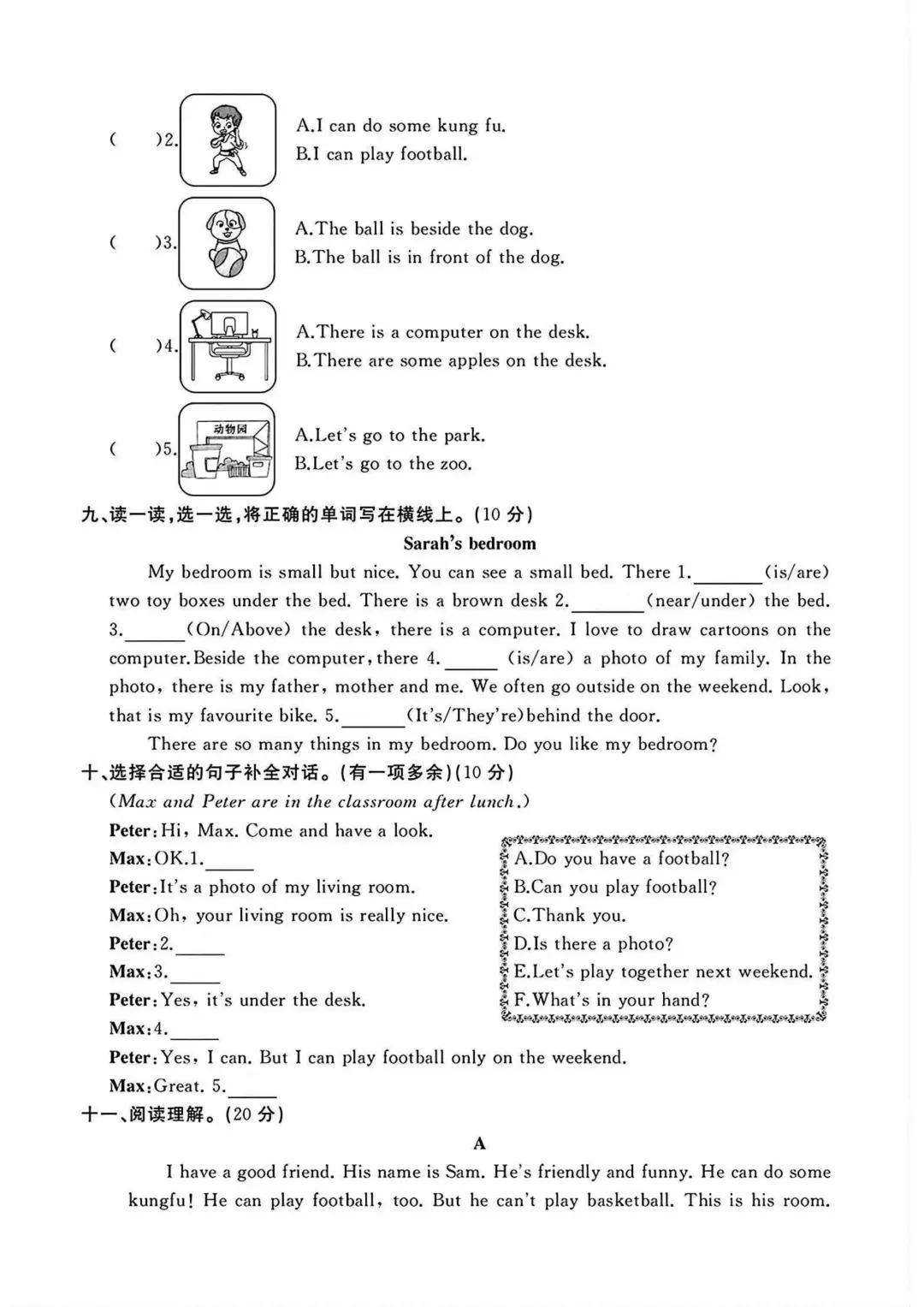 人教版五年级英语上册第二次月考卷