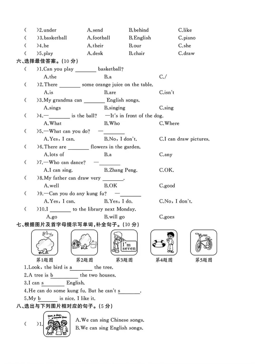 人教版 五年级上册英语 月考 第二次月考 电子版可打印 单元测试
