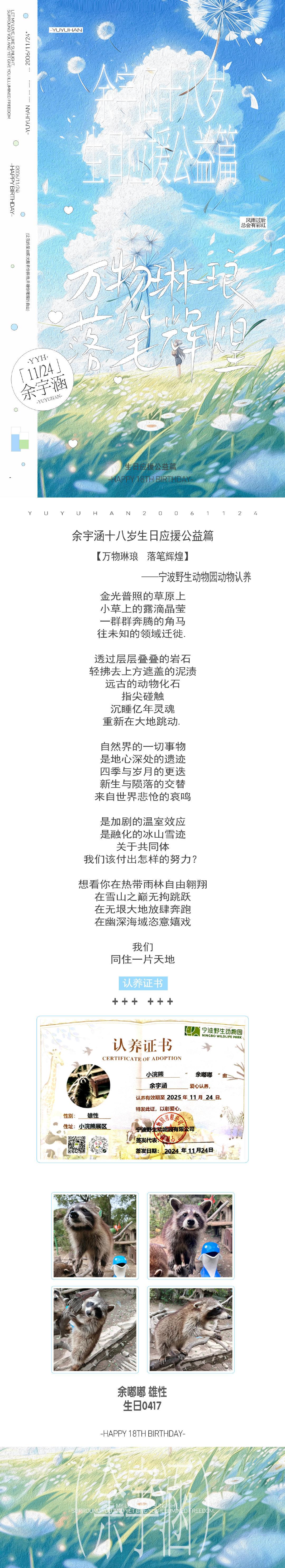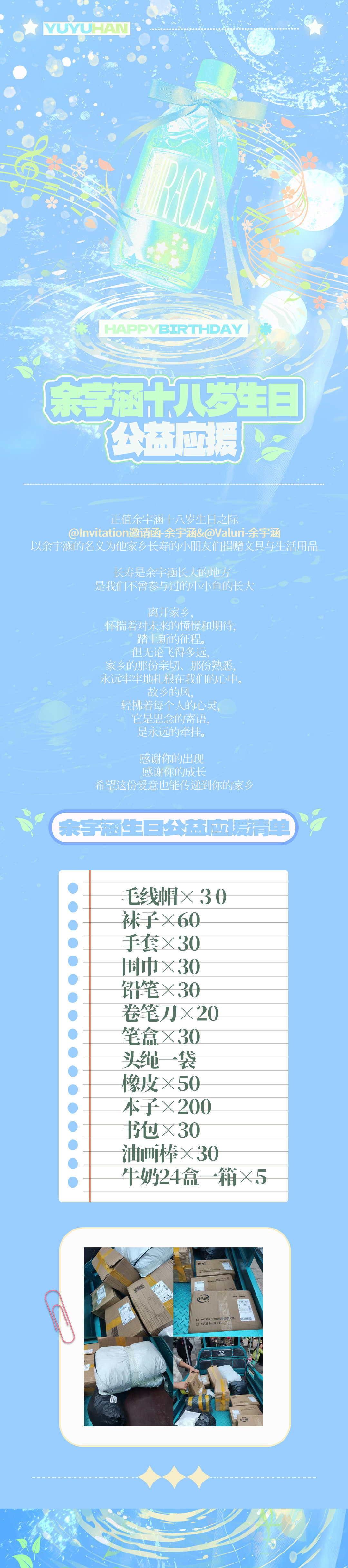 余宇涵生日粉丝做公益应援 余宇涵18岁生日快到啦,粉丝做了好多公益活动,正能量