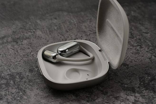 佩戴体验:开放式蓝牙耳机舒适吗,单耳5.1g,搭配云感 C 形桥设计适合长时间使用。外观上延续了交叠式造型,充电盒尺寸更小巧,采用微米级高精度工艺,表面纹理细腻且防污,不过盒盖开合阻尼略紧,单手操作时不太方便。