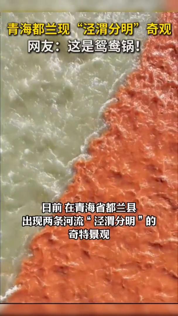 青海都兰现"泾渭分明"奇观。网友:这是鸳鸯锅! 日前在青海省都兰县出现两条河流"泾渭分明"的奇特景观。据了解清水河从青海省玛多县冬格措纳湖流入红水河,从都兰县巴隆乡阿拉克湖流入一清一红两股水流,呈"Y"字形交汇,相映成景奔向远方。