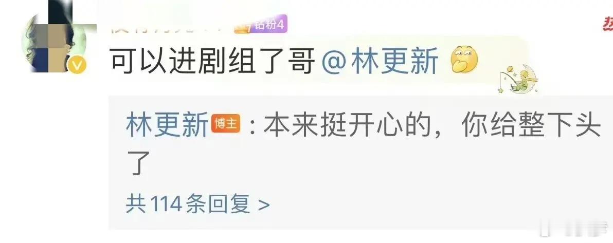 林更新发自己开心逛街,吃小摊的视频,粉丝看到后在评论区评论“该进组了”。他回复“