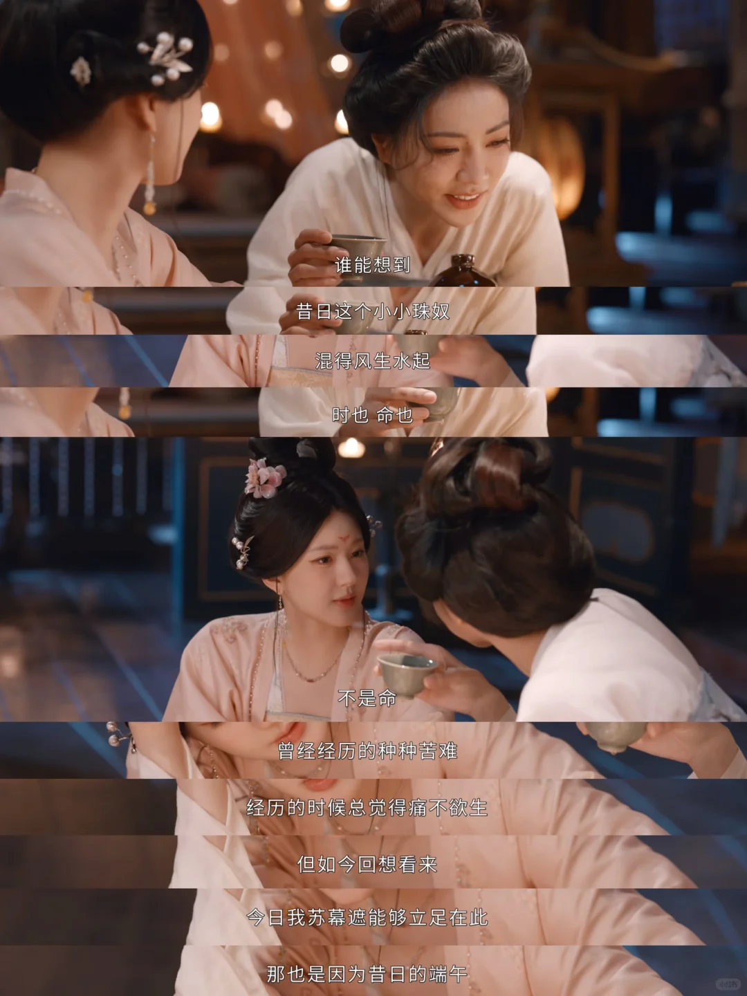 时过境迁,崔十九感慨苏幕遮从一个小小珠奴变成如今名声在望的苏掌柜,苏幕遮感谢当年经历种种苦难、痛不欲生的端午,是曾经的勇敢和坚持才有了今天,不是时和命。
