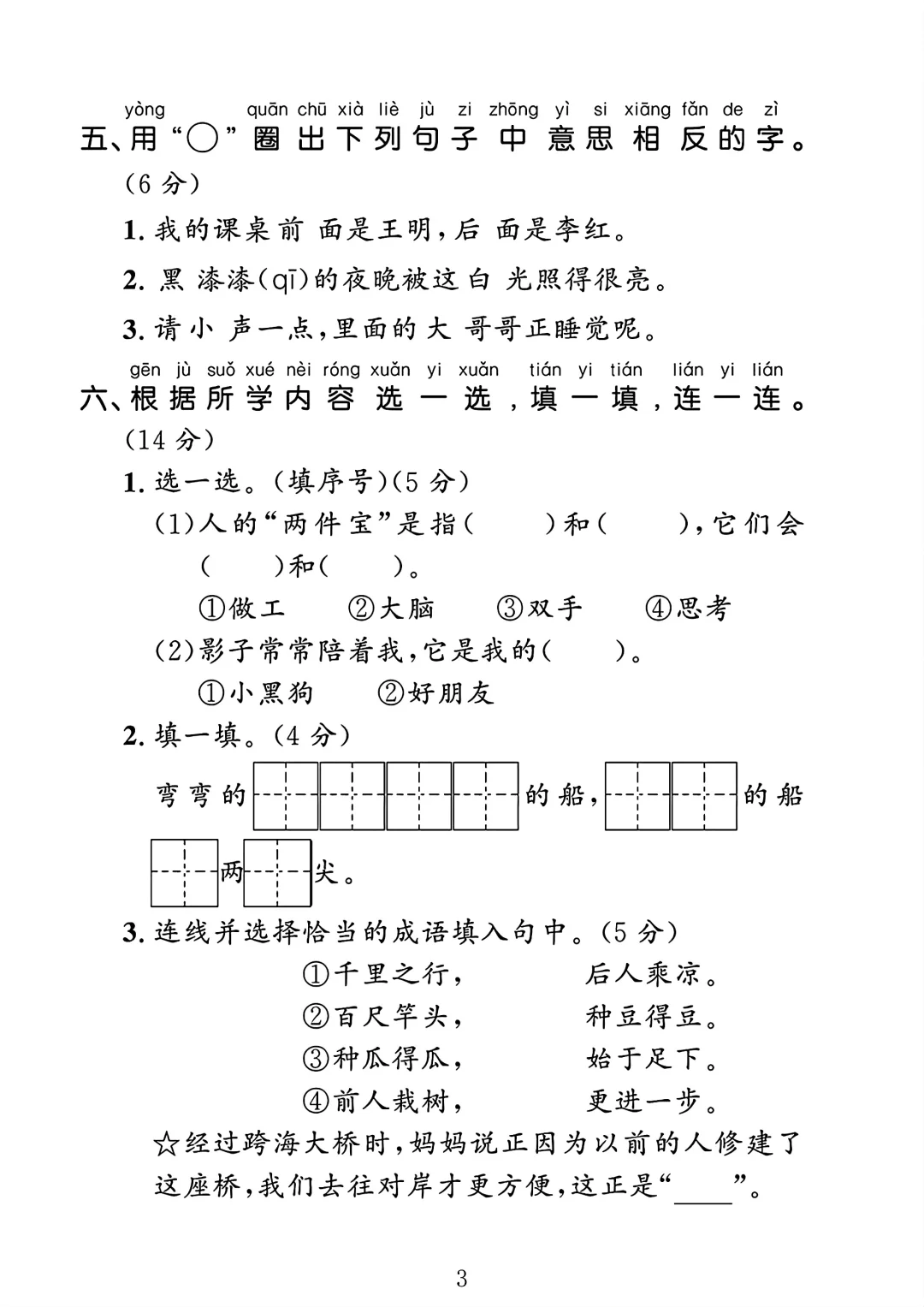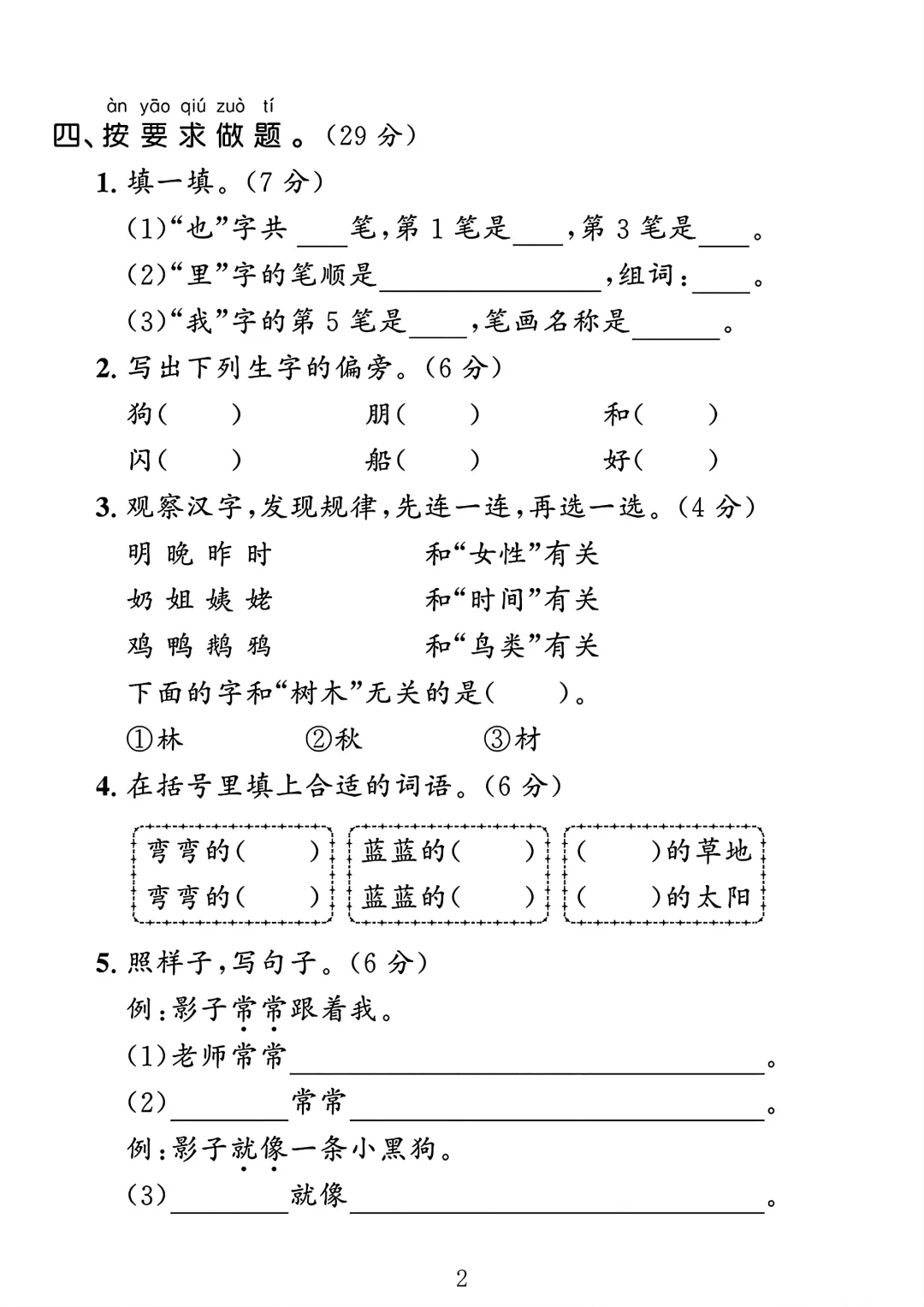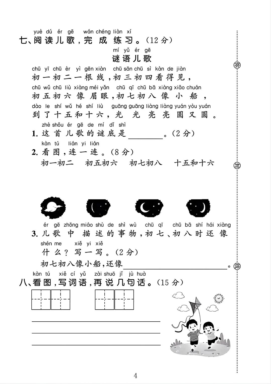 人教版 一年级上册语文 第七单元测试卷 单元测试 电子版可打印