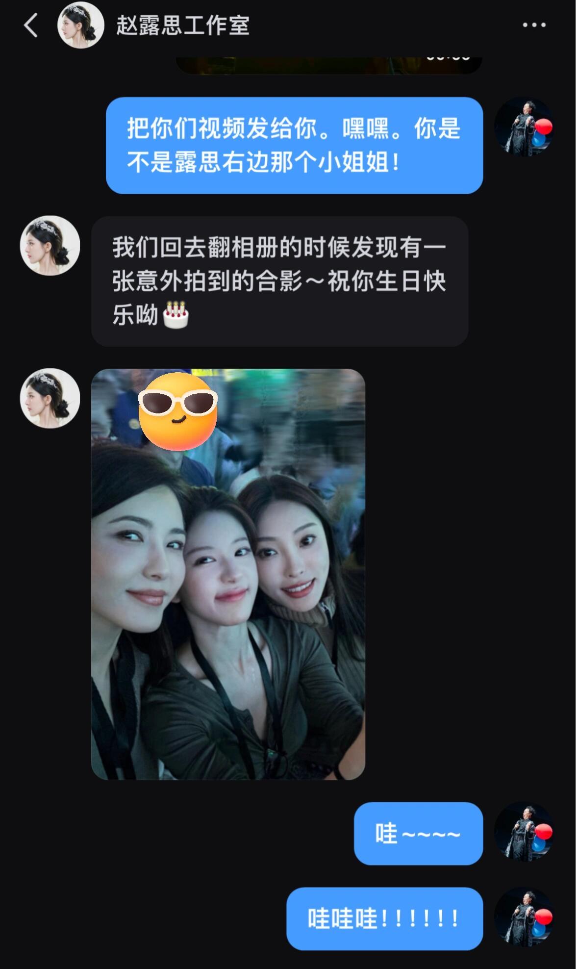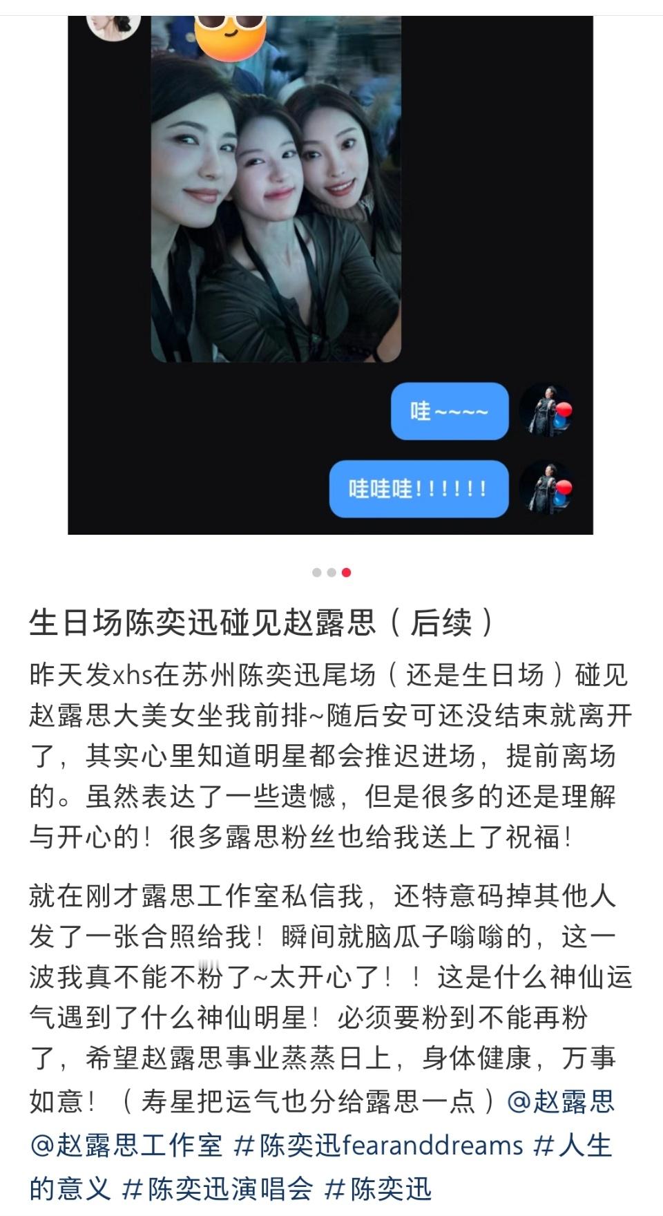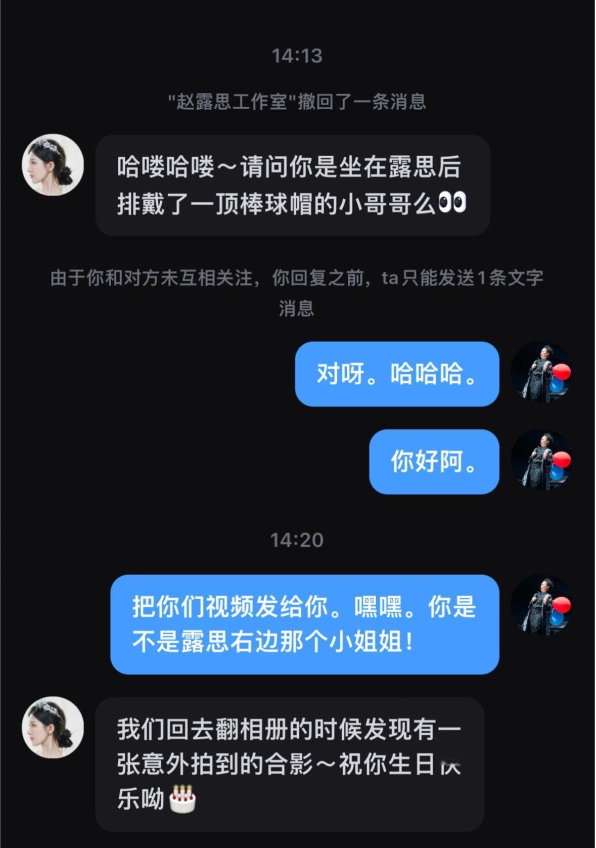 赵露思工作室给偶遇路人发合照 网友生日时看陈奕迅演唱会偶遇赵露思曾黎,赵露思工作室翻相册发现一张意外拍到的合影,特意找到他发给了他,还祝他生日快乐,好真诚的露思💜